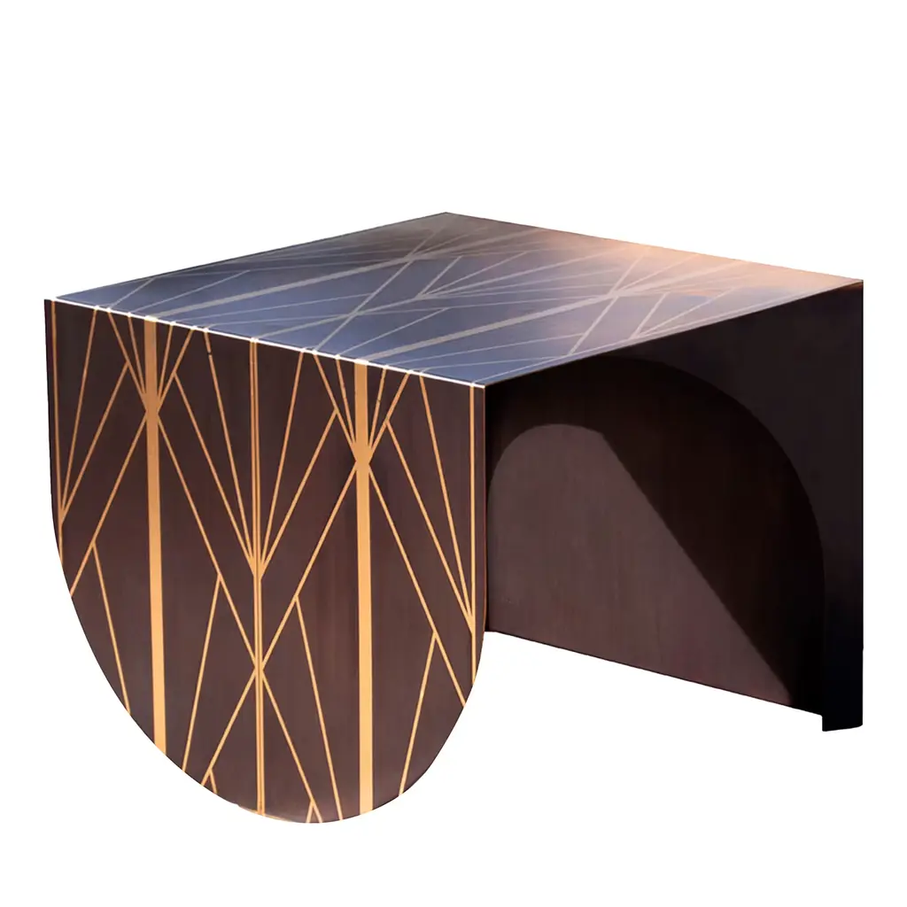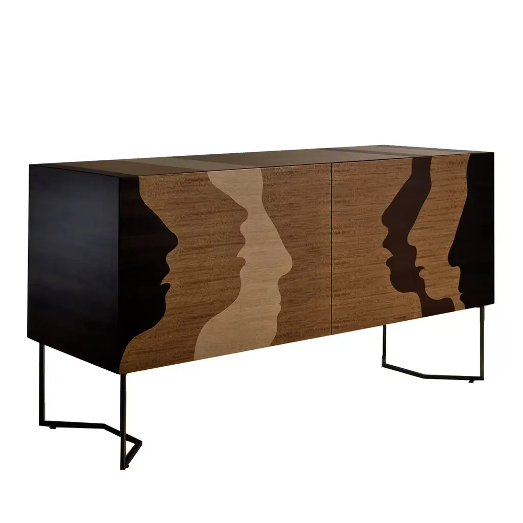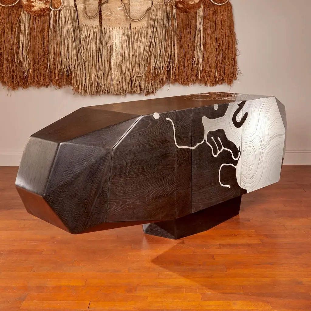 Exceptional "Thanarée" sideboard with 3 hidden doors in burnt wood and marquetry of stainless steel.Limited and signed piece by Erwan Boulloud.France, 2025