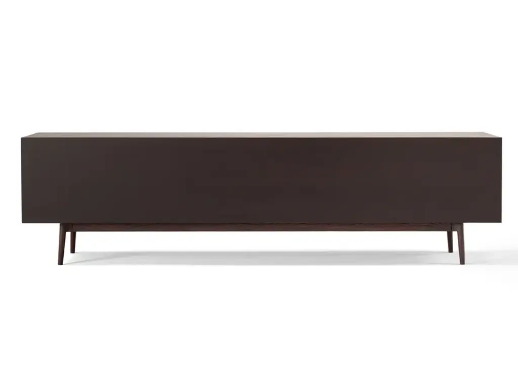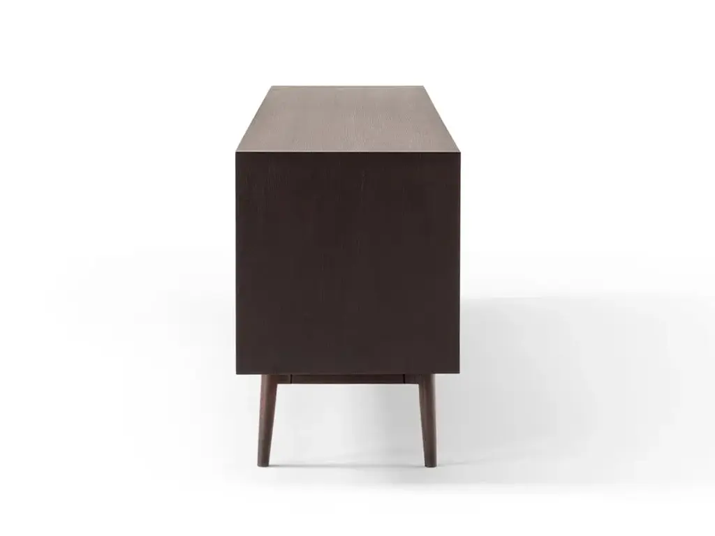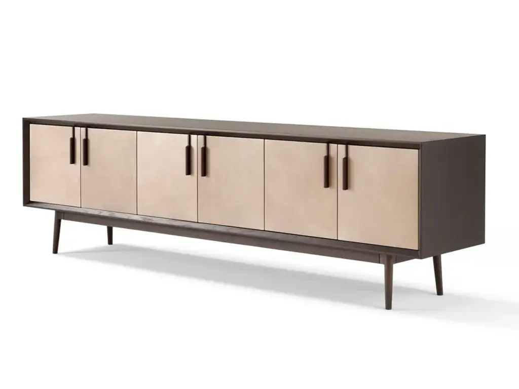 THEO is a modern take on a traditional furniture piece: the sideboard. The elegant wood container is enriched by a refined detail: the leather upholstery of the doors, available in glass too, themselves enhanced by the slender wood handles. The base itself, leaning on conical feet, is in wood as well. Sober and lean in its lines, THEO fits in any room, perfectly en pendant in a contemporary classic ambient: from a domestic living room, to hotels, from the boutique to the hall of an upmarket restaurant. STRUCTURE: wood SHELVES: metal and wood DOORS: wood, glass, leather and cuoio