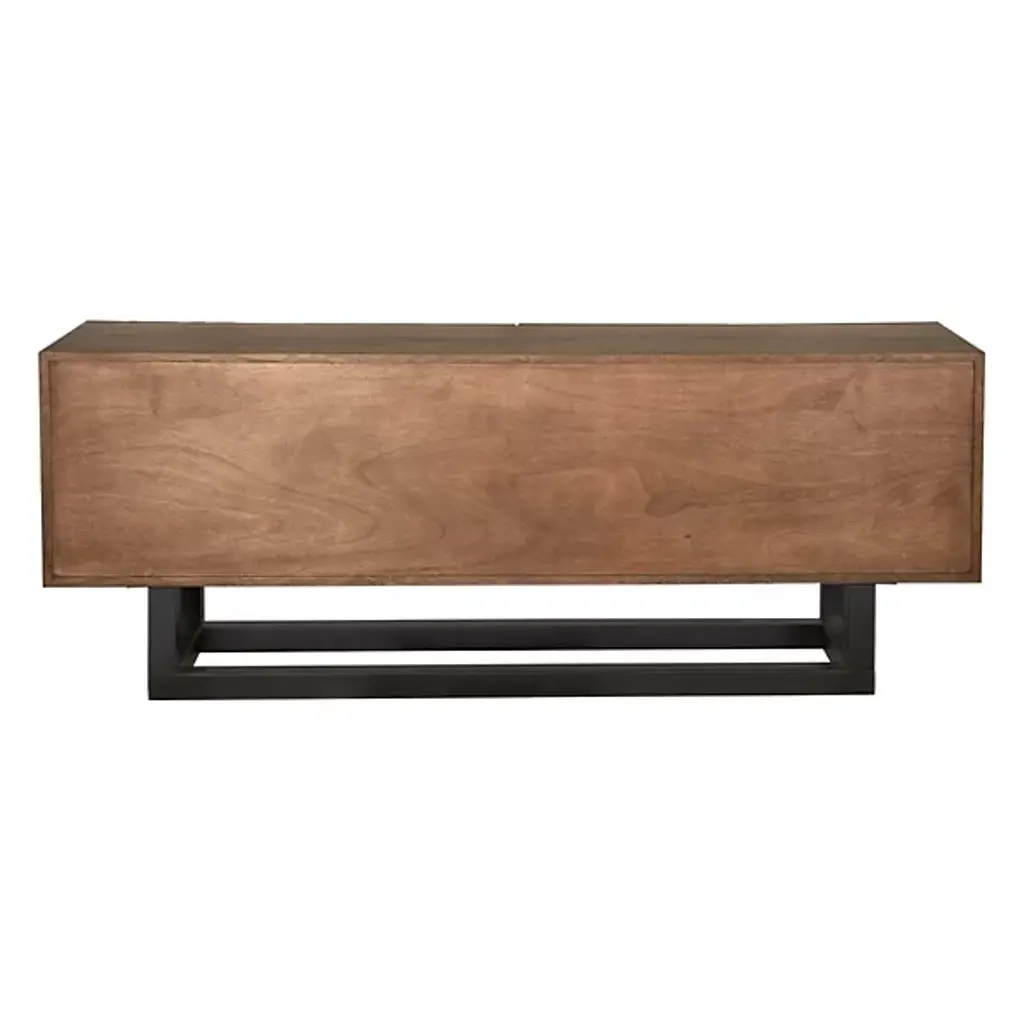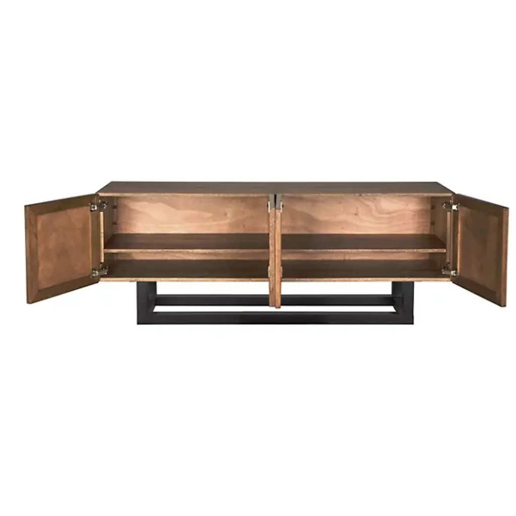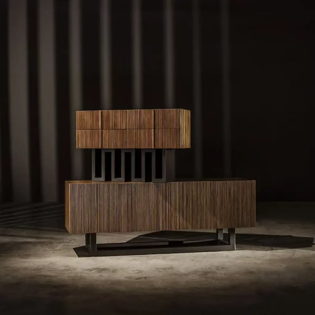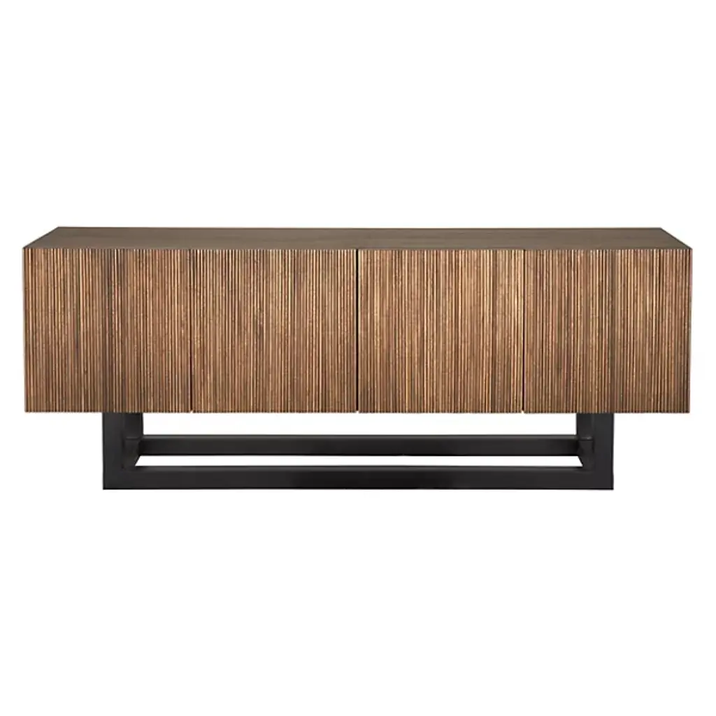 The Thomson Sideboard from Noir showcases fine vertical ribbing that covers the entire walnut facade in delicate linear patterns. The closely spaced grooves create subtle texture variations across the four-door surface, while the dark walnut finish enhances each ridge and valley. A sleek black steel base elevates the ribbed cabinet, creating visual separation between the detailed wood body and minimal metal support. The vertical detailing adds movement to the horizontal form, making this storage piece both textural and refined in its execution.