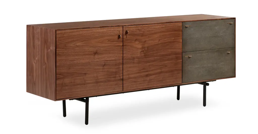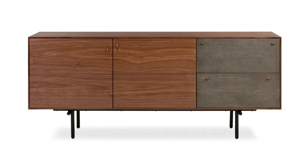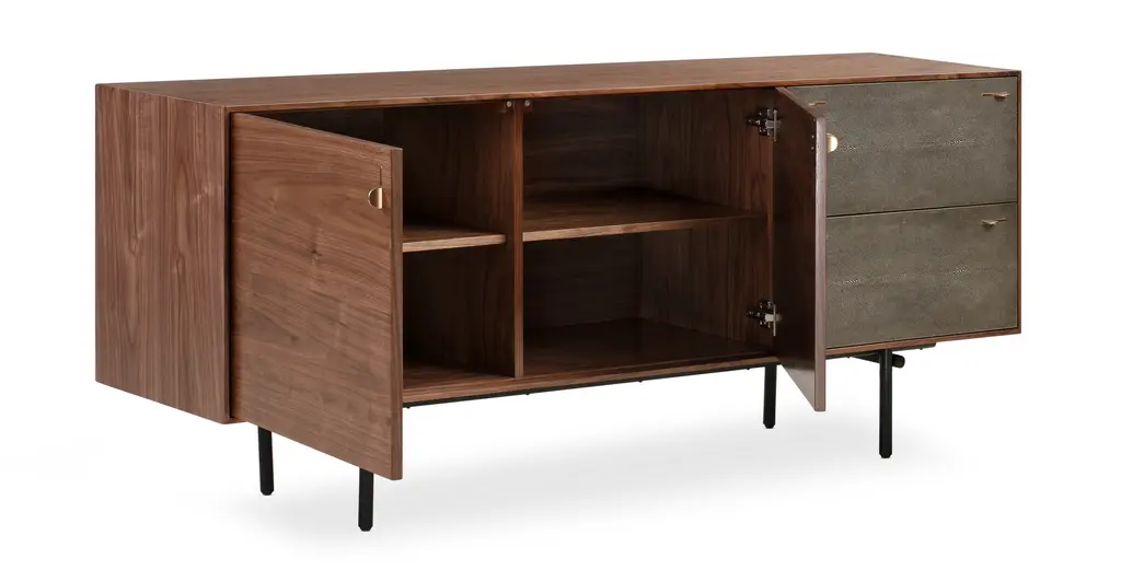 Brass forged handles and Shagreen wrapped doors. Talk about suited and booted. This modern credenza is ready to dazzle. Designed to blend contemporary good looks with easy practicality. The sideboard has plenty of space to stash with two doors, two removable shelves, and 2 soft close drawers.
