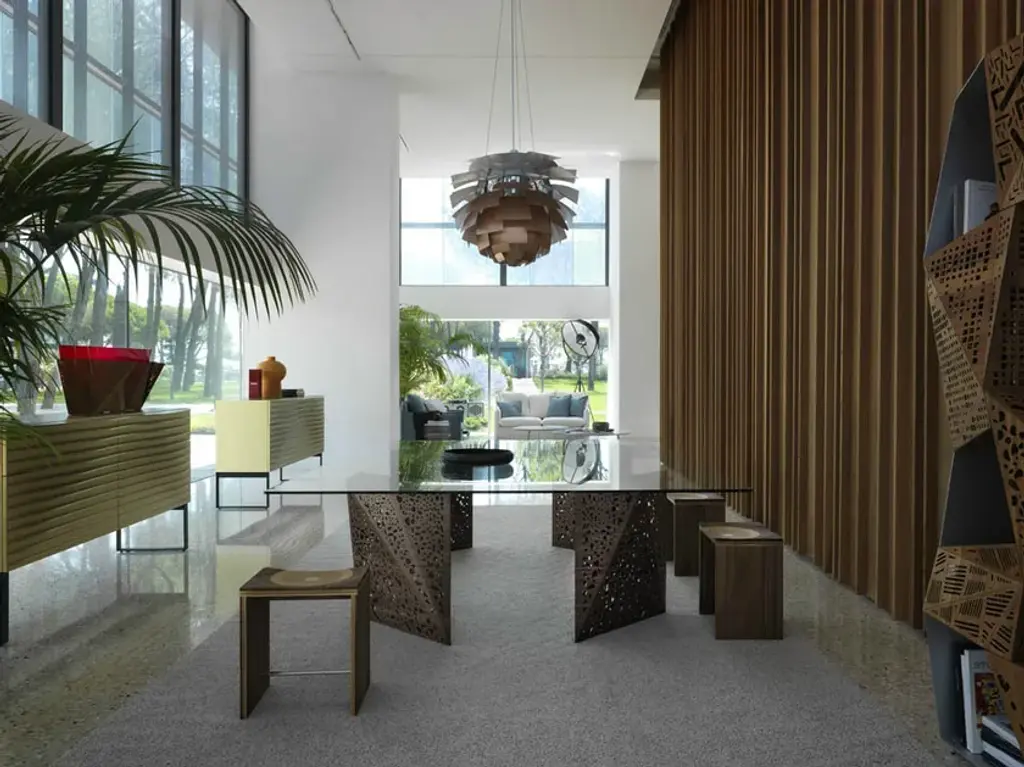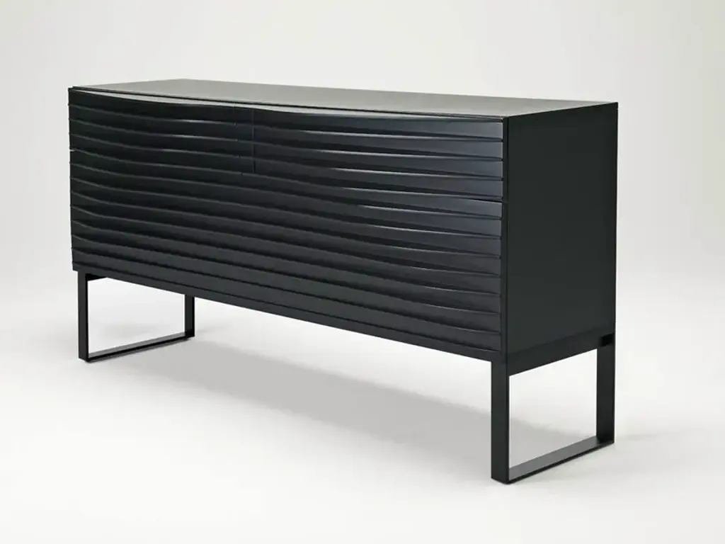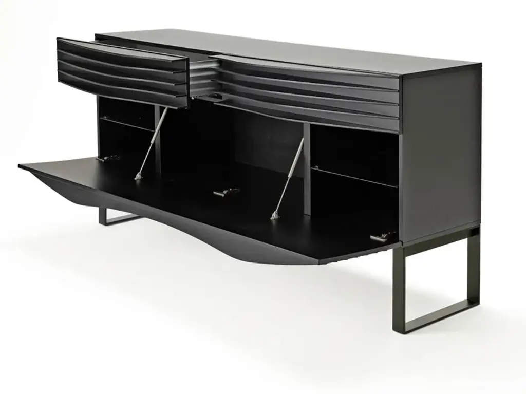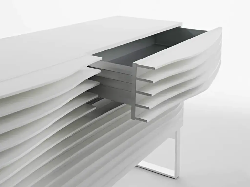 Tide reflects the style of its designer, Karim Rashid, who worked on movement and dynamism in this project. The horizontal development of the front gives the whole a soft, sculptural appearance.In addition to its aesthetics, Tide presents itself as a capacious and functional sideboard, with two drawers and a flap door for the living area, or with two drawers and two capacious baskets for the sleeping area (Tide Comò).MATERIALS:Structure, flap door and drawer fronts in veneered and lacquered particleboard or MDF. Waves on the door and drawer fronts made of lacquered MDF. Flap door with gas pistons with braked opening. Drawers with self-braking runners and anodised aluminium sides.