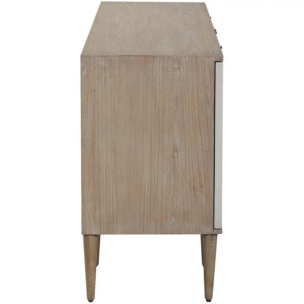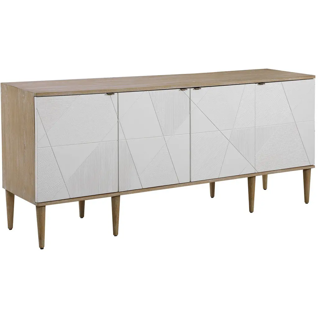 Crisp And Modern, This Stylish 4 Door Cabinet Is The Perfect Sideboard, Media Unit, Or Console Cabinet. The Elm Veneer Exterior Creates A Light And Airy Feel With A Natural Oak Cerused Finish. Accented By Geometrically Textured Doors Atop Sleek Tapered Legs, Adding A Subtle Mid-century Feel. Each Soft Close Door Has An Aged Steel Tab And Opens To A Compartment With One Adjustable Shelf Complete With Wire Management.