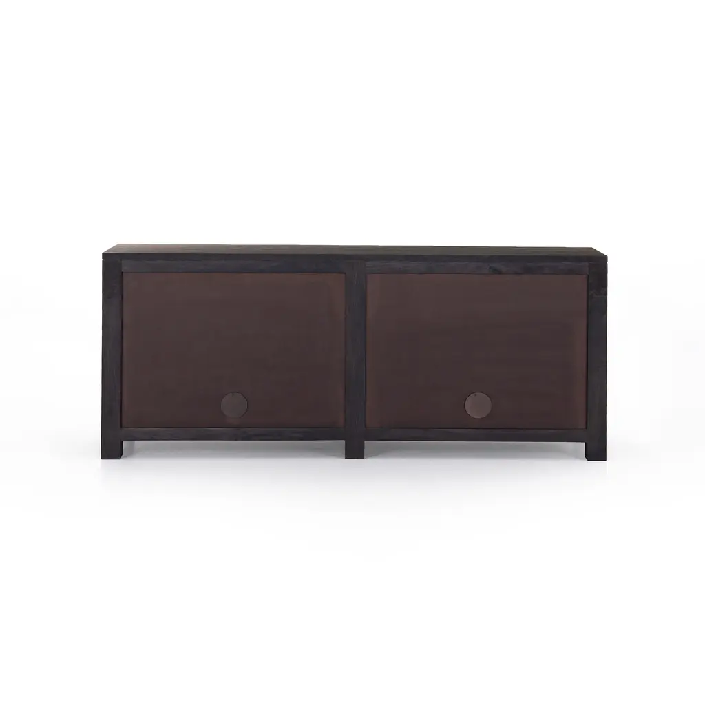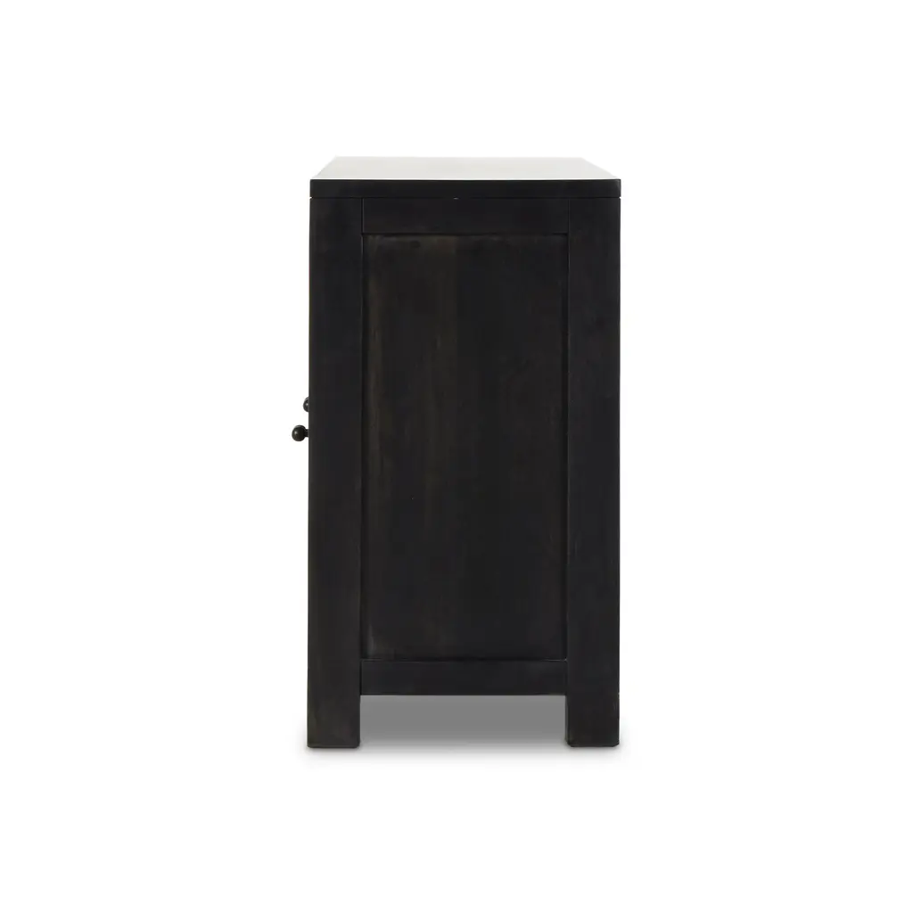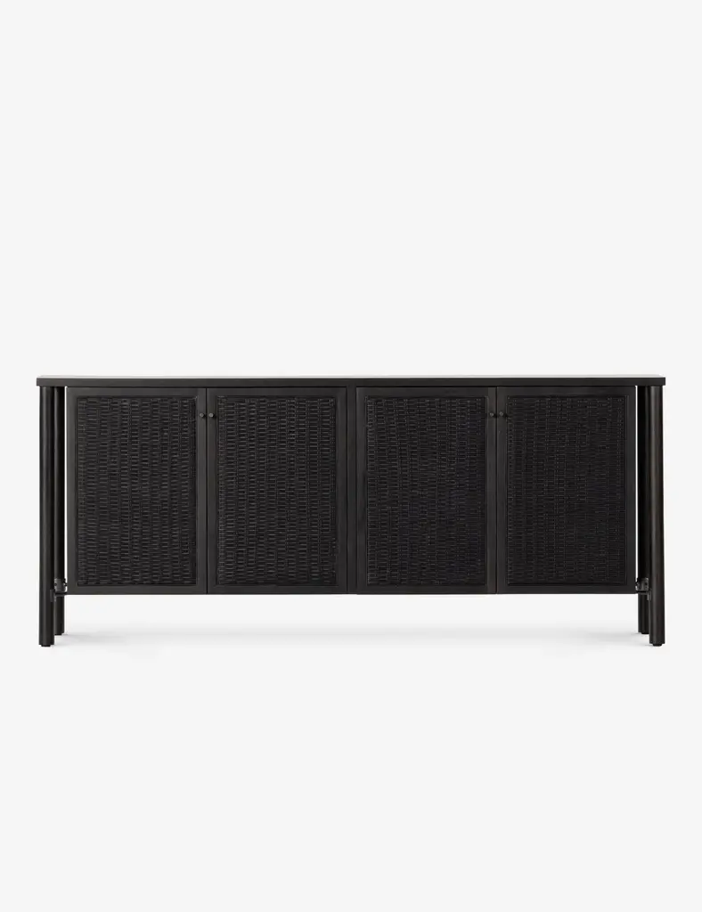A monochromatic take on cane and wood, the Tilda Sideboard from Four Hands is a dramatic addition to your favorite interiors. Made of solid mango wood, the sideboard breaks up its rectilinear profile with inset doors accented with arched panels of woven cane. Block legs complement the curved detailing while round iron pulls open the cabinets to reveal roomy interiors with two fixed shelves. Highlights