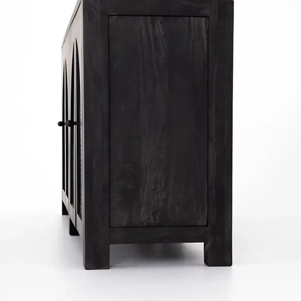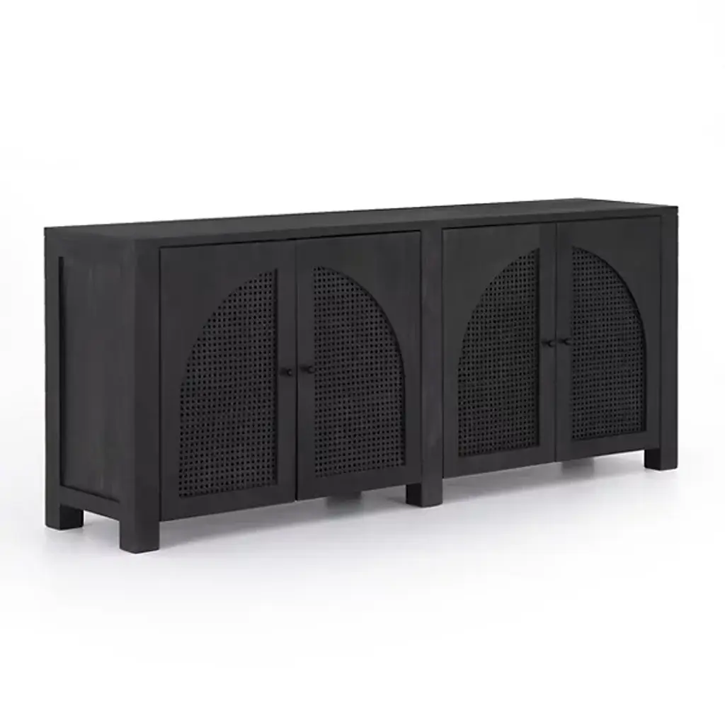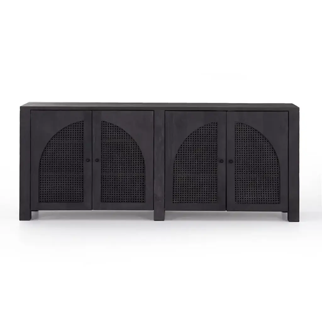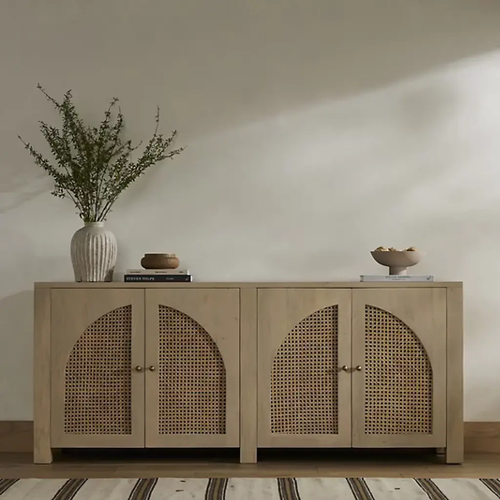 The Tilda Sideboard from Four Hands leaves a lasting impression with traditional motifs framed by a modern outline. The sideboard’s streamlined mango wood framework makes it a great choice in dining spaces, nooks, or entryways. This sideboard’s doors open to reveal a group of 6 shelves. The doors subtly reveal the objects placed inside with an elegant cane weave. This weave is arranged in arching shapes that evoke classic architecture.