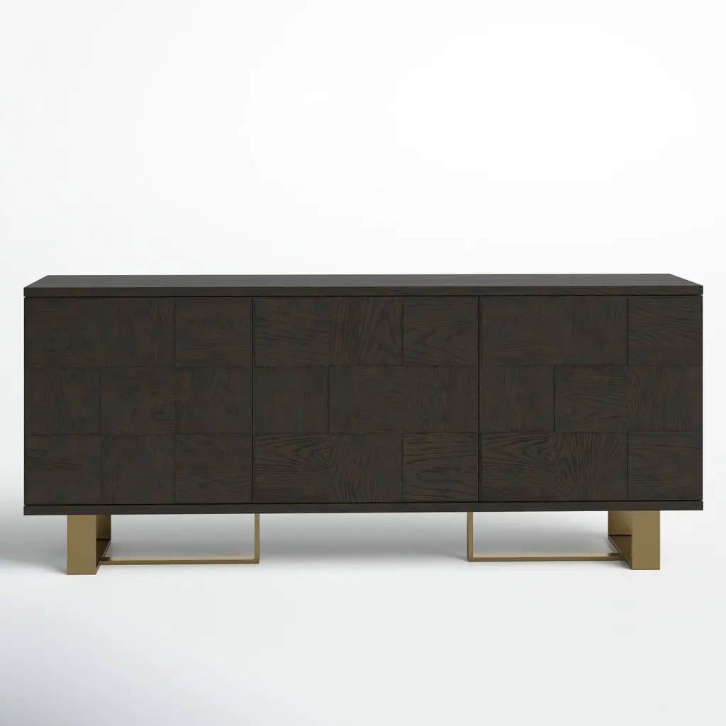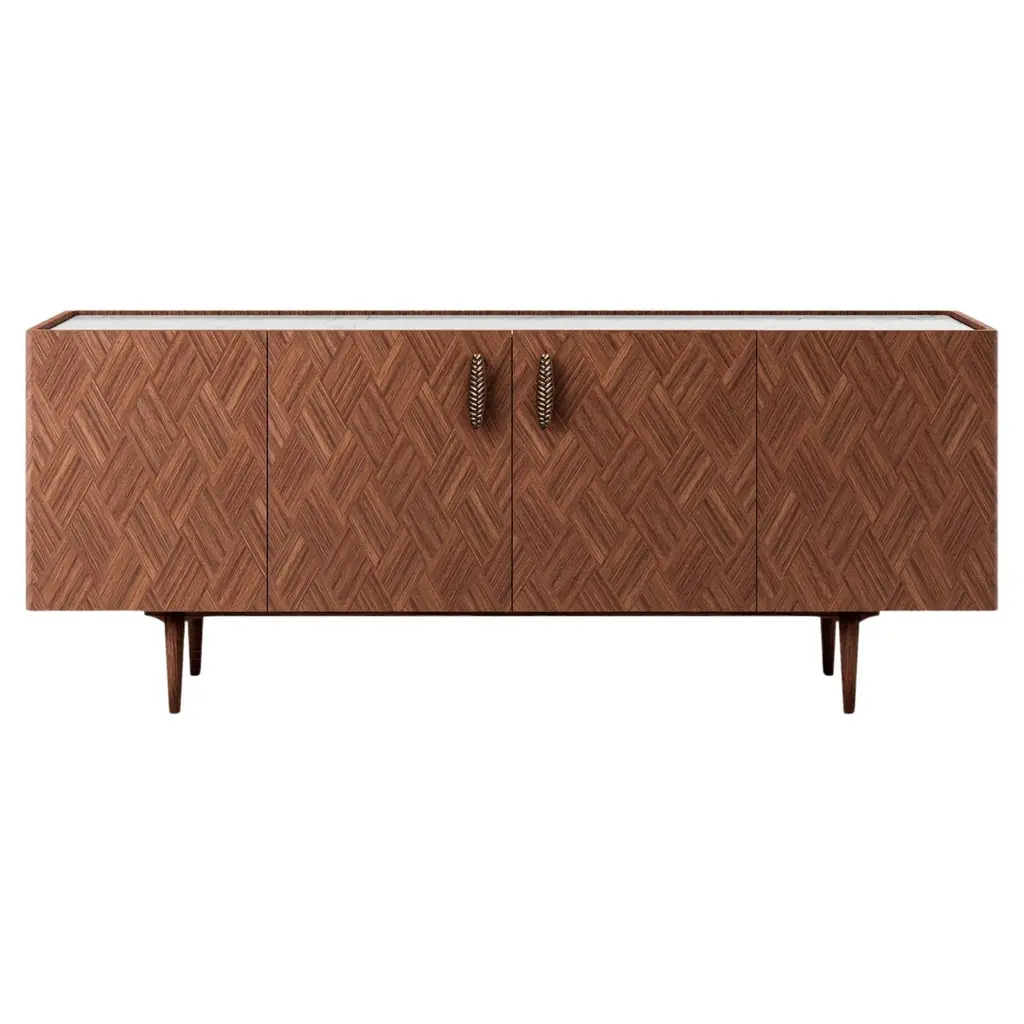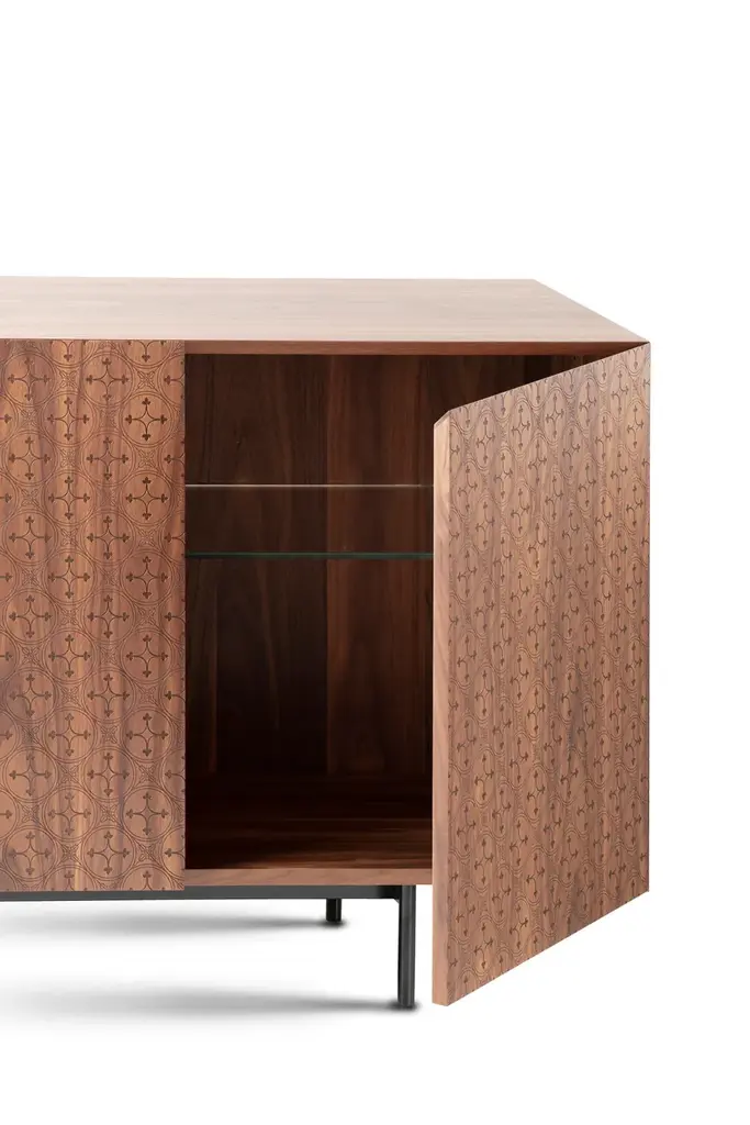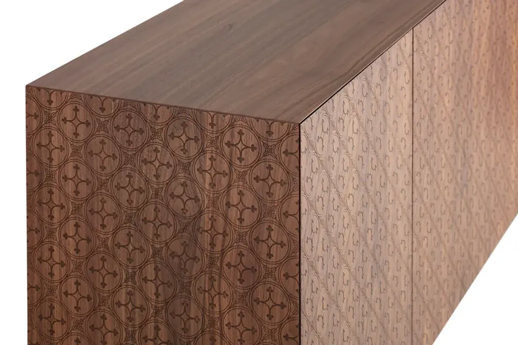 Tiles 63 is a sideboard with doors with push-open opening.Round base 15 cm in black lacquered steel. The finish shown in the picture: etched Canaletto Walnut finish with two-tone Tiles 7G decorationTILES is the collection of containers designed by Manuela Pelizzon. A collection that tells the story of region Puglia in Italy and is inspired by the cement tiles of the churches and farms of Salento. It is precisely the link with the Salento territory that shines through from the creations and the product created, an innovative and high-design product capable of releasing beauty and elegance, unique pieces with clean shapes but strong character. Thus was born a completely artisan product that was immediately appreciated, so much so that it became the "symbol" of Barba Design. The structure is completely fixed at 45 degrees, which offers the decoration of the container completely or partially wrapped. The decorations are impressed on the surface by computerized engraving. The finishes used are natural Canaletto walnut or one-color or twp-color matt lacquered finish.