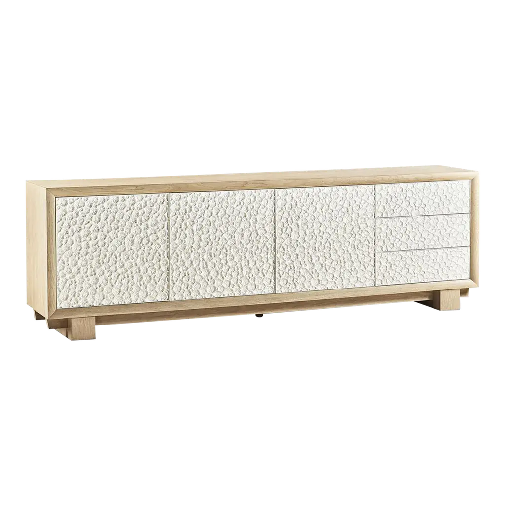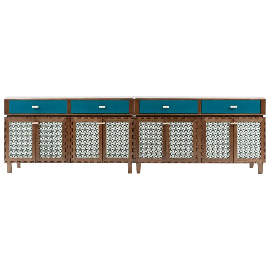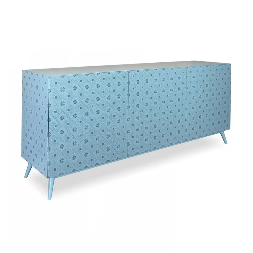 An original accent piece for a contemporary-style interior, this sideboard combines an sleek aesthetic with a functional character. The three doors showcase a splendid tile-inspired motif whose light-blue hue flows into the legs. Equipped with a push and pull opening, the doors open to reveal two distinct compartments with one 8mm-thick extra-clear glass shelf each. The wood structure rests on a lacquered steel base.