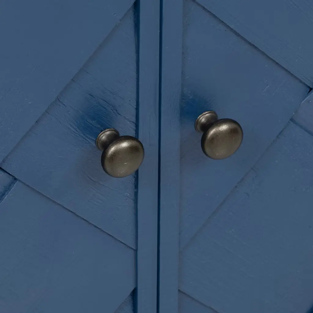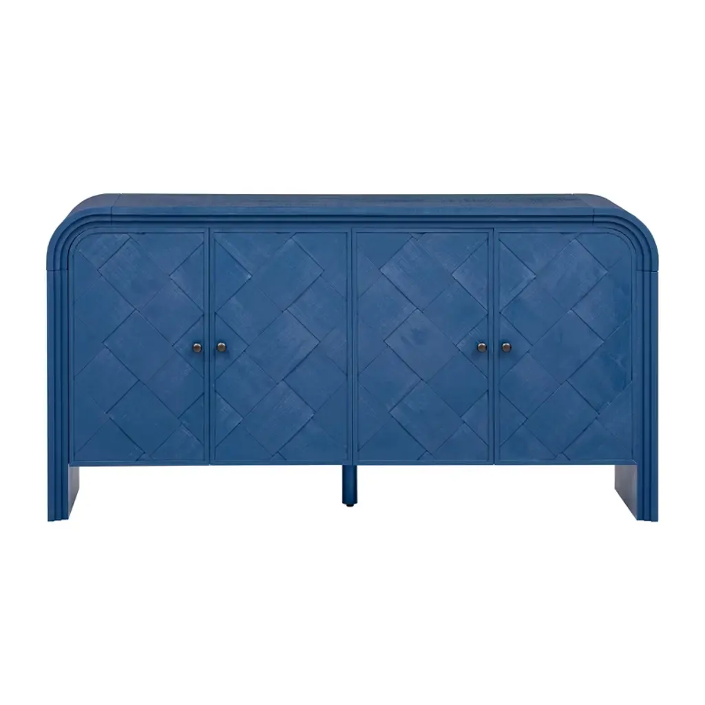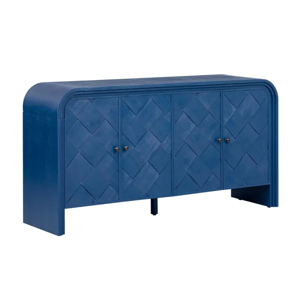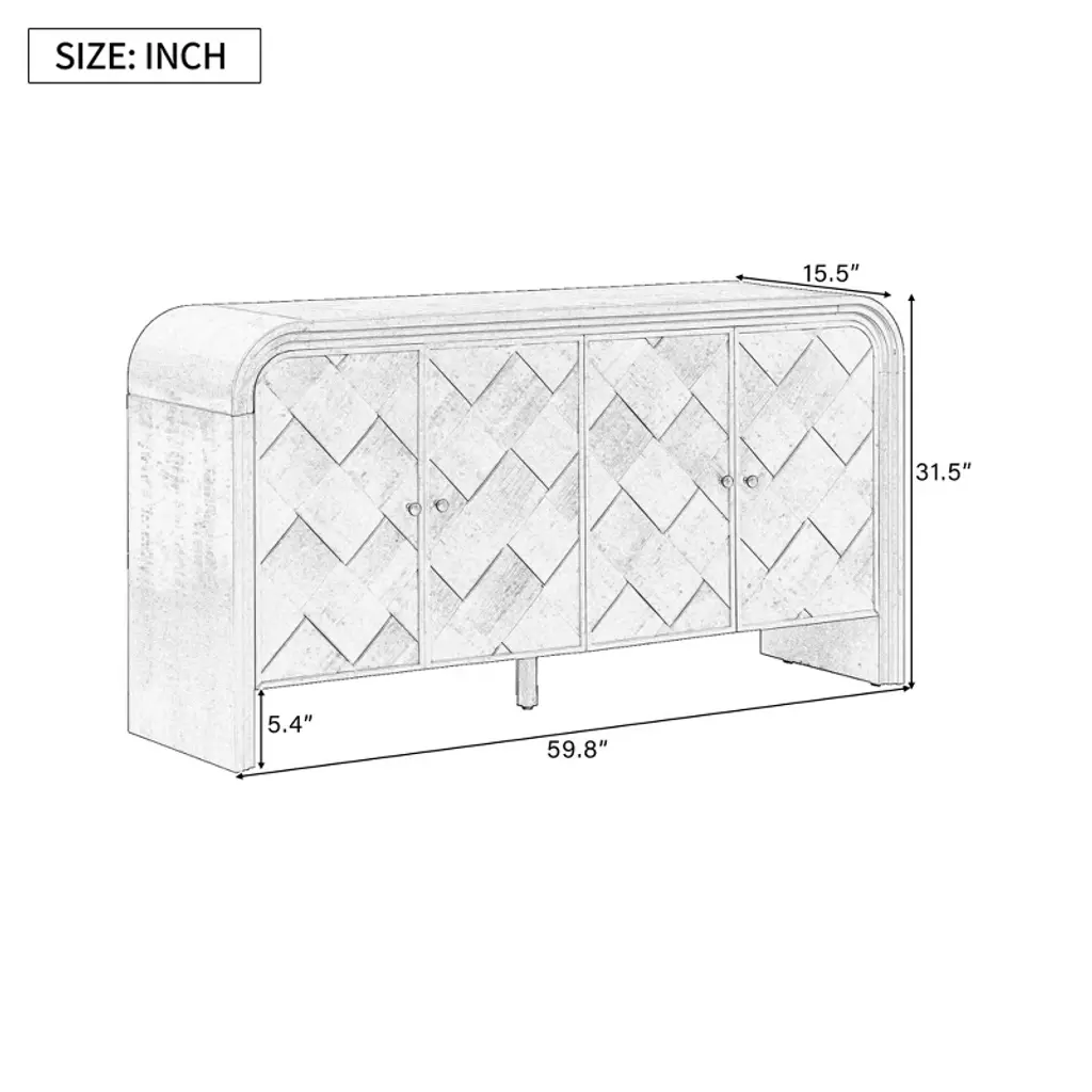 Designed with safety and style in mind, this versatile storage cabinet features gently curved edges to prevent bumps and bruises. Four panel doors showcase meticulously handwoven diamond-pattern detailing, paired with distressed handles that exude timeless charm.