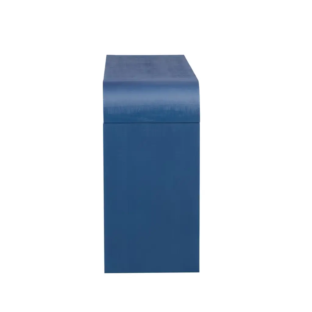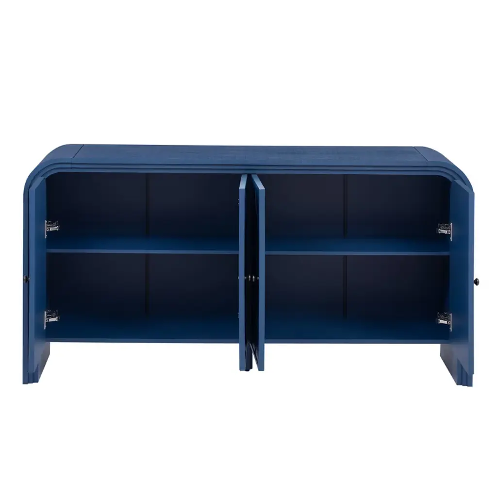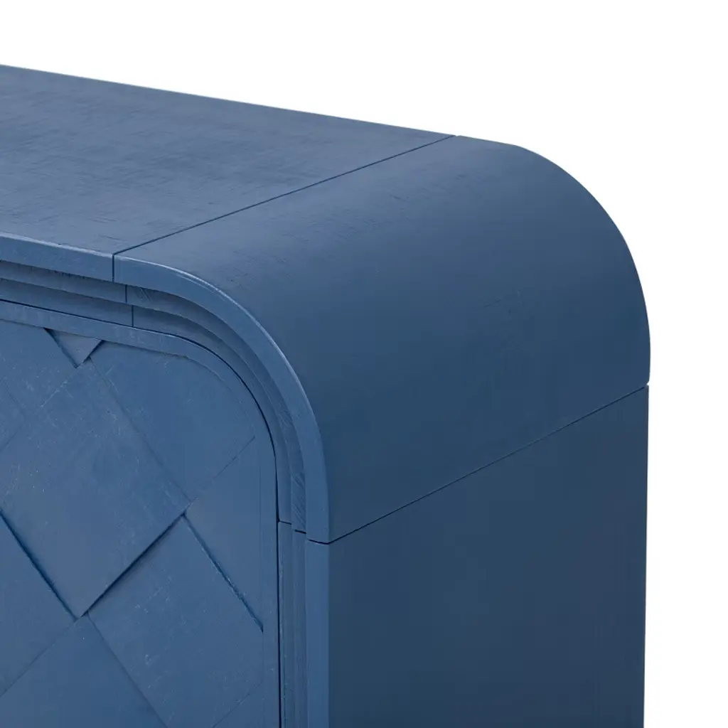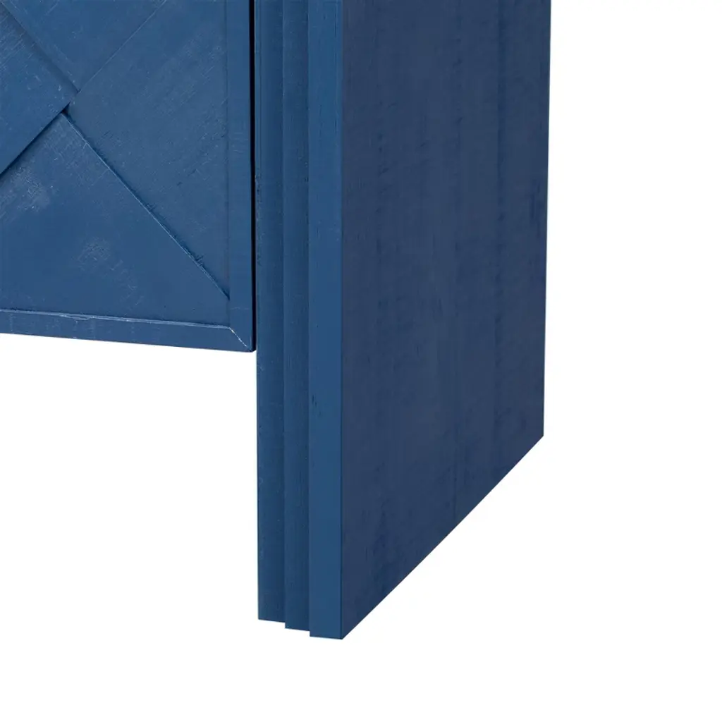 Designed with safety and style in mind, this versatile storage cabinet features gently curved edges to prevent bumps and bruises. Four panel doors showcase meticulously handwoven diamond-pattern detailing, paired with distressed handles that exude timeless charm.