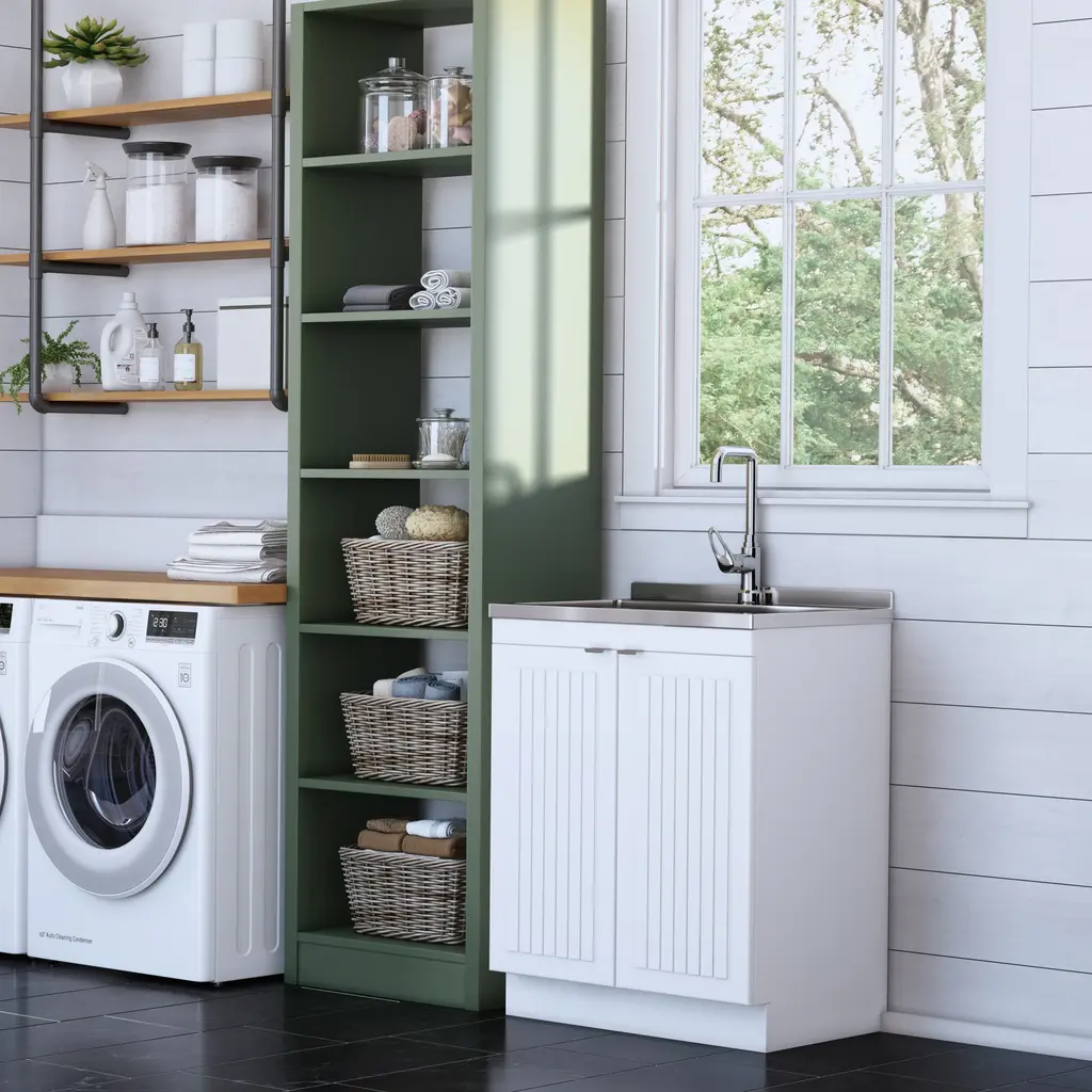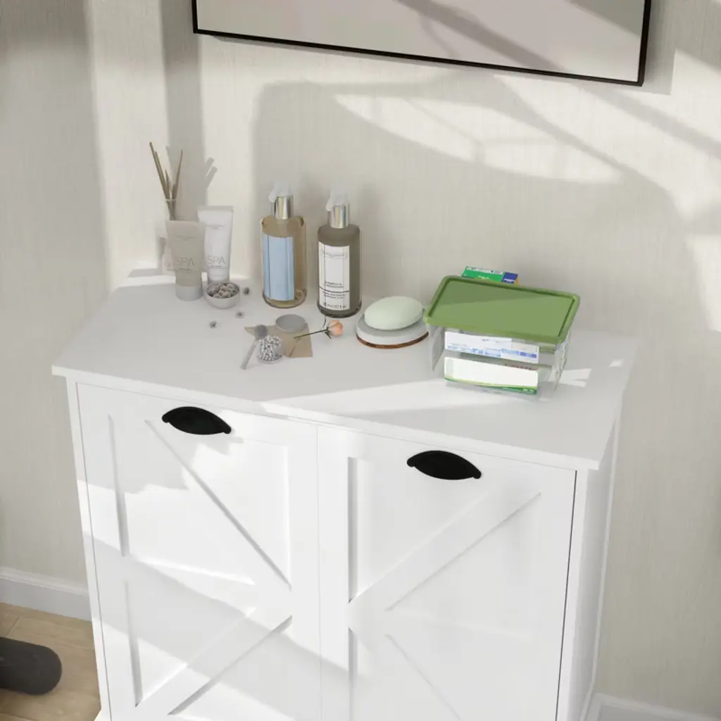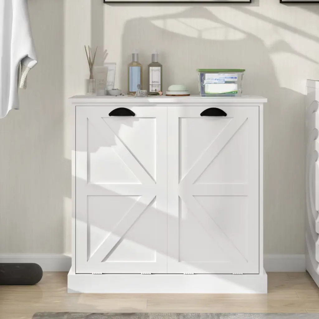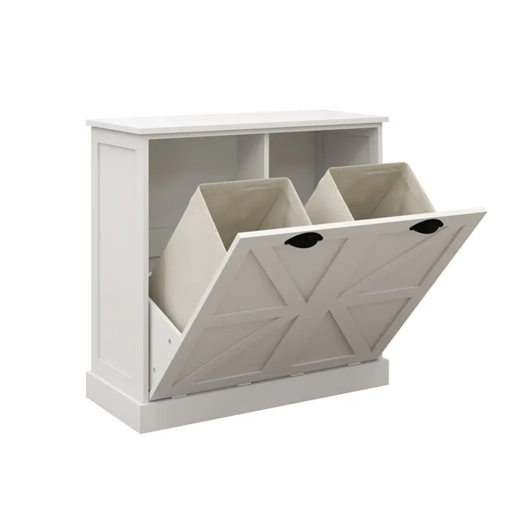 Elevate your laundry routine with this stylish white cabinet featuring two removable fabric hampers - perfect for sorting lights and darks while keeping mess out of sight. The sleek, modern farmhouse design blends seamlessly with any decor, from contemporary to vintage. Crafted from eco-friendly UV-painted MDF with a waterproof finish, it's both durable and easy to clean. Includes child-safe anti-tip hardware and requires simple assembly with pre-drilled components.