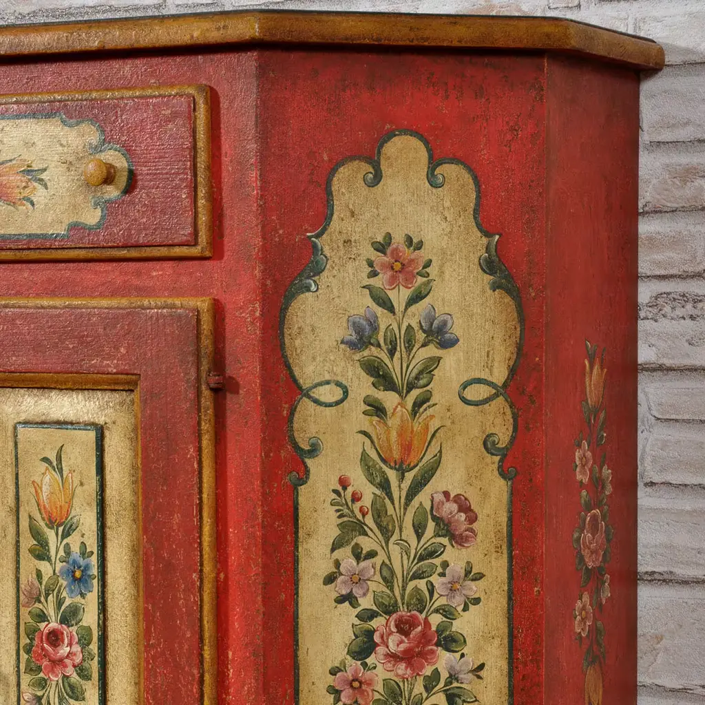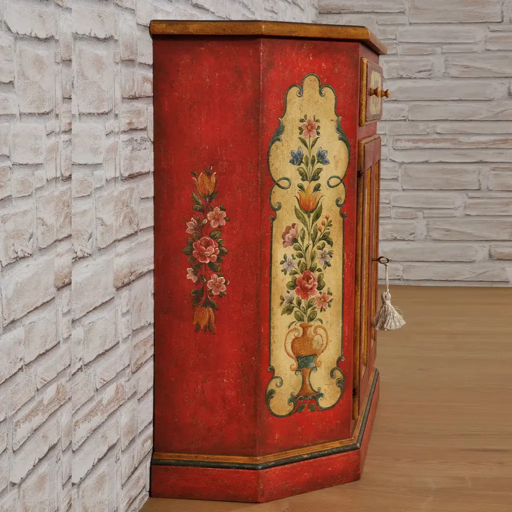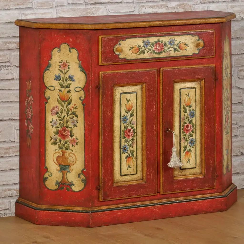 The techniques used in Trentino Alto-Adige woodworking workshops by the end of the 17th century are minutely followed for handcrafting this superb Baroque Tyrolean sideboard. Boasting a triumph of polychrome handpainted decorations revealing its romantic allure, it features a dynamic silhouette equipped with two doors and a practical drawer. Please contact the Concierge for customizations.