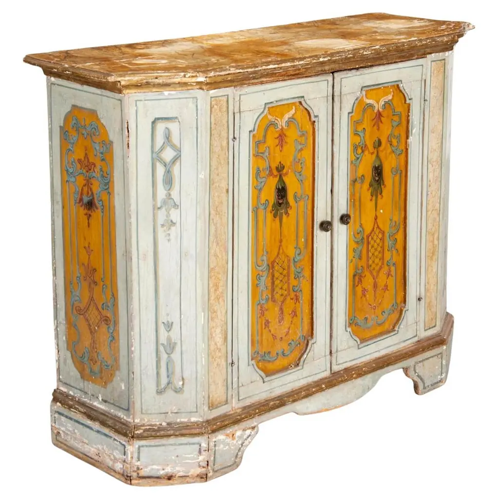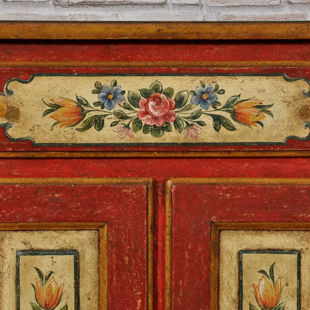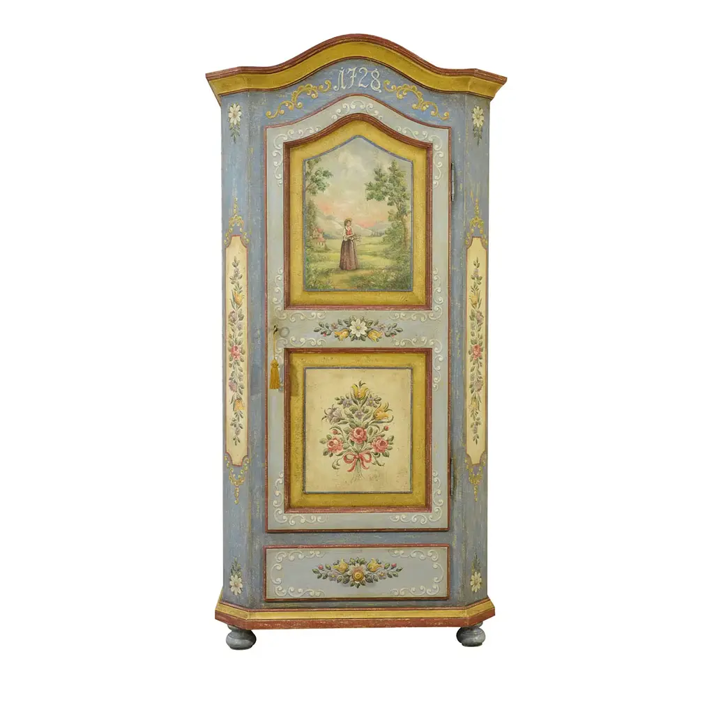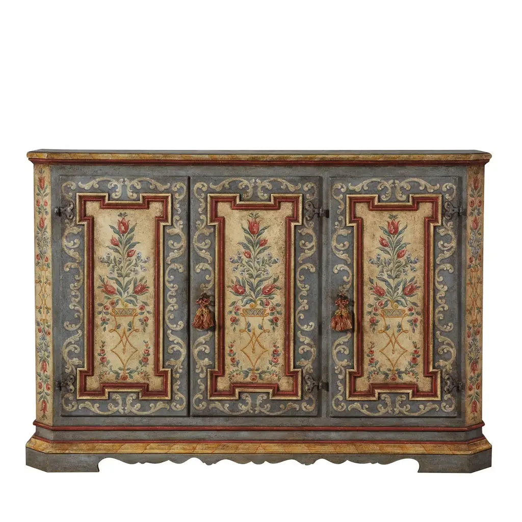 The techniques used in Trentino Alto-Adige woodworking workshops by the end of the 17th century are minutely followed for handcrafting this superb Baroque Tyrolean sideboard. Boasting a triumph of polychrome handpainted decorations revealing its romantic allure, it features a dynamic silhouette equipped with two doors and a practical drawer. Please contact the Concierge for customizations.