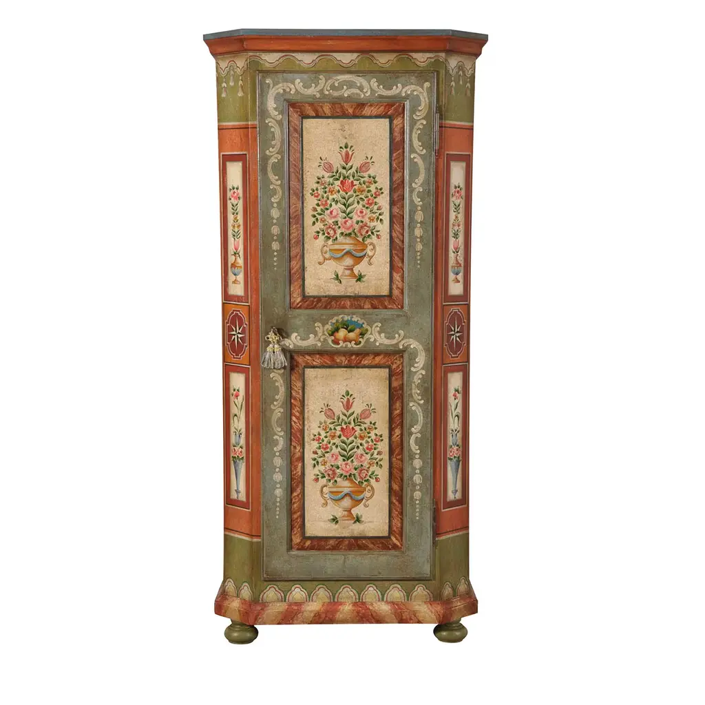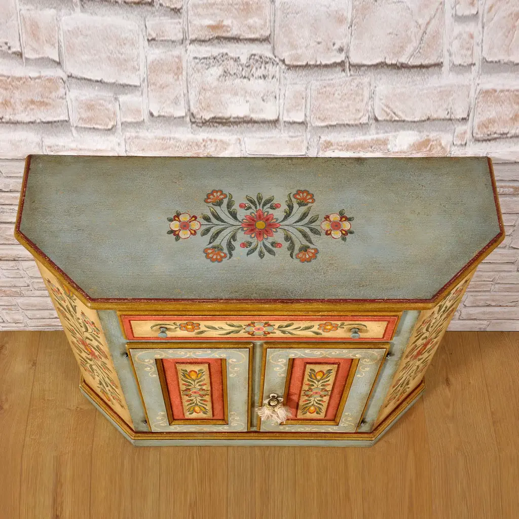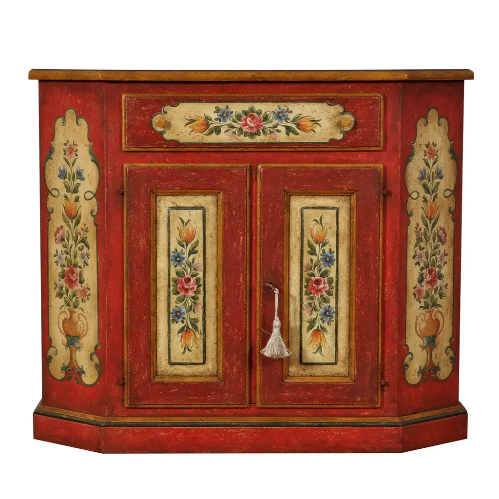 Romanticism and uniqueness mark this precious artisan sideboard, marvelous reproduction of a Baroque Tyrolean design from the 18th century. Equipped with a couple of doors and a practical drawer, it immediately captures the eye with its minute multicolor floral decorations deftly painted by hand with a mix of water-based tempera paints sealed by shellac and protective beeswax. Consult the Concierge for customizations.