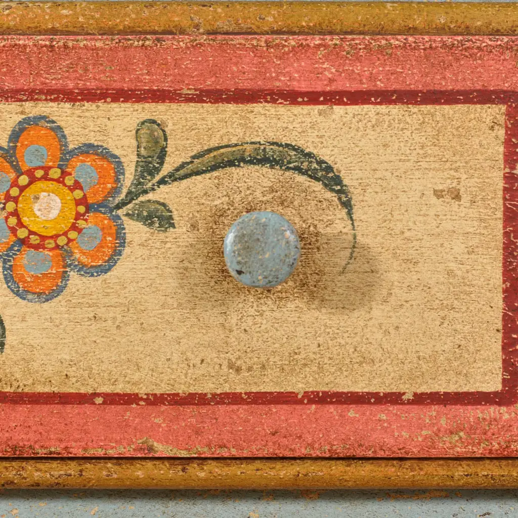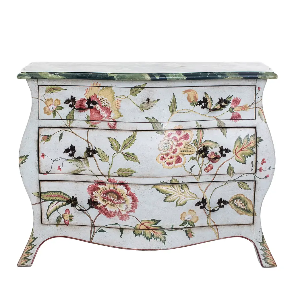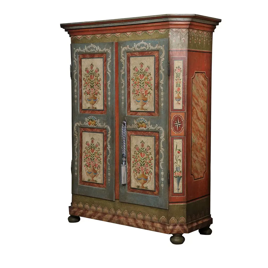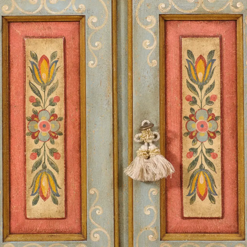 Romanticism and uniqueness mark this precious artisan sideboard, marvelous reproduction of a Baroque Tyrolean design from the 18th century. Equipped with a couple of doors and a practical drawer, it immediately captures the eye with its minute multicolor floral decorations deftly painted by hand with a mix of water-based tempera paints sealed by shellac and protective beeswax. Consult the Concierge for customizations.