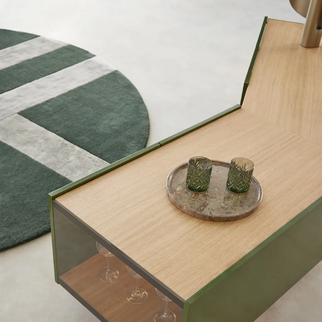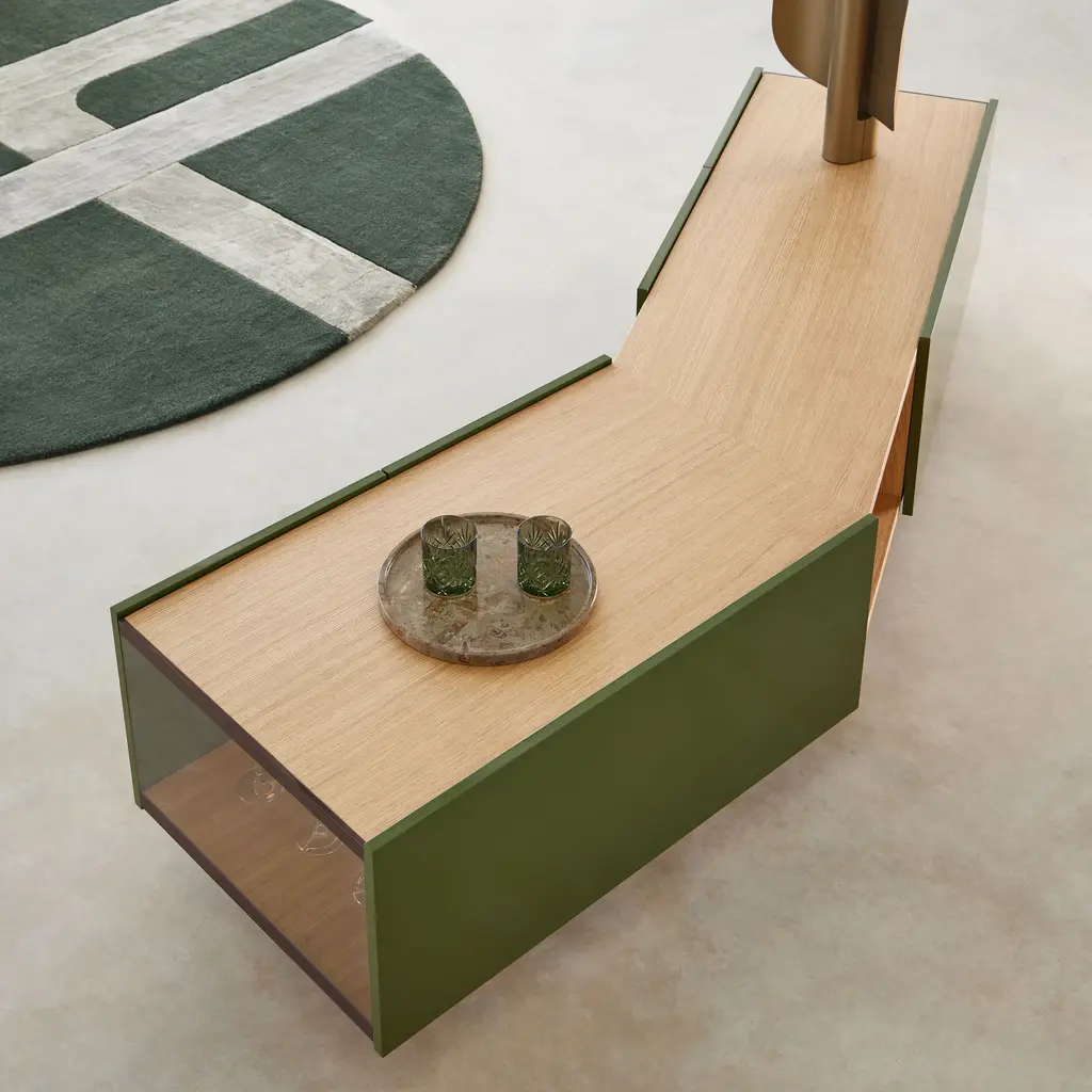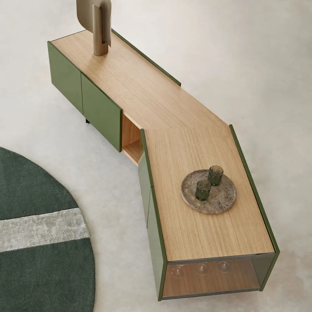 The Toscana Firenze Sideboard reimagines traditional storage furniture with its distinctive obtuse angle, projecting into the room to create innovative spatial dynamics. Handcrafted oak veneer covers with meticulously joined corners enhance its elegance, while glass sides offer a glimpse into its interior. An integrated LED system, activated by door movement or a motion sensor, illuminates the contents upon opening.