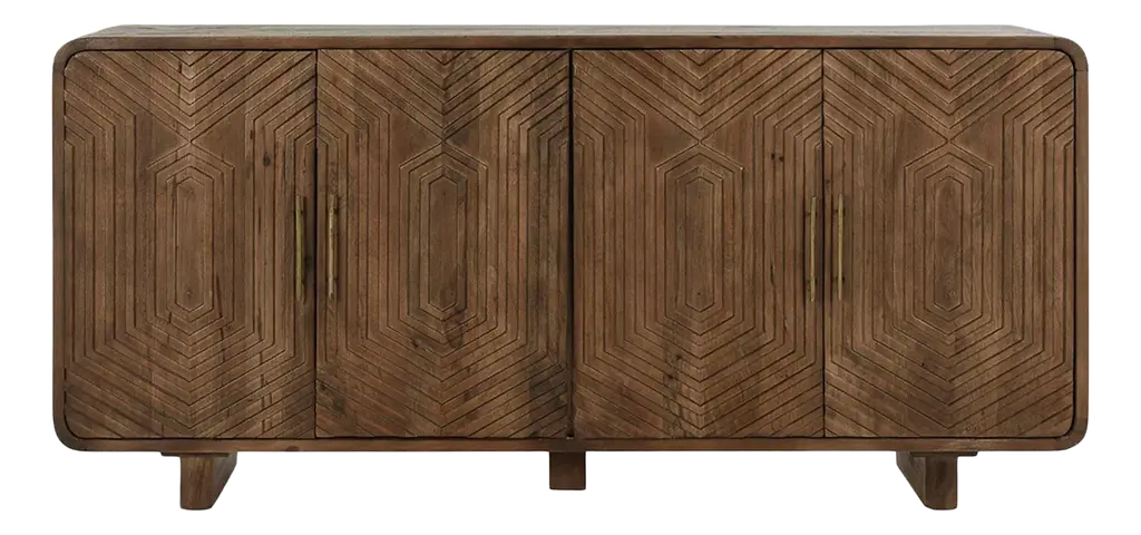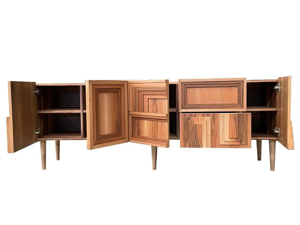 Totem Wood Sideboard by Lola GlamourDimensions: D 45 x W 200 x H 75 cmMaterials: Wood.The mathematics hidden behind our idea of the canon of beauty encourages us to grant attributions of beauty to the geometric patterns that are integrated into nature. In this context, we developed these interlocking polytope designs that are imbued with their own essence of harmony and beauty into a totality of conceptual and artistic value. With four doors with an interior shelf, and two camouflaged drawers, this robust sideboard will store your belongings behind its geometric patterns.The Totem series can be manufactured in natural walnut veneer or it can be lacquered in any of the colors in our catalog to adapt to any range or existing style.We are Félix and Désirée Ramos, brothers and product designers of our brand, Lola Glamour.We are interested in the singular, the different, the beauty, and the balance of color and materials. We have the ability to observe and the ability to translate any beautiful object into a piece of furniture.We are proud of having created our own style, a way of understanding design, which allows us to tell stories and connect with the souls of people and spaces.Lola Glamor is a Spanish company from Soria, which has designed and manufactured unique furniture in noble woods, with artisanal construction and extraordinary finishes since 1995. Artistic furniture that is customized in size and finish according to the client's needs.We offer original furnishing solutions for professionals and individuals from any country in the world, mixing materials, volumes, motifs, and colors that achieve their own style.We are, above all, the sum of a team of people who contribute their dedication and commitment to a unique level of demand, detail, and quality.