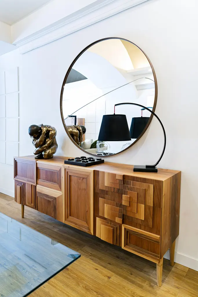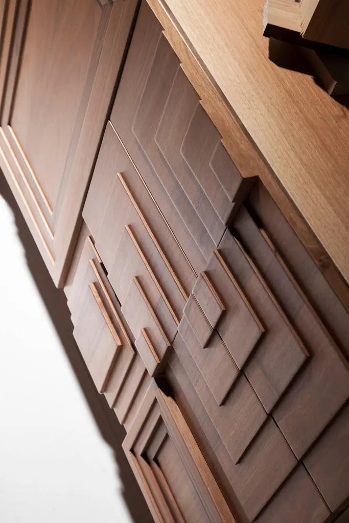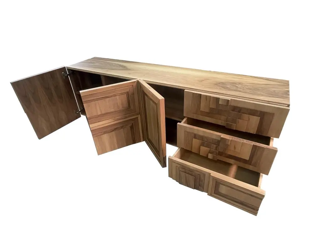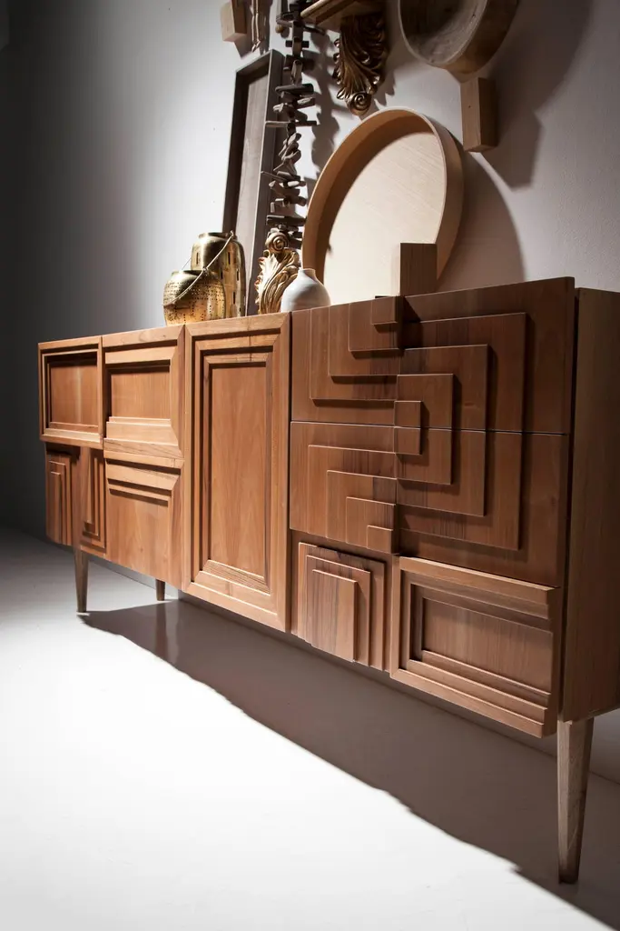Totem Wood Sideboard by Lola GlamourDimensions: D 46 x W 195 x H 84 cmMaterials: Wood.Geometry and mathematics behind the scenes of art. The design embraces and integrates the exact proportions of shapes and numbers to build flawlessly imperfect furniture. Chaos from logic, organized structure as the basis of the last disorder.The Totem series can be manufactured in natural walnut veneer or can be lacquered in any of the colors in our catalog to adapt to any existing range or style. Three robust doors and three drawers that go unnoticed among their geometric patterns.We are Félix and Désirée Ramos, brothers and product designers of our brand, Lola Glamour.We are interested in the singular, the different, the beauty, and the balance of color and materials. We have the ability to observe and the ability to translate any beautiful object into a piece of furniture.We are proud of having created our own style, a way of understanding design, which allows us to tell stories and connect with the souls of people and spaces.Lola Glamor is a Spanish company from Soria, which has designed and manufactured unique furniture in noble woods, with artisanal construction and extraordinary finishes since 1995. Artistic furniture that is customized in size and finish according to the client's needs.We offer original furnishing solutions for professionals and individuals from any country in the world, mixing materials, volumes, motifs, and colors that achieve their own style.We are, above all, the sum of a team of people who contribute their dedication and commitment to a unique level of demand, detail, and quality.