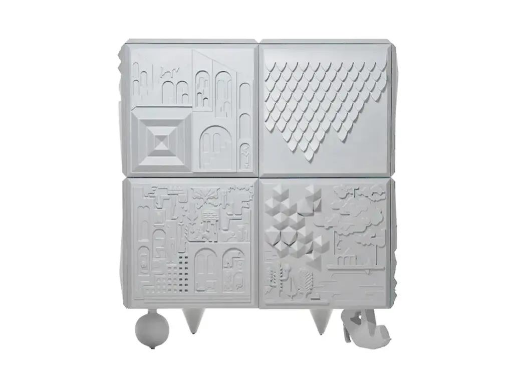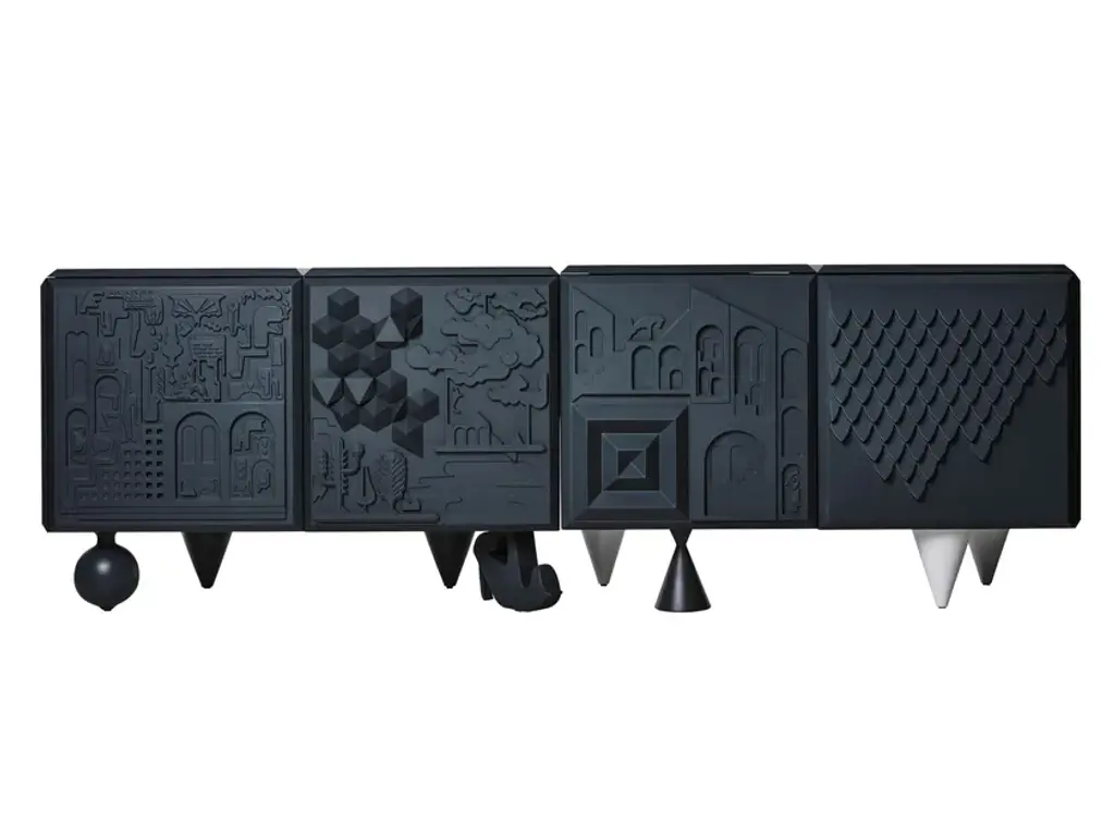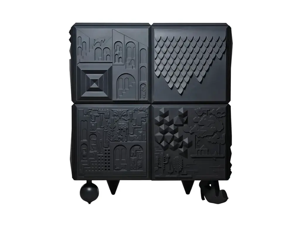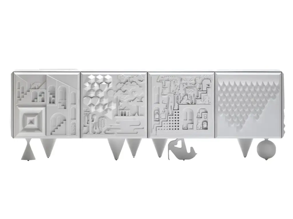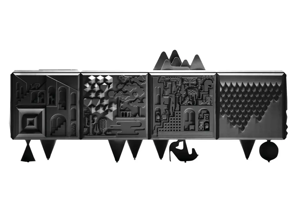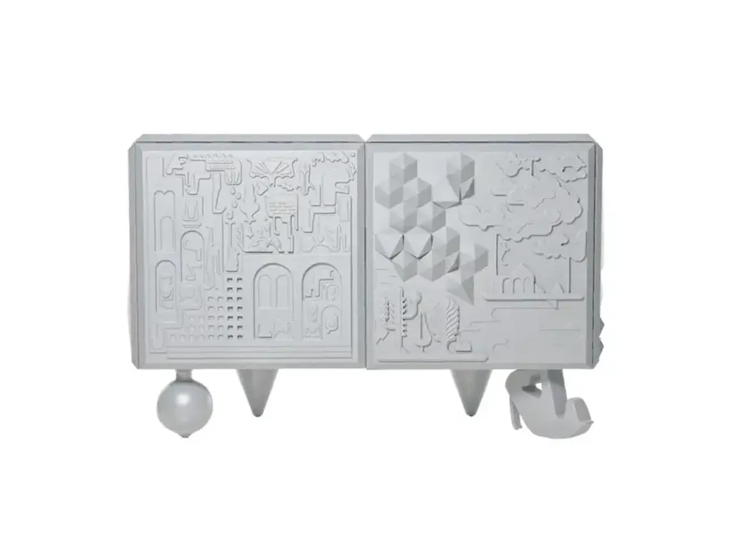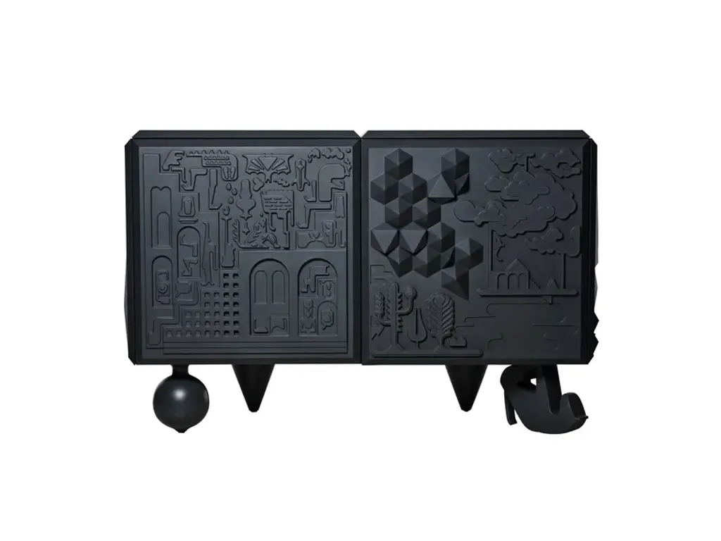 Antoine + Manuel have designed a piece of forniture which is all art and fantasy. Body and shelf made in black or white MDF laquered. Doors, plain top and sides in integral polyurethane injection. Feet of solid alder wood in one piece, lacquered and micro-textured in the same colour as the doors. Rarely does a graphic designer (two, in this case) go into the field of furniture design. We have to go far back in time to find them, to the times of the high and low reliefs. This is exactly what Antoine Audiau and Manuel Warosz have done, a couple of extraordinary Parisian graphic artists who sign their works as Antoine+Manuel. The cabinet Tout va Bien they have designed for this new collection brought out by BD Barcelona Design is a surprising mixture of applied arts, hieroglyphic language, contemporary graphics, fantasy and optimism. It is produced with the quality of yesterday but using today’s technologies. Colours: white and dark grey (RAL 7024).