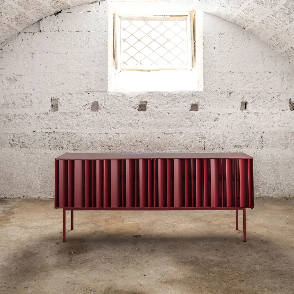 Elegant and sophisticated, this sideboard will infuse any room with its bold and imposing character. Exquisitely crafted of red-lacquered steel, it features four doors (45-cm height) obtained by small plates welded in different directions thereby creating a see-through and captivating pattern. This piece is also available in other colors on request, ask the Concierge for options.