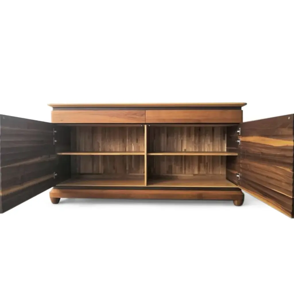 Two-door sideboard with drawers. The distinctive feature of this concept is the delicately undulating finish on the front. Pictured close-up, the solid walnut doors. Frame in solid canaletto walnut. Available in two-door version with two drawers, two internal compartments and wooden shelves. Sideboard with doors in solid walnut.Sideboard n. A-102 • Colour Noce Naturale • Finishing Olio. L. 187 H. 95,5 D. 53,5