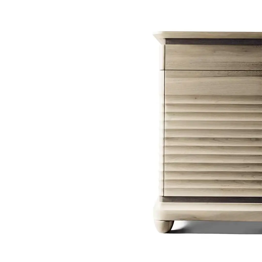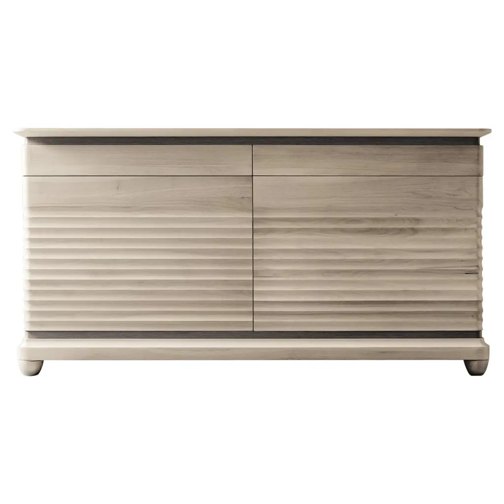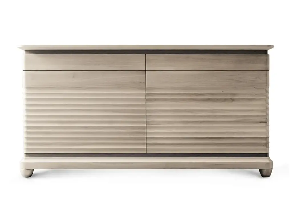 Contemporary design and classic soul. This solid wood sideboard is the result of our artisans’ craftmanship and passion. The delicate wavy front creates a refined contrast between lights and shadows: this way, the cabinet looks different and more suggestive depending on the perspective.