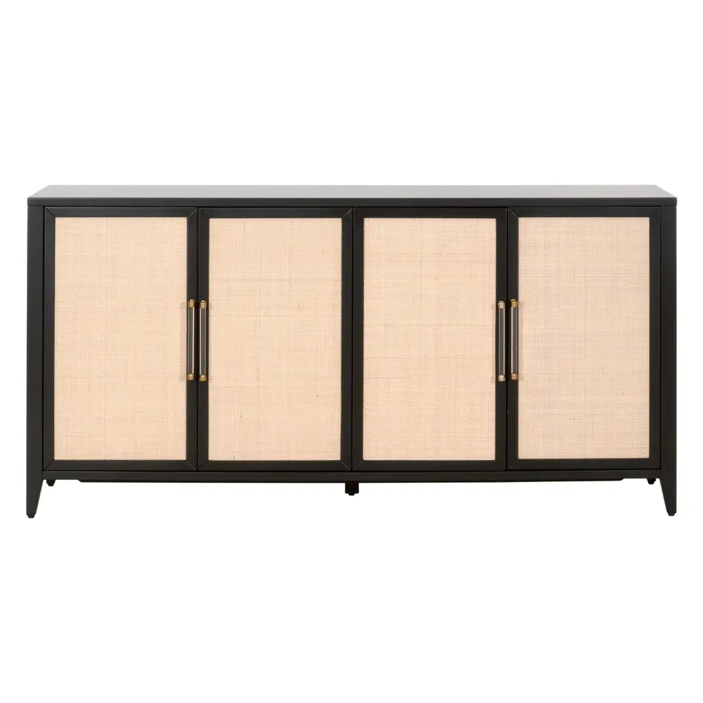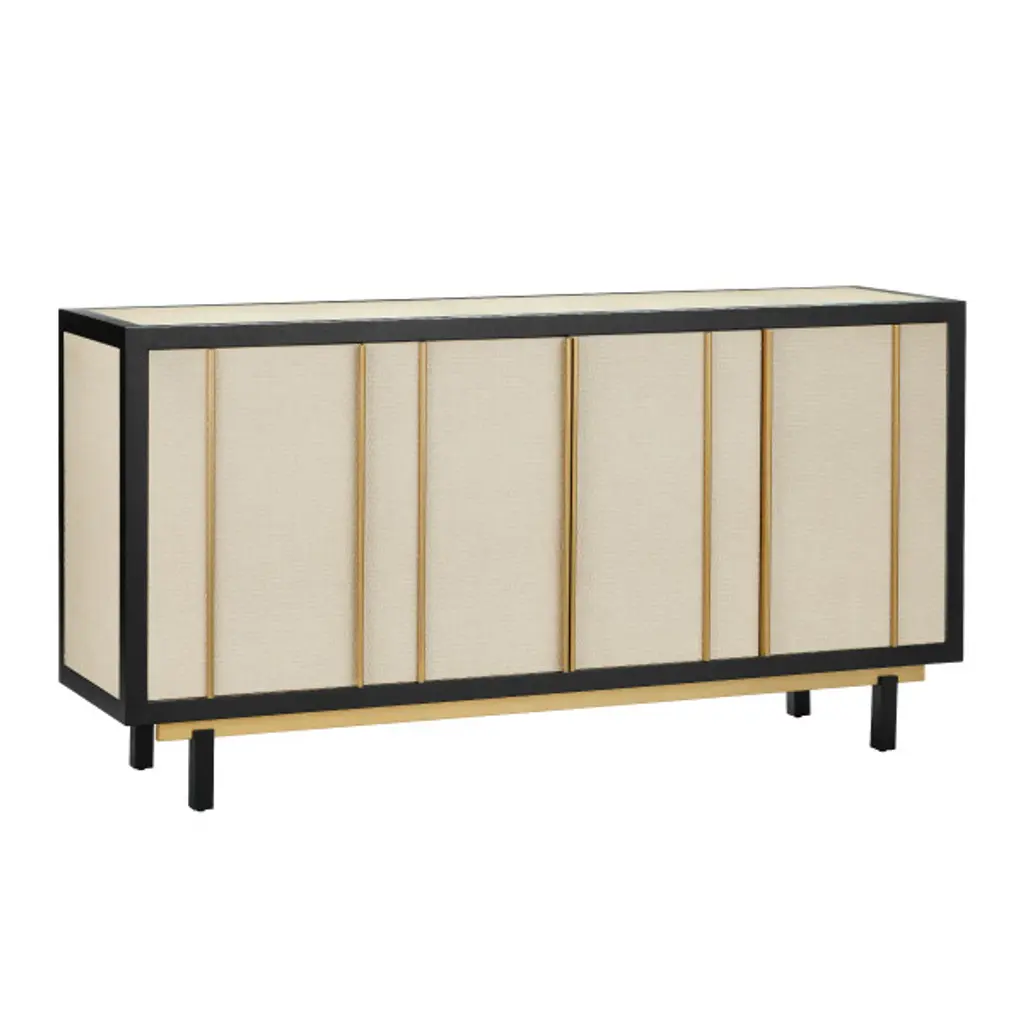Modern wire mesh credenza from Melbourne-based design studio VUUE is framed in wirebrushed oak with a grey finish for a rich, layered look. Inspired by similar designs from the 1960s, brass-plated mesh door fronts create a peak-a-boo effect, ideal for concealing media devices without losing remote functionality. Two adjustable shelves offer versatile storage, while a cutout in the back keeps cords out of sight. CB2 exclusive.