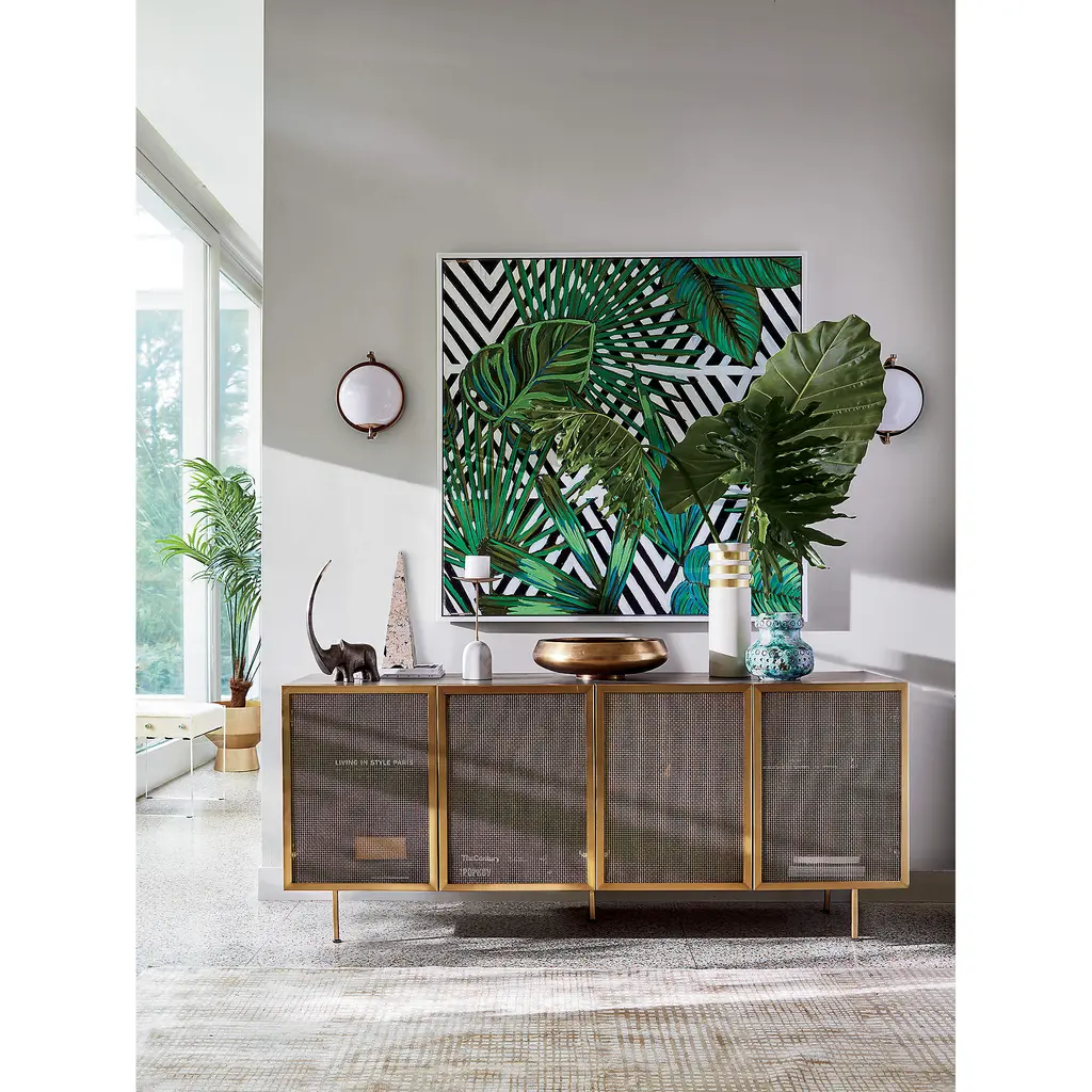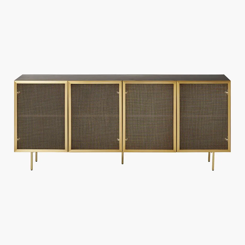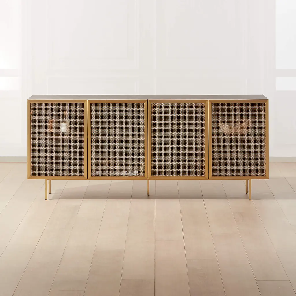 Designed by VUUE, modern brushed oak veneer frame takes on a Mad Men-esque vibe with fine wire mesh brass-plated doors. Rich and textured, mesh creates a peek-a-boo effect, ideal for concealing media devices without losing remote functionality. Four doors open to two adjustable shelves for plenty of storage. Wire mesh cabinet credenza leaves space behind both inner corners of shelves for media cords to snake down and out the back/center of the piece. Learn about VUUE on our blog. CB2 exclusive.