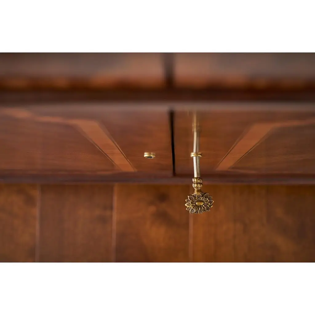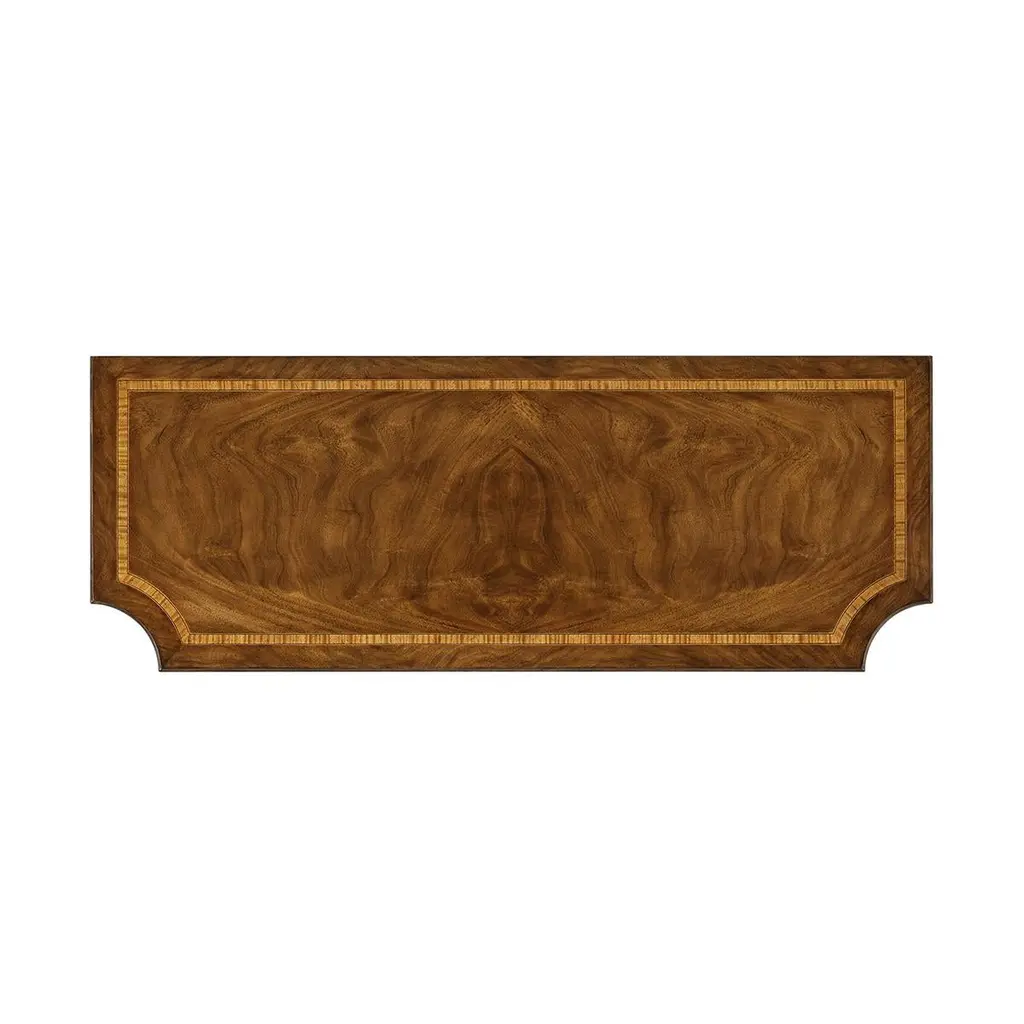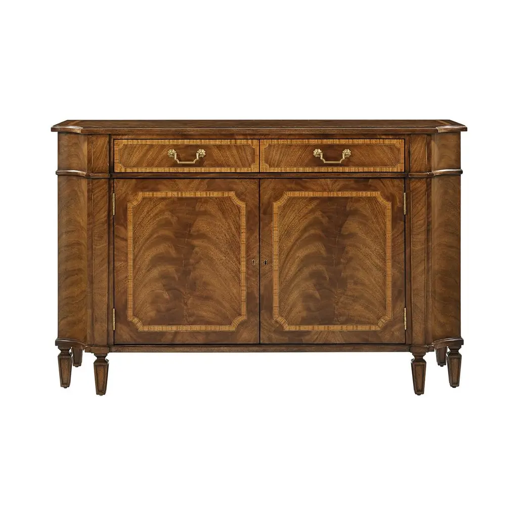 A magnificent figured swirl wood draws the eye across its stepped top and two-door cabinet body, emphasizing the depth and richness of its handcrafted veneer work. Inlaid paneling, elegant shaping, and subtle fluting highlight the fine English Regency inspiration.Crafted with precision from select figured woods and finished in a warm medium brown tone, this sideboard offers timeless elegance in a more compact scale. Two upper drawers and a spacious lower cabinet provide refined storage for dining essentials or curated décor.Dimensions: 58.5" W x 22" D x 37" H