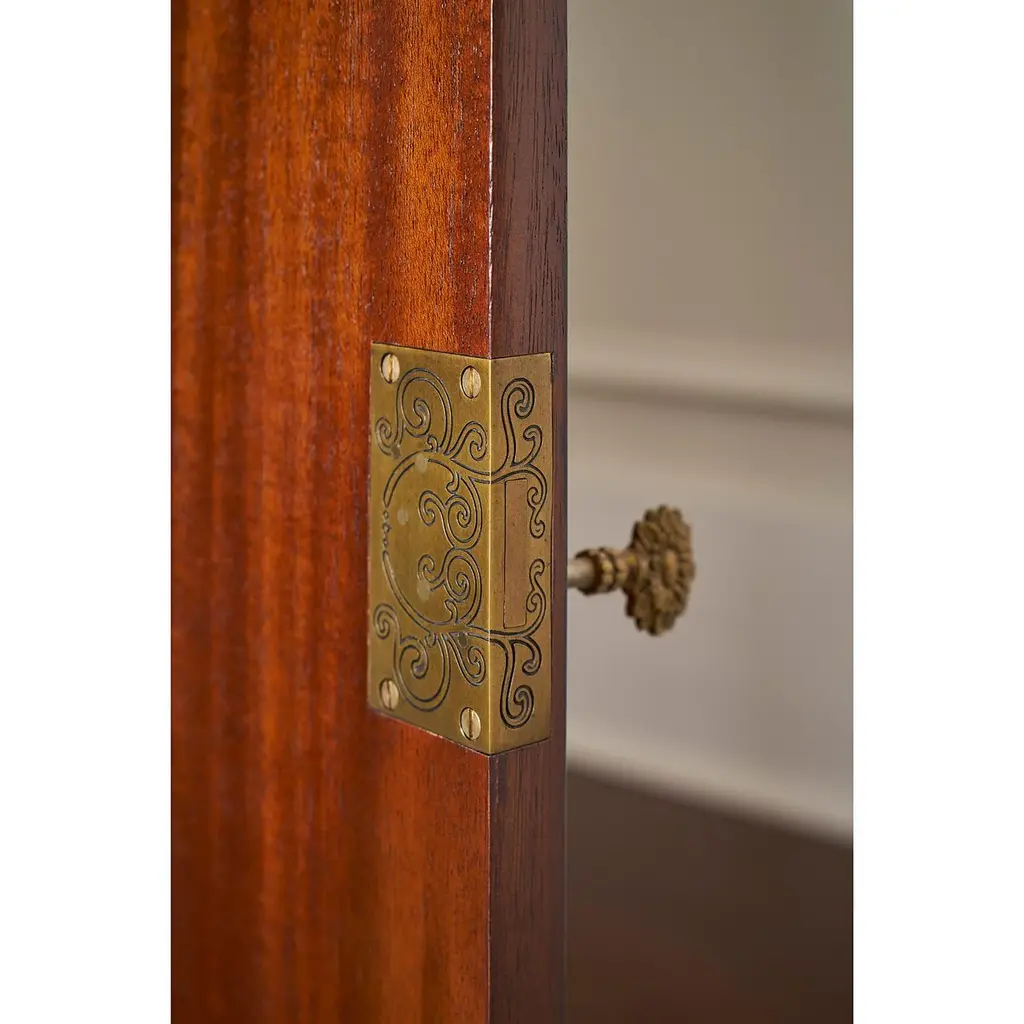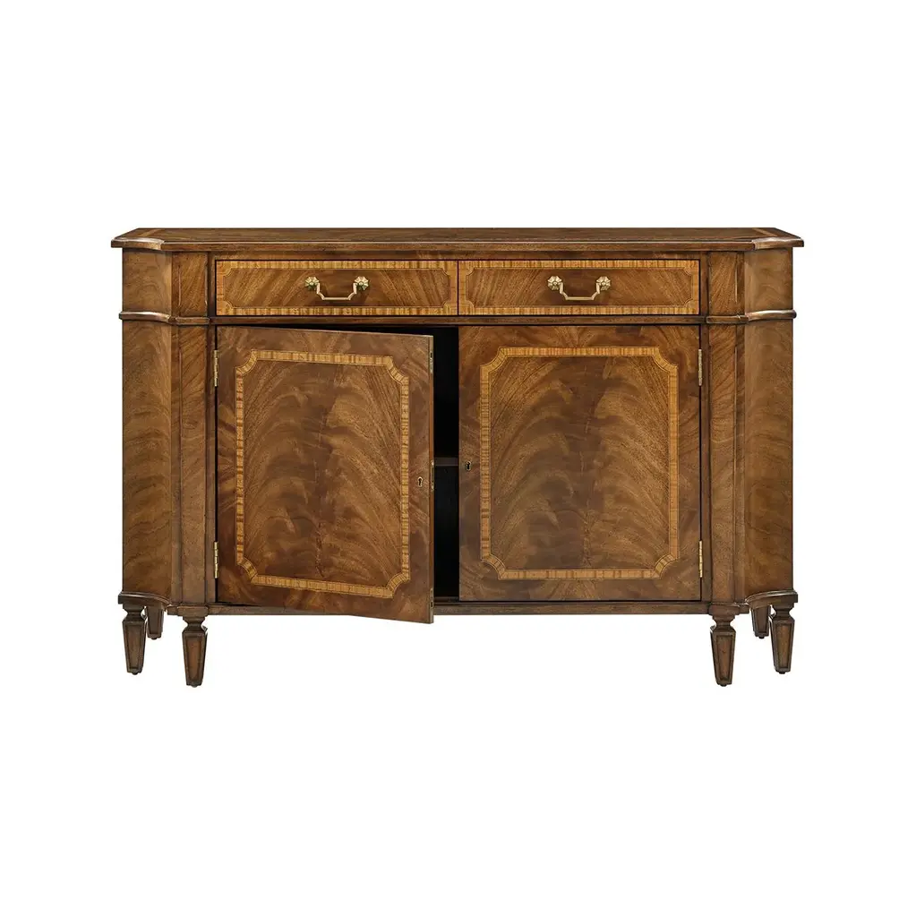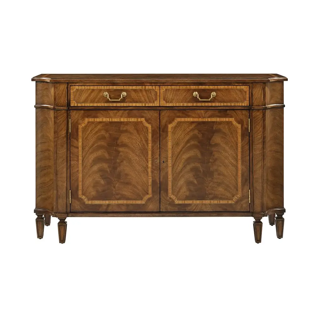 A magnificent figured swirl wood draws the eye across its stepped top and two-door cabinet body, emphasizing the depth and richness of its handcrafted veneer work. Inlaid paneling, elegant shaping, and subtle fluting highlight the fine English Regency inspiration. Crafted with precision from select figured woods and finished in a warm medium brown tone, this sideboard offers timeless elegance in a more compact scale. Two upper drawers and a spacious lower cabinet provide refined storage for dining essentials or curated décor. Dimensions: 58.5" W x 22" D x 37" H