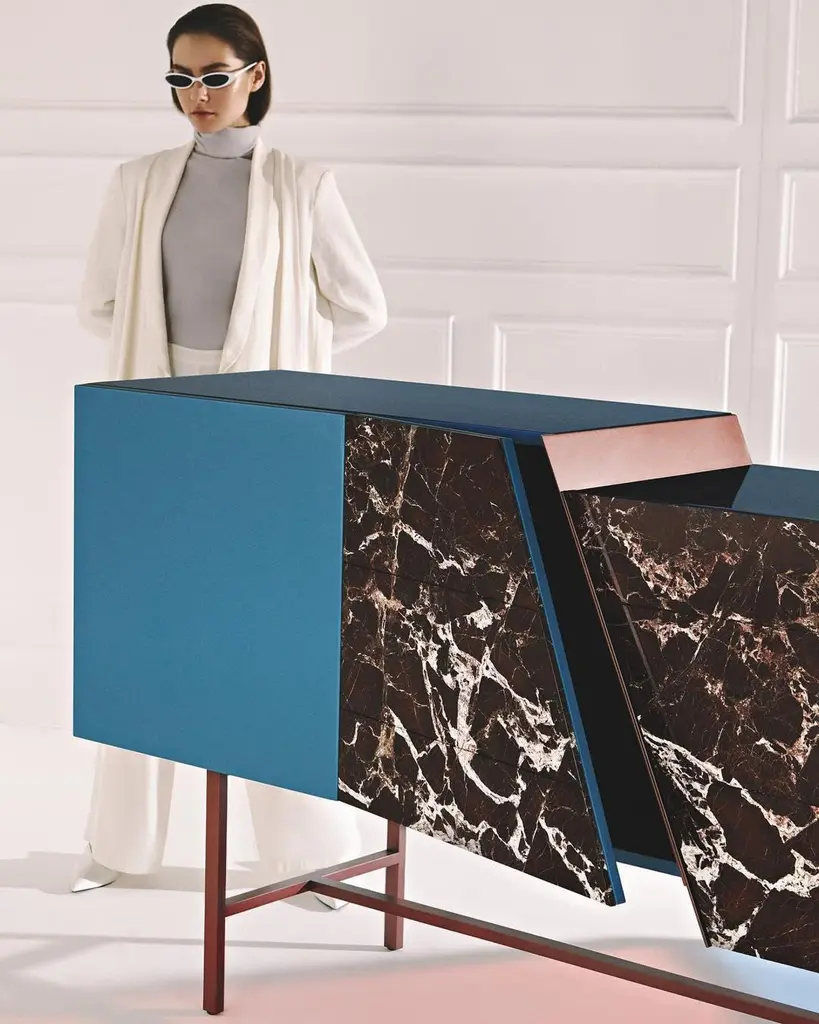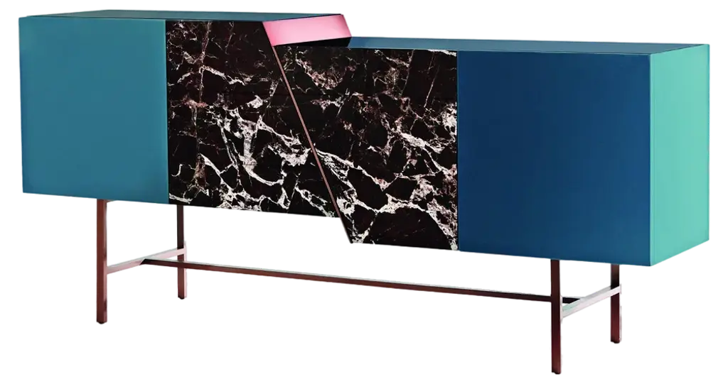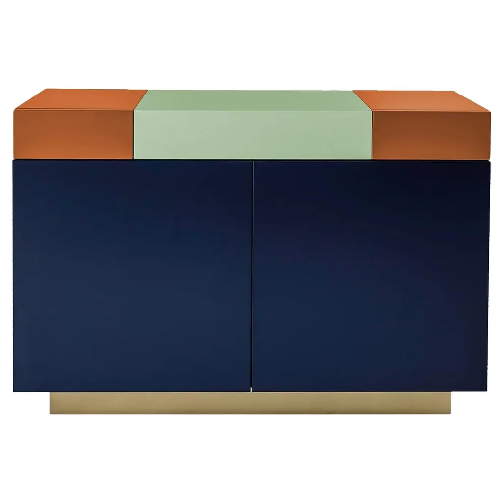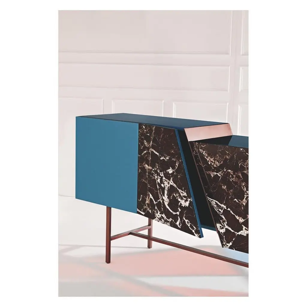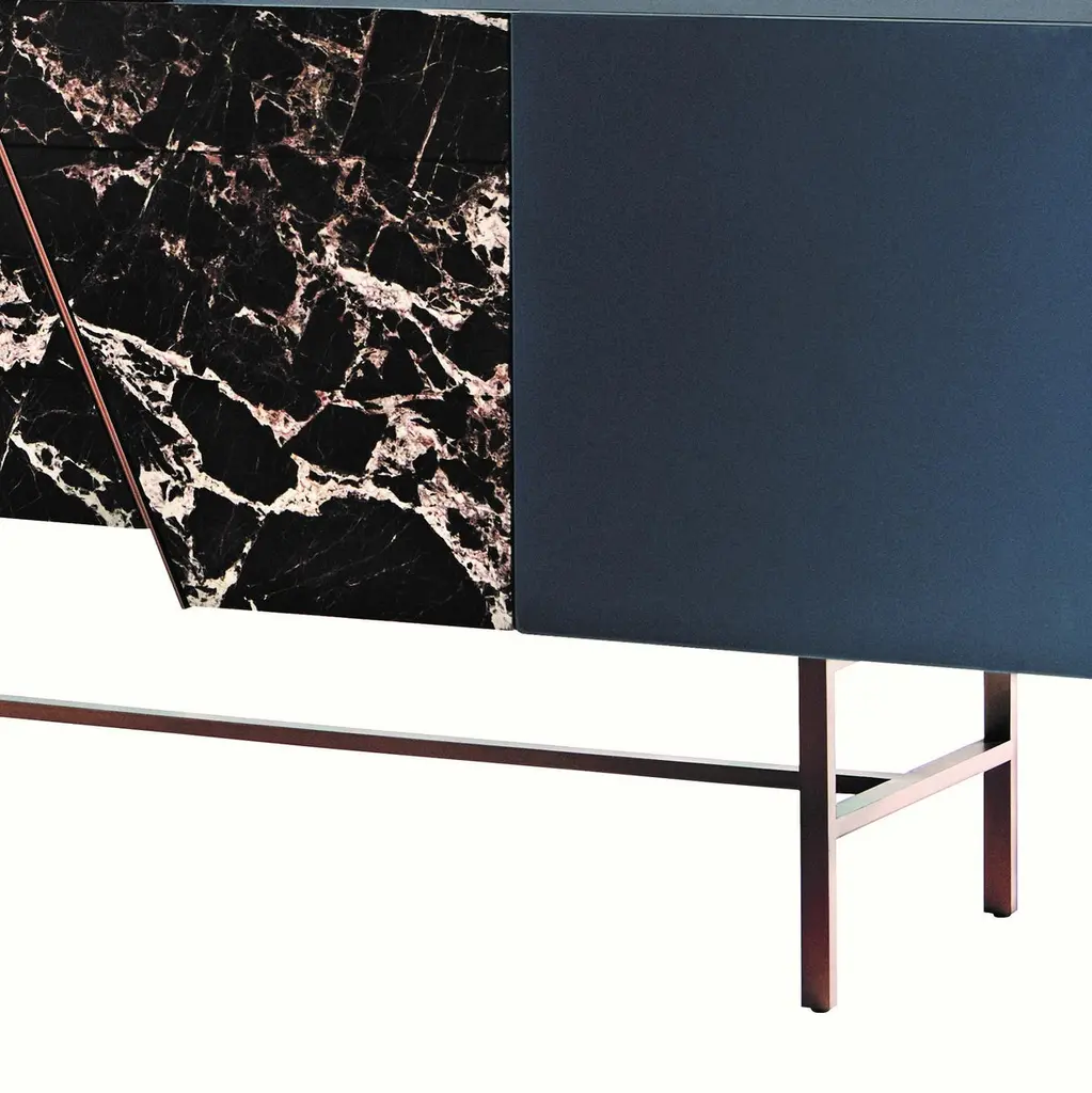Trapeze sideboard by Hagit PincoviciDimensions: 225 L x 50 W x 120 HMaterials: Lacquered wood, Rosso Lepanto Marble, Copper finishHagit Pincovici founded her eponymo us bespoke luxury furniture and lighting atelier in 2014. Known in her earlier work for a rich color and material palette, and a devotion to the geometric forms found in modern art, Hagit has established her practice as one of the foremost among her generation of designers. Since 2019, Hagit has turned her attention to nature, inspired by the botanical forms and striking landscape of her native Israel. Materiality has always played a strong role, from an initial focus on marble, brass, and lacquer to more recent exploration of sandstone and cast aluminum. Her signature clean lines balance out these ‘softer’ materials, highlighting the relationship between the experimental and functional found throughout her oeuvre. For each handmade piece, Hagit collaborates personally and directly with a family of artisans in the heart of the furniture district of Brianza, outside Milan.