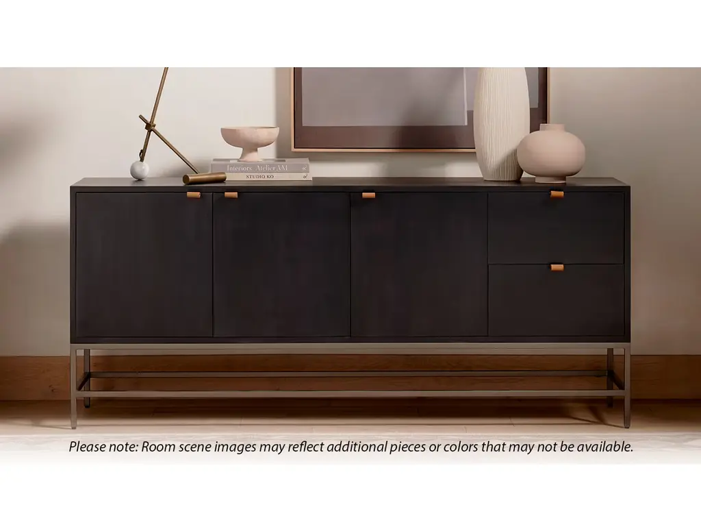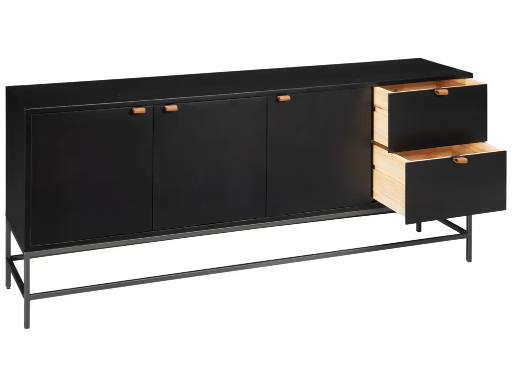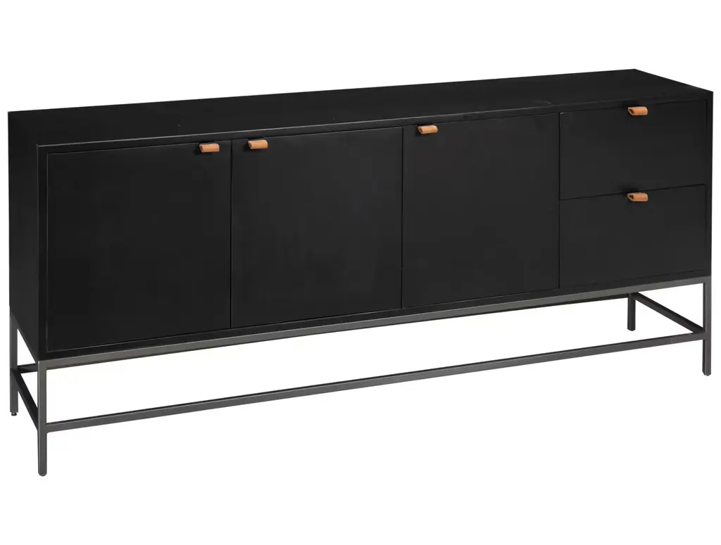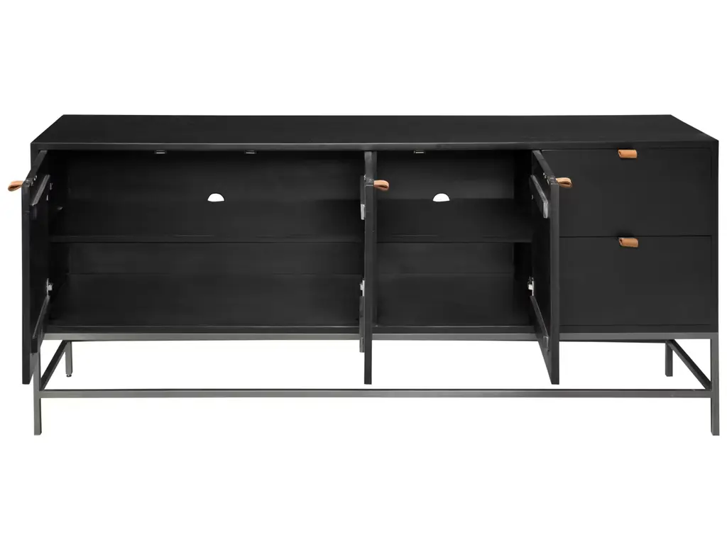 Sleek and stylish, the Trey Sideboard from Four Hands Furniture will bring sophisticated storage to your space with its minimalist profile, and open metal base. Two drawers and three doors with unique suede pull tabs keep you organized in chic style. Inside shelves offer plenty of storage options, and wire cutouts at the back let you organize your electronics.