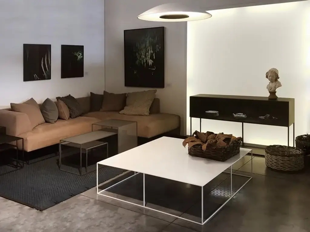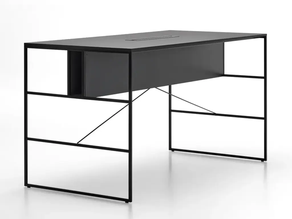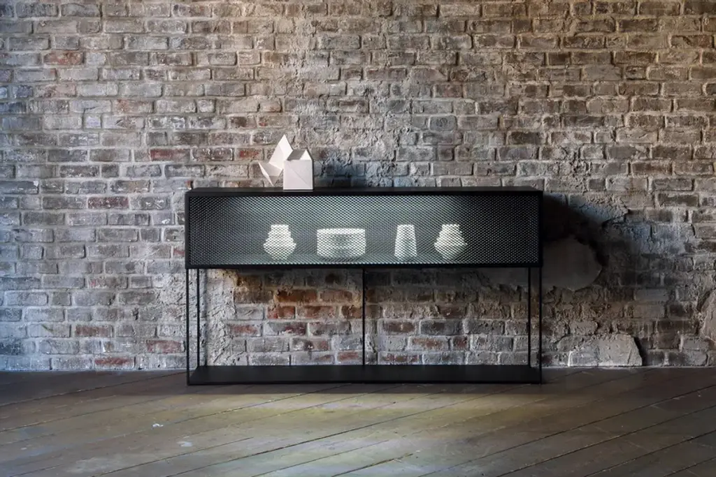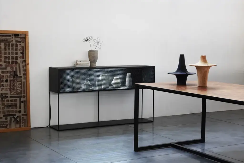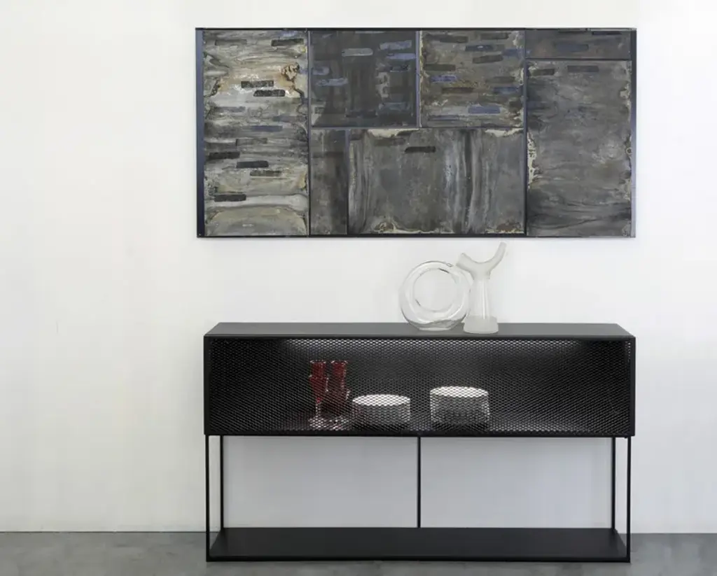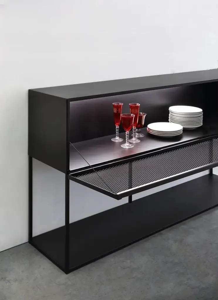 Tristano is a painted metal sideboard with flap doors.Frame and shelves: Copper black sand-touch / Micaceous greyFlap door in expanded metal: Copper black sand-touch / Micaceous greyAvailable version with Strip Led lighting