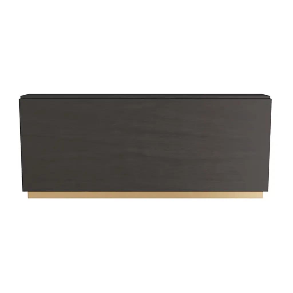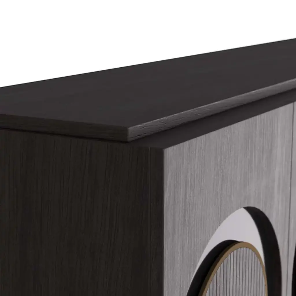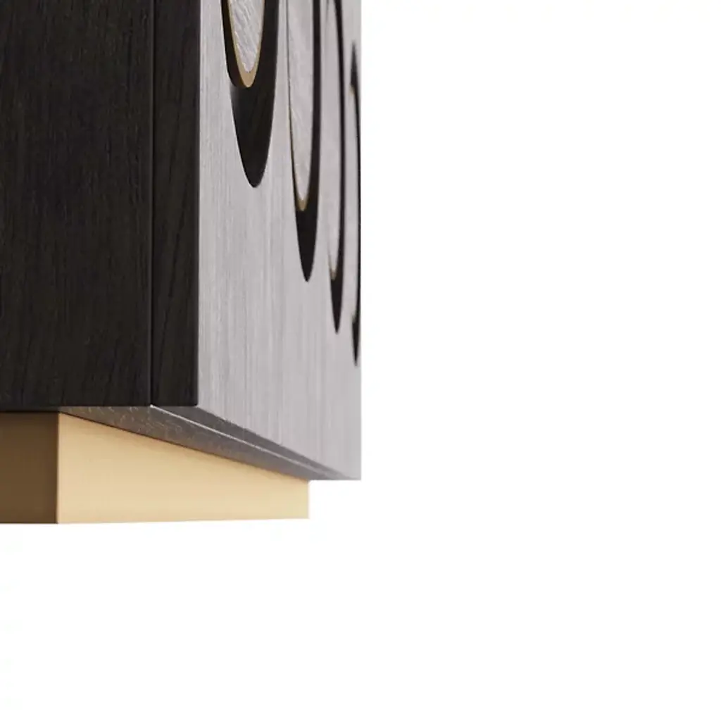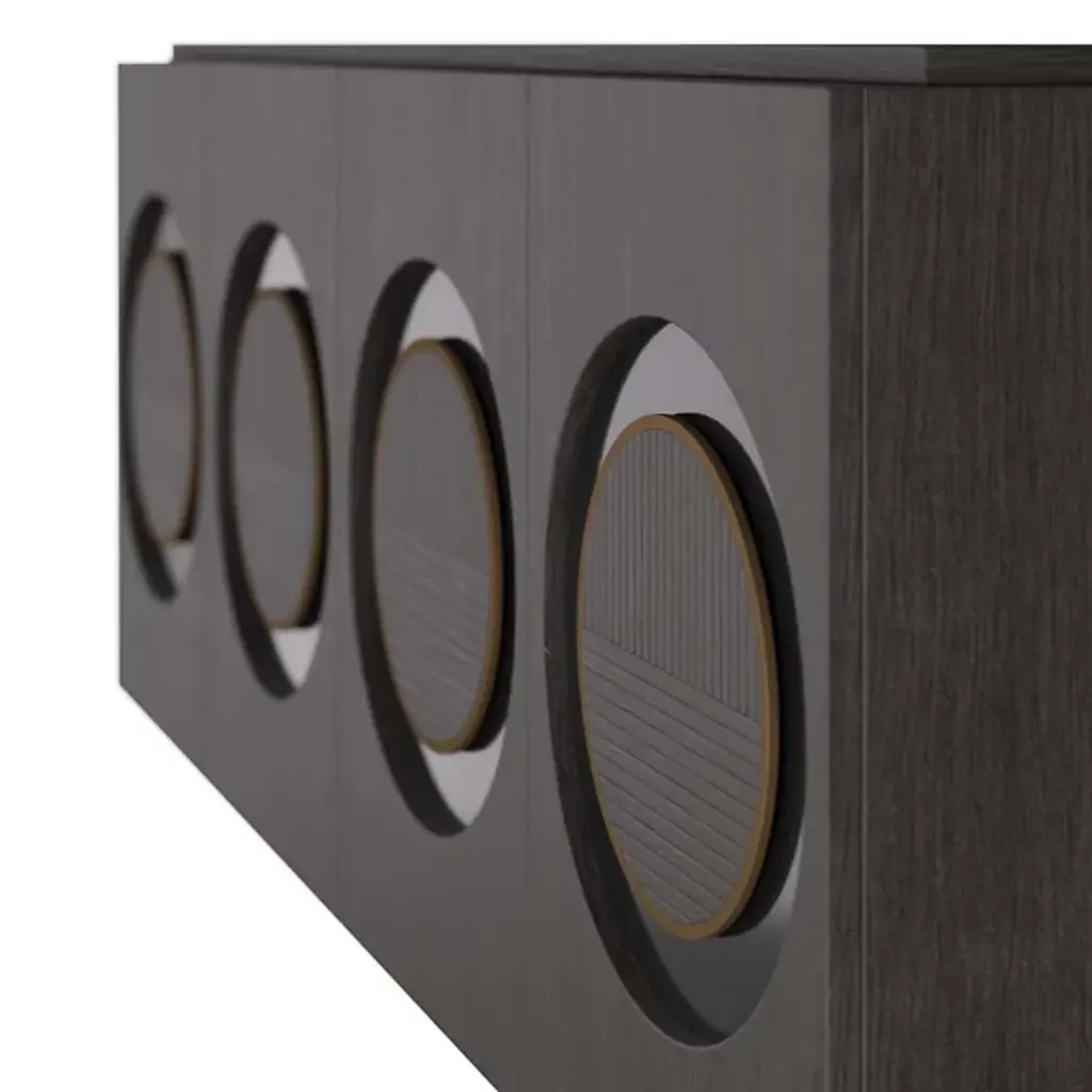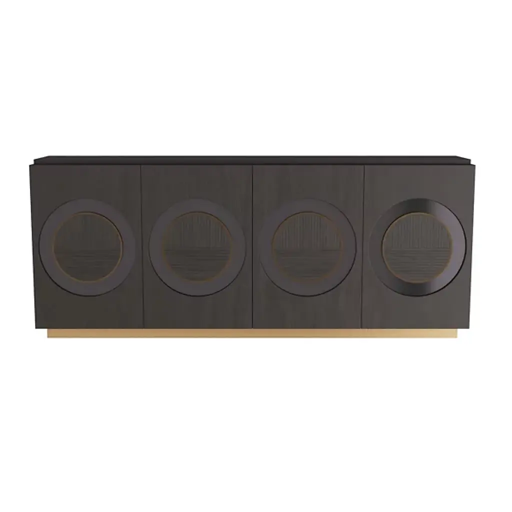 Balanced and bold, the Tudor Credenza from Arteriors adds a prominent, expressive retro character to interiors. A rectangular brass base secures an oak veneer housing above with two adjustable shelves accompanied by four outer doors, each featuring a central circular cutout accompanied by a circular, patterned pull set into it. The contrasting lines on the surface of each central accent are accentuated by a metal rim, adding a rich appeal to the smooth surface of the credenza.