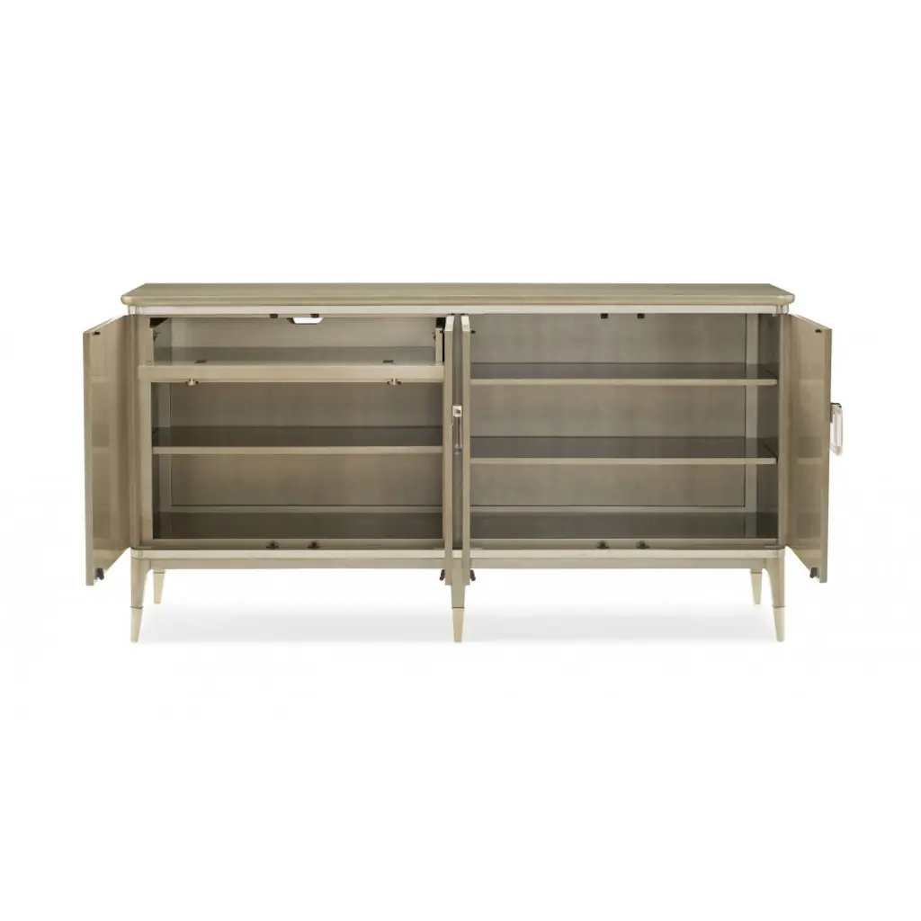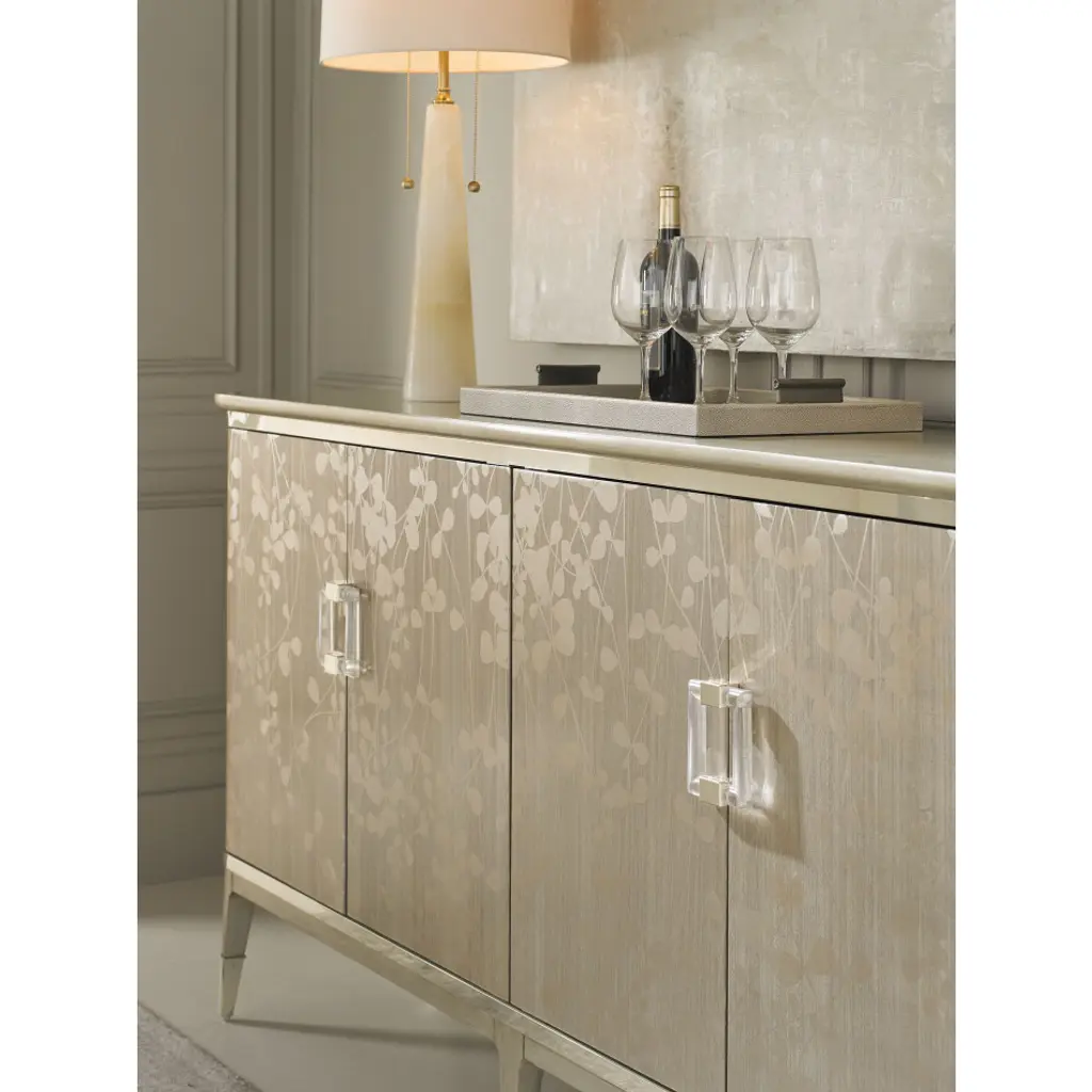 Champagne leaves intertwine in a contemporary, arabesque pattern that wraps round this piece to make it a standout design. The narrow buffet shows off the elegance of Koto wood, finished in glowing Champagne Shimmer. Its radiant aura is perfectly accented with two metallic Whisper of Gold bands and ferrules that add just the right touch of sparkle to this four-door piece with a pull-out, drop down drawer (with cord access) and three adjustable shelves. With elegant detailing, and dramatic custom crystal hardware, this silhouette is perfect for entertaining or as an accent piece that draws your eye to its beauty.