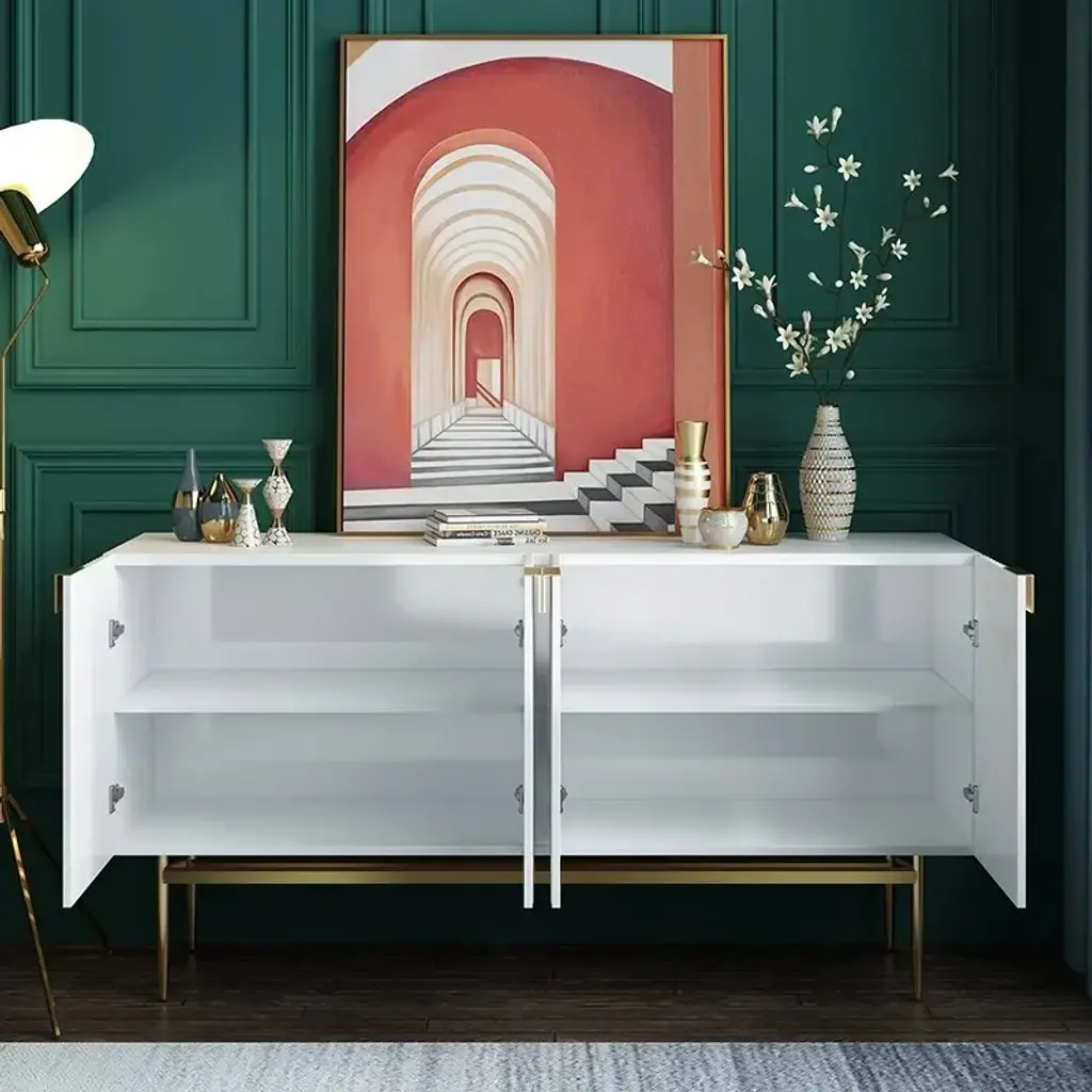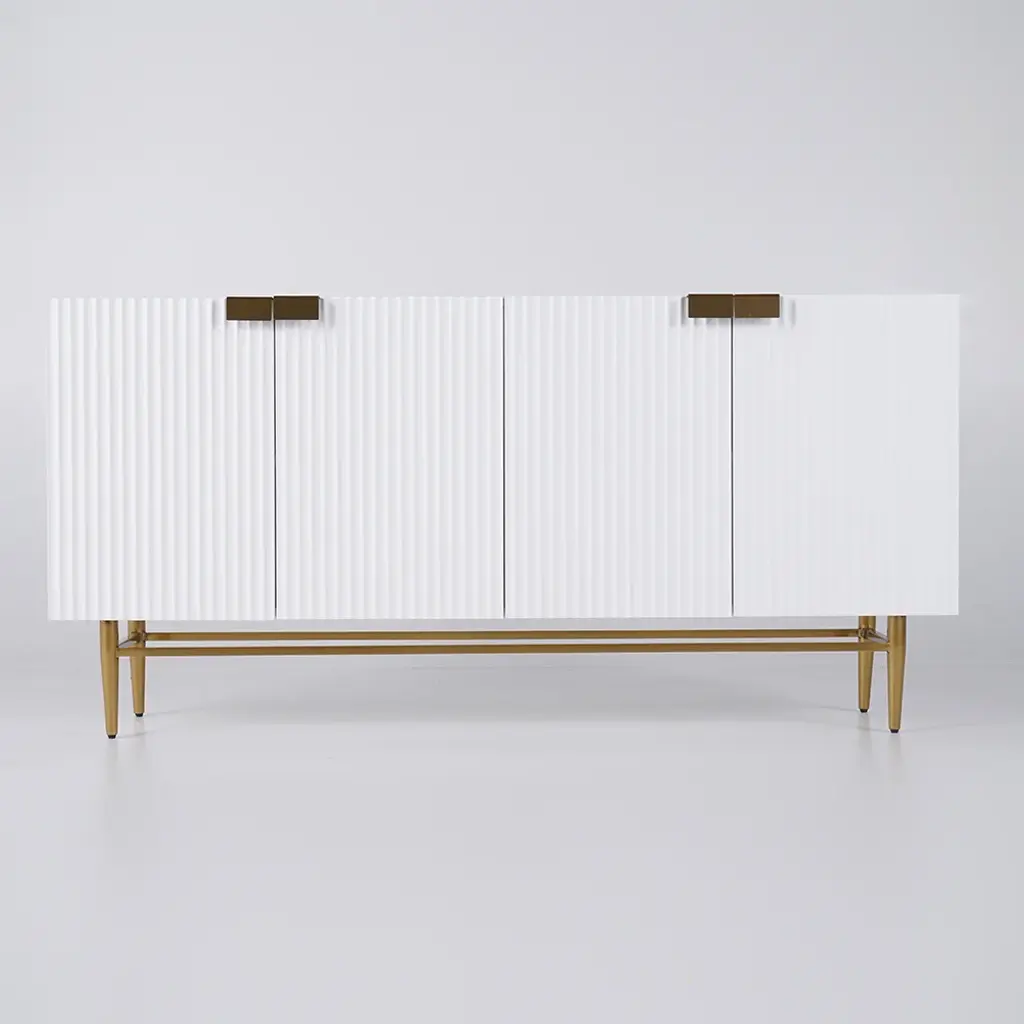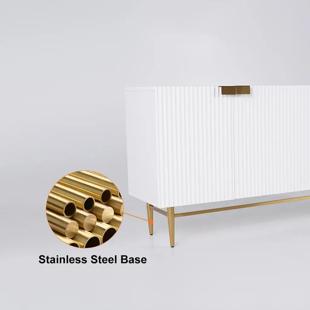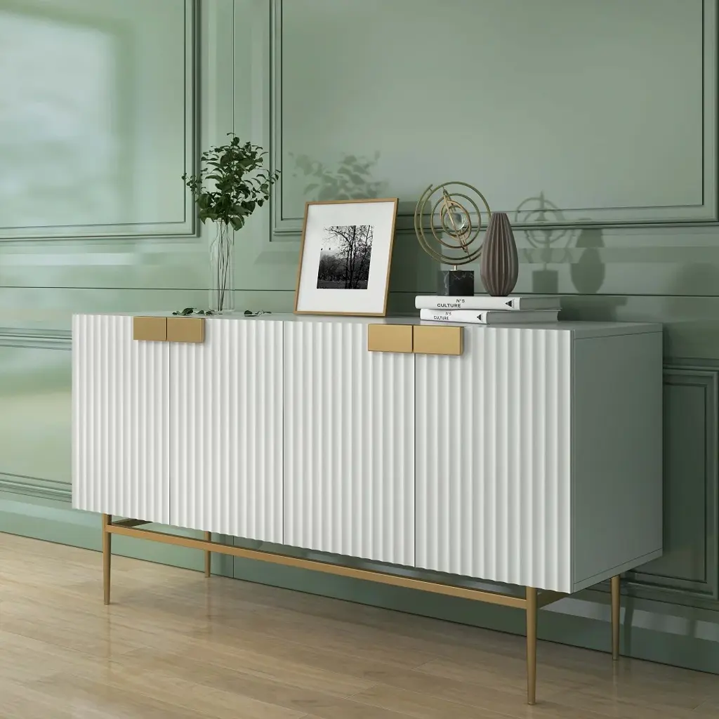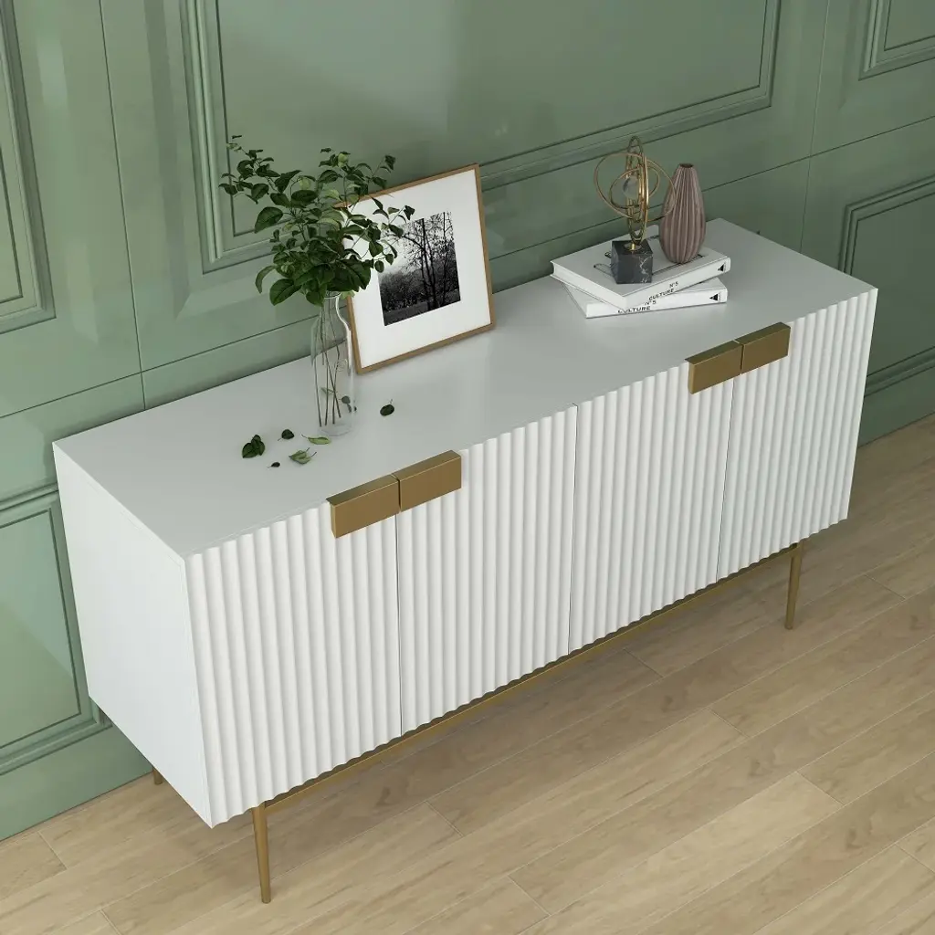 Lending a touch of minimalist, modern appeal to your space, this cabinet showcases a clean-lined silhouette with four tufting style doors. Come with the white and gold hue, it creates an inviting look that complements nearly any layout style. The top is easy to clean and perfect to hold decorative items, while four doors open to reveal generous interior space for a variety of storage options. Try it in the kitchen to store serveware, stemware, and china for special occasions. Or place it in your bedroom to store clothes, towels and more. As versatile as handsome, this piece looks great and adds function to almost any space.