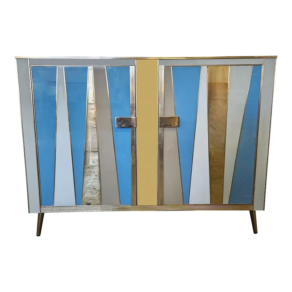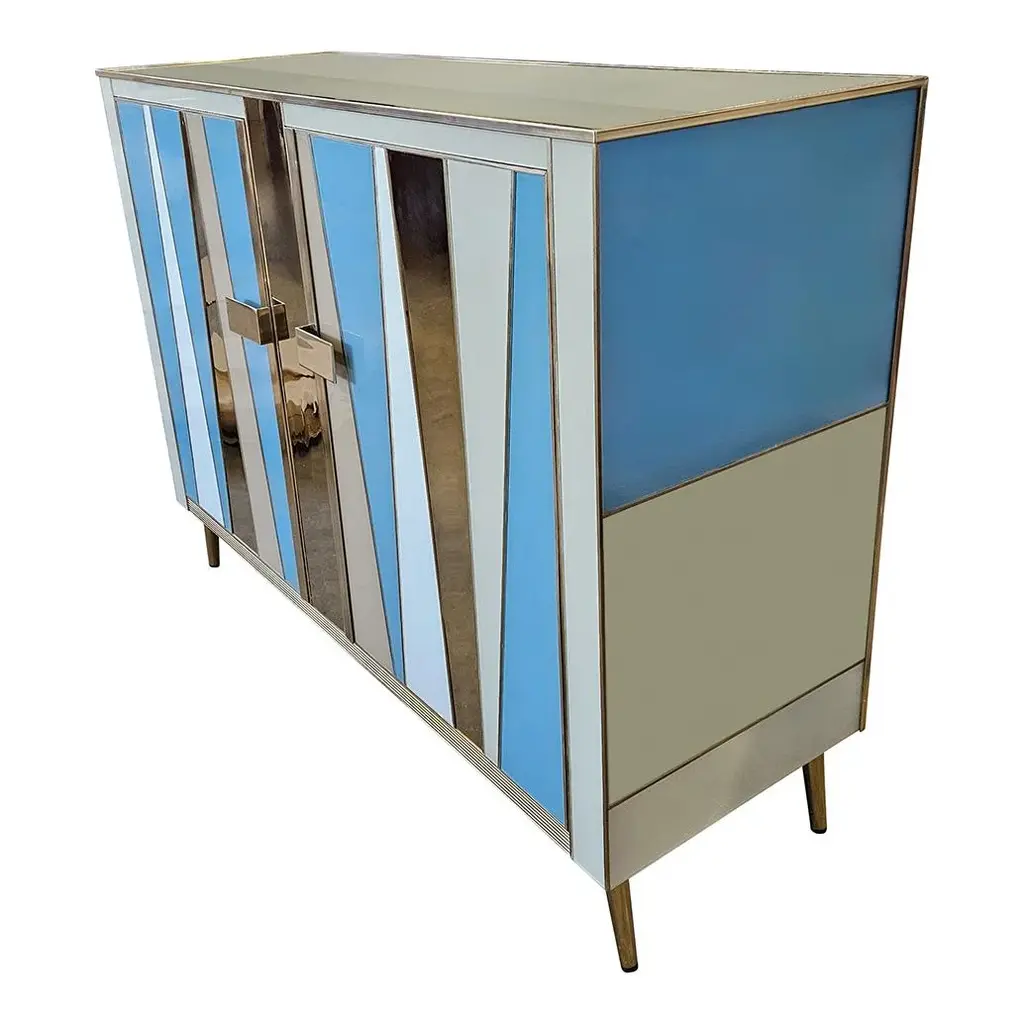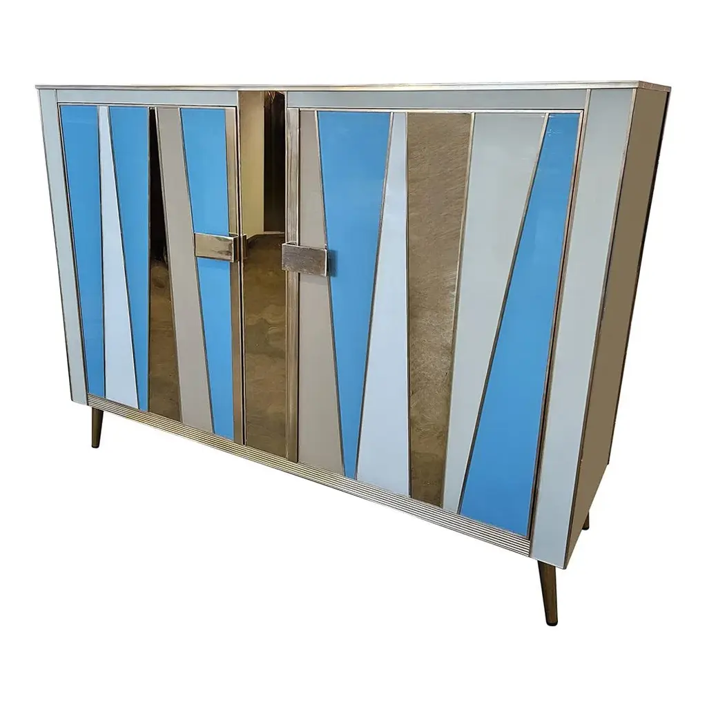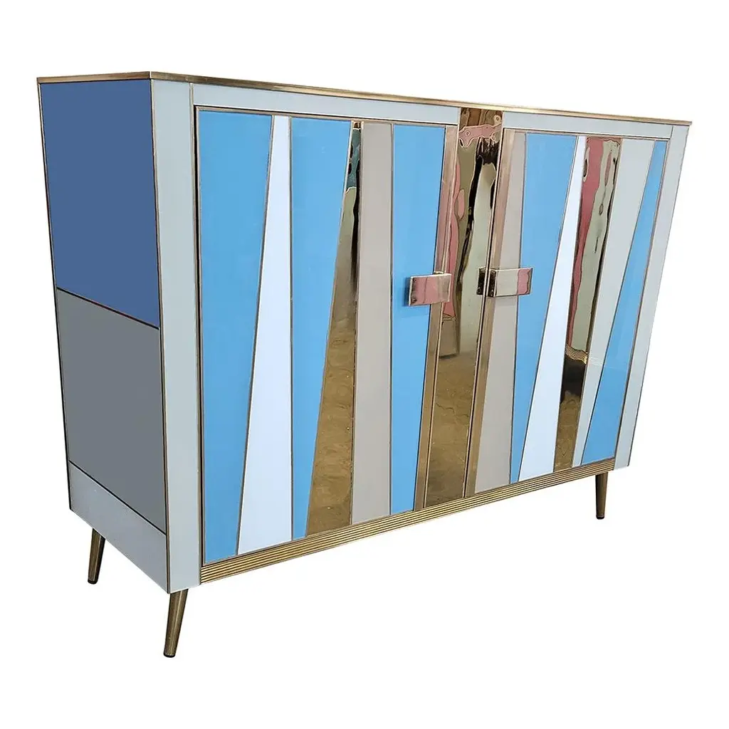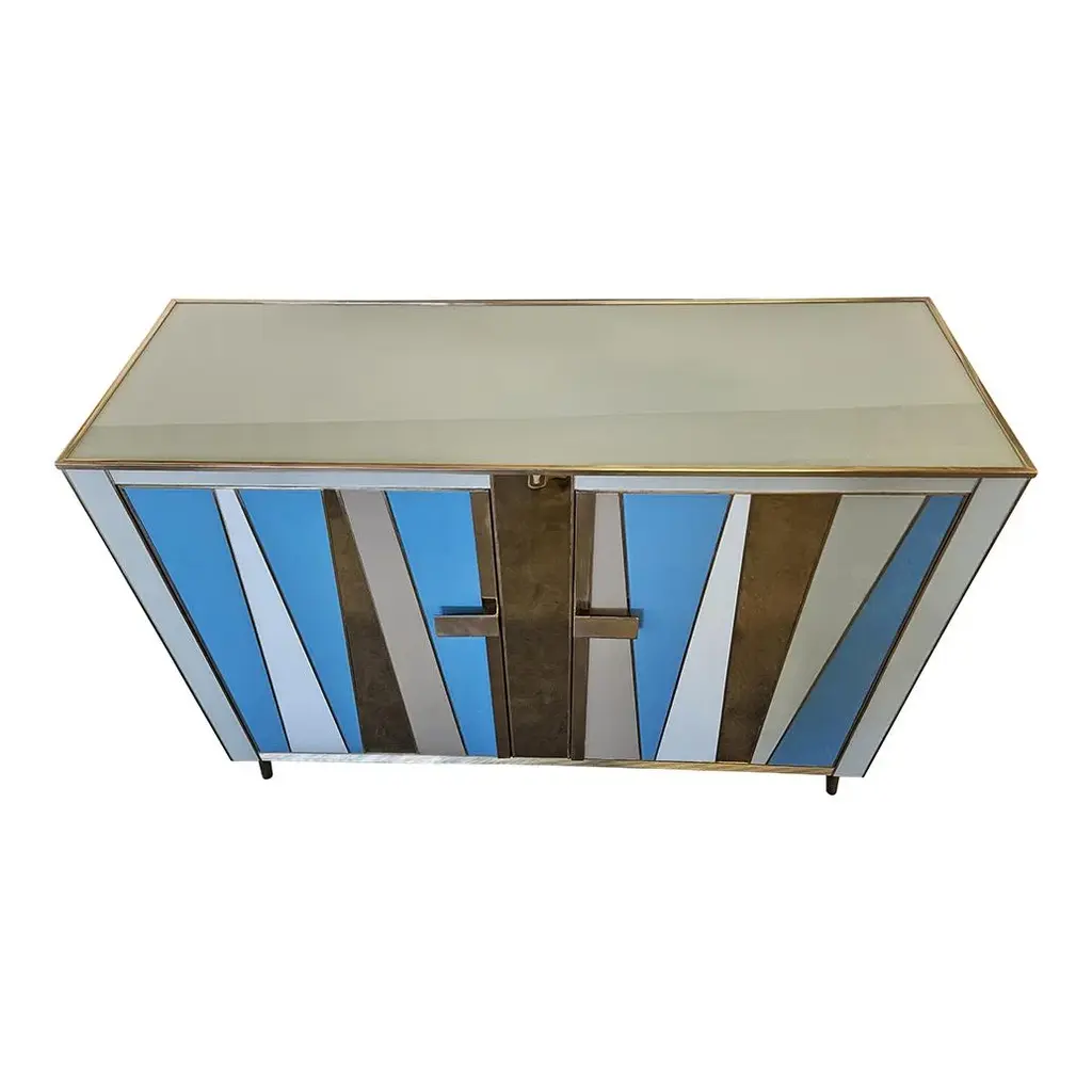 Sideboard with two doors, entirely handmade, with wooden structure and covered in light blue and gray Murano glass; enriched with brass decorations; profiles, handles and feet in golden brass. Glass top. Internal wooden shelf. Dimensions (WxDxH) 123 x 42 x 92 cm
