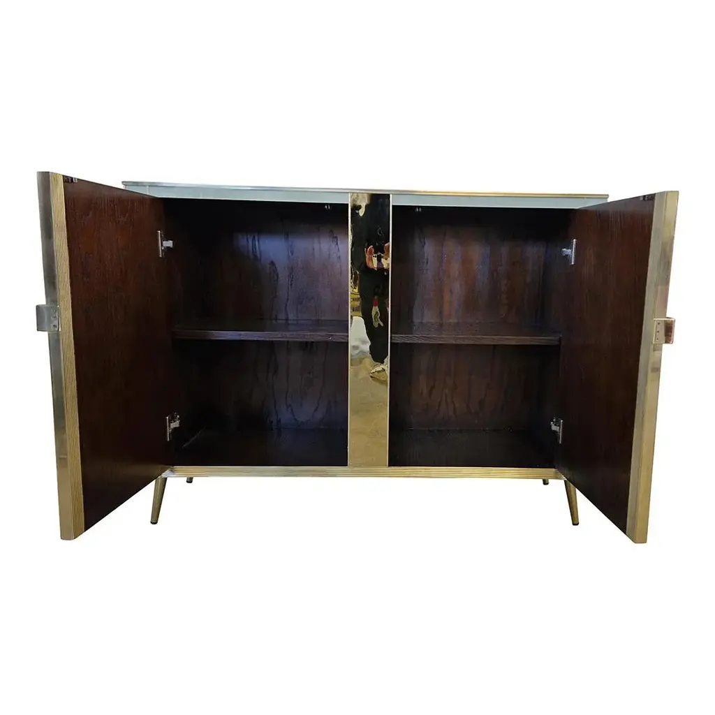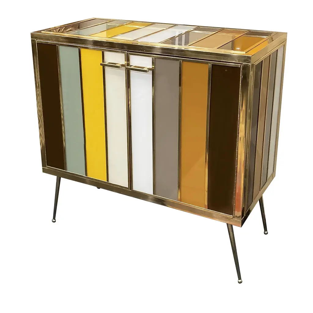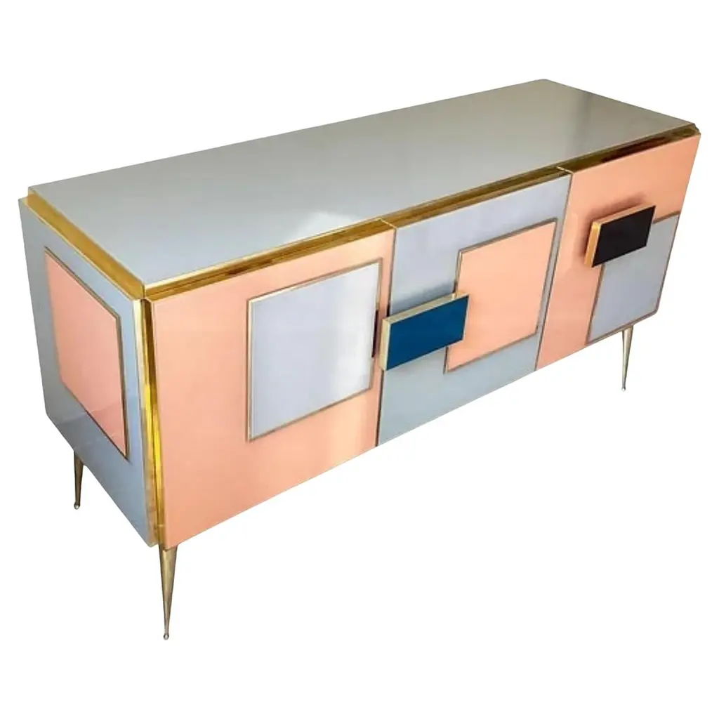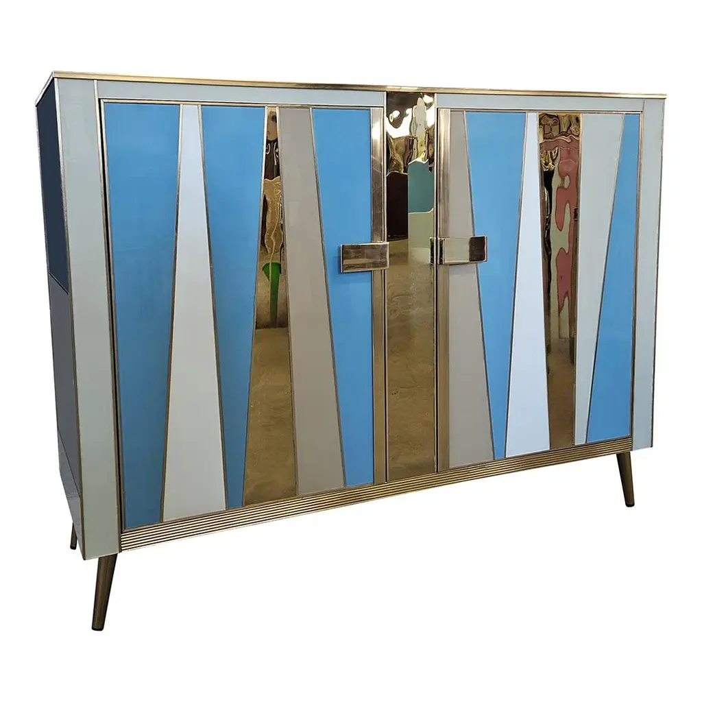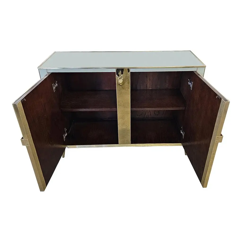 Sideboard with two doors, entirely handmade, with wooden structure and covered in light blue and gray Murano glass; enriched with brass decorations; profiles, handles and feet in golden brass. Glass top. Internal wooden shelf. Dimensions (WxDxH) 123 x 42 x 92 cm