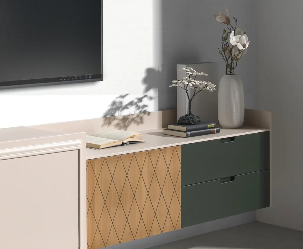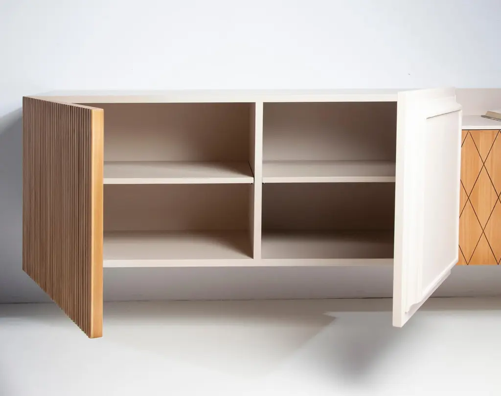 Uka Suspended Sideboard by Lola GlamourDimensions: D 45 x W 227 x H 45 cmMaterials: Wood.We are Félix and Désirée Ramos, brothers and product designers of our brand, Lola Glamour.We are interested in the singular, the different, the beauty, and the balance of color and materials. We have the ability to observe and the ability to translate any beautiful object into a piece of furniture.We are proud of having created our own style, a way of understanding design, which allows us to tell stories and connect with the souls of people and spaces.Lola Glamor is a Spanish company from Soria, which has designed and manufactured unique furniture in noble woods, with artisanal construction and extraordinary finishes since 1995. Artistic furniture that is customized in size and finish according to the client's needs.We offer original furnishing solutions for professionals and individuals from any country in the world, mixing materials, volumes, motifs, and colors that achieve their own style.We are, above all, the sum of a team of people who contribute their dedication and commitment to a unique level of demand, detail, and quality.