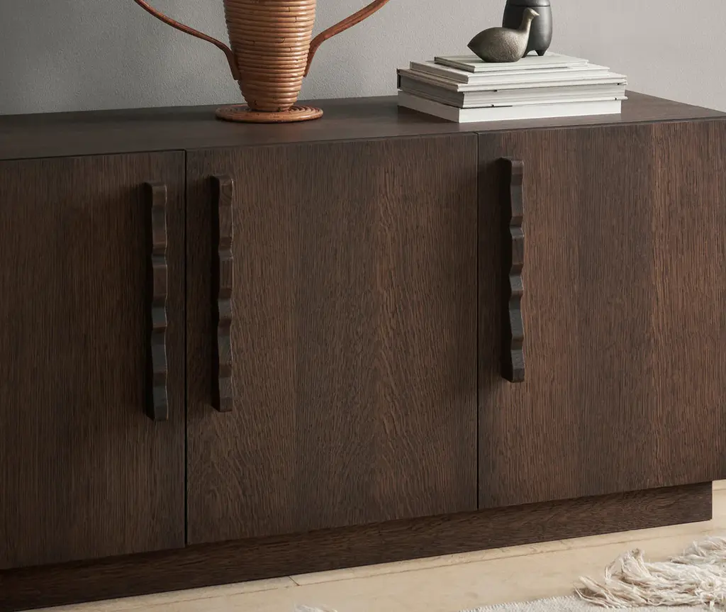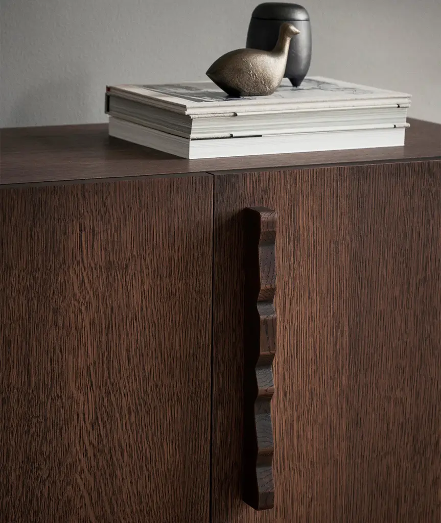 The Unda Sideboard is crafted from a dark stained FSC™ certified oak, embodying a robust and classic aesthetic that stands in contrast to the playful rippled handles. This interplay between practicality and whimsy results in a timeless piece that adapts to any space. The interior shelving of the Unda Sideboard is modular, enabling you to adjust the height based on your storage requirements.
