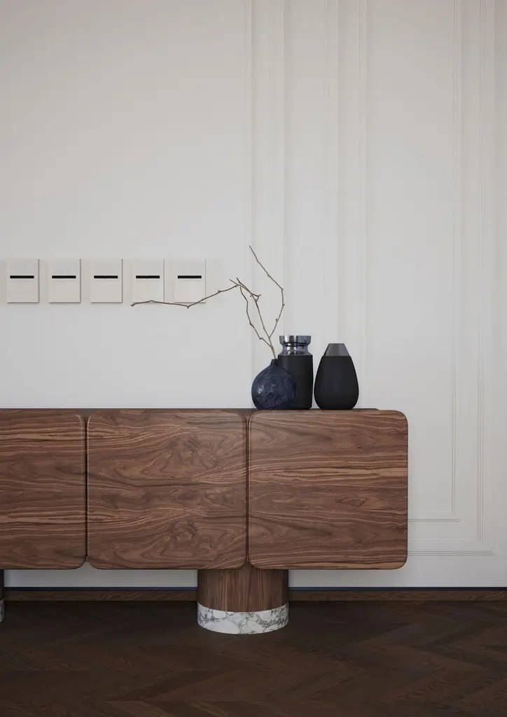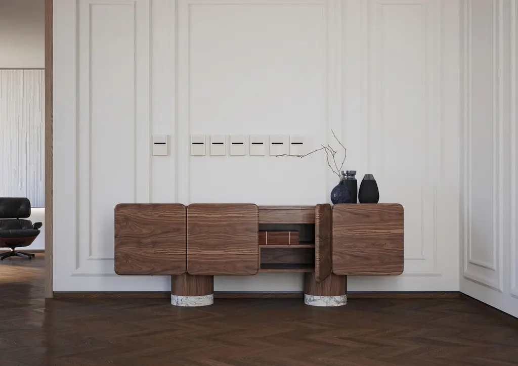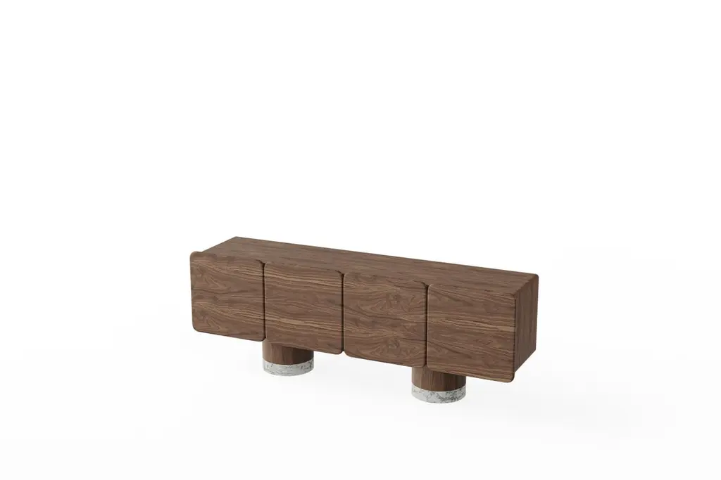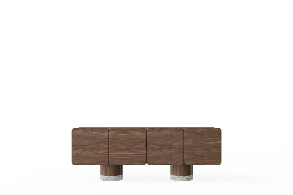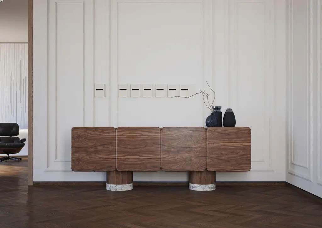 Venus Wood, Black Walnut Sideboard by UltramobiliDimensions: W 225 x D 53 x H 83 cmMaterials: Black Walnut, Marble feet. 4 sculptural doors sideboard in Black Walnut / Noce Canaletto particular wide veneer and massive. Soft-closing hinges. Internal drawer and shelves. Marble feet.Ultramobili:Tactile materials and exclusive finishes, advanced functionality and uncompromising quality define the character and soul of each creation, the best business card with which ULTRAMOBILI furnishings present themselves to the world. ULTRAMOBILI collaborates with a group of highly selected craftsmen, closely connected to their home territory, Pesaro. It is from their manufacturing skills that all the brand's furnishings take shape, in a continuous exchange of skills that focuses on design ability and the intelligence of the hands. ULTRAMOBILI employs an international team of designers who every day imagine, design and create - with talent and passion, dedication and visionary spirit - all the brand's furniture: architectural sculptures that become iconic objects and furnishings for living. ULTRAMOBILI's credo is quality without compromise. An uncompromising vision that expresses itself every day in the choice of excellent materials and finishes, in the obsessive care for every single detail, in the constant search for advanced functionality and in the incessant striving for cutting-edge, unique and unmistakable design. ULTRAMOBILI also produces tailor-made projects, ad hoc creations capable of meeting the most intimate and profound needs of those who enter the brand's universe. Bespoke furnishings that are born in close connection with the architectural envelope that houses them, and that dialogue with the surrounding environment in the volumetric relationships of their components, in the materiality and colour nuances of the materials, in the chiaroscuro effects of the volumes and in the visual communicativeness that distinguishes them.