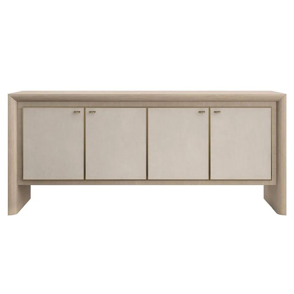 With a subtle contrast of light tones and textures, the Unity Credenza introduces an elegant modern aesthetic to living, dining, and home office interiors. Its clean-lined form is quietly accentuated by a Sun Drenched Oak finish and rounded bevel, framing soft-close doors wrapped in vinyl. Lucent Bronze metal trim adds warmth and a hint of shimmer. Completing this calming collective of materials and finishes: an Almost White-painted interior with adjustable shelves for versatile, tucked-away storage.