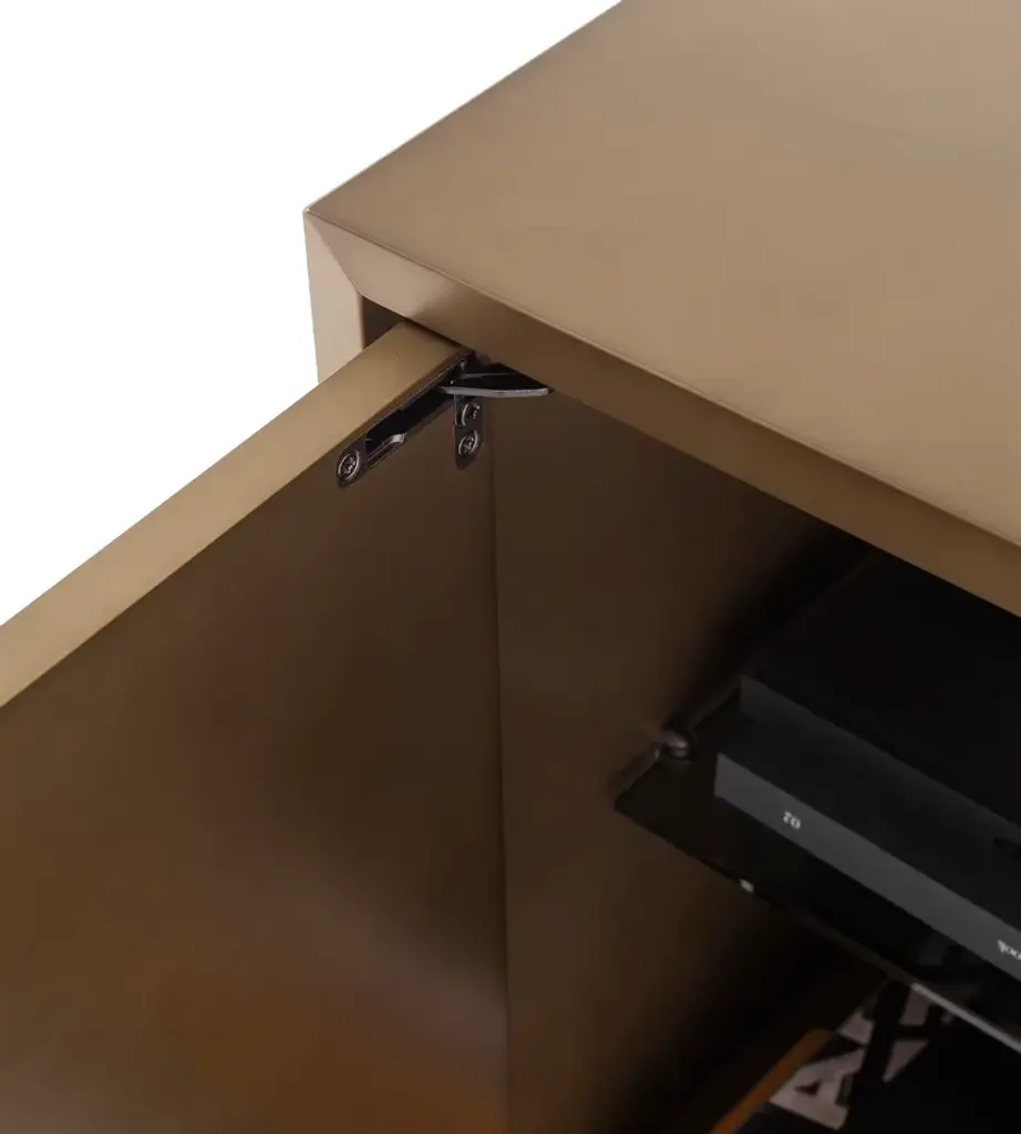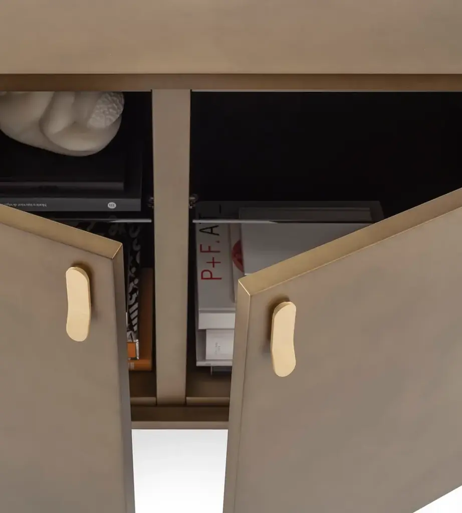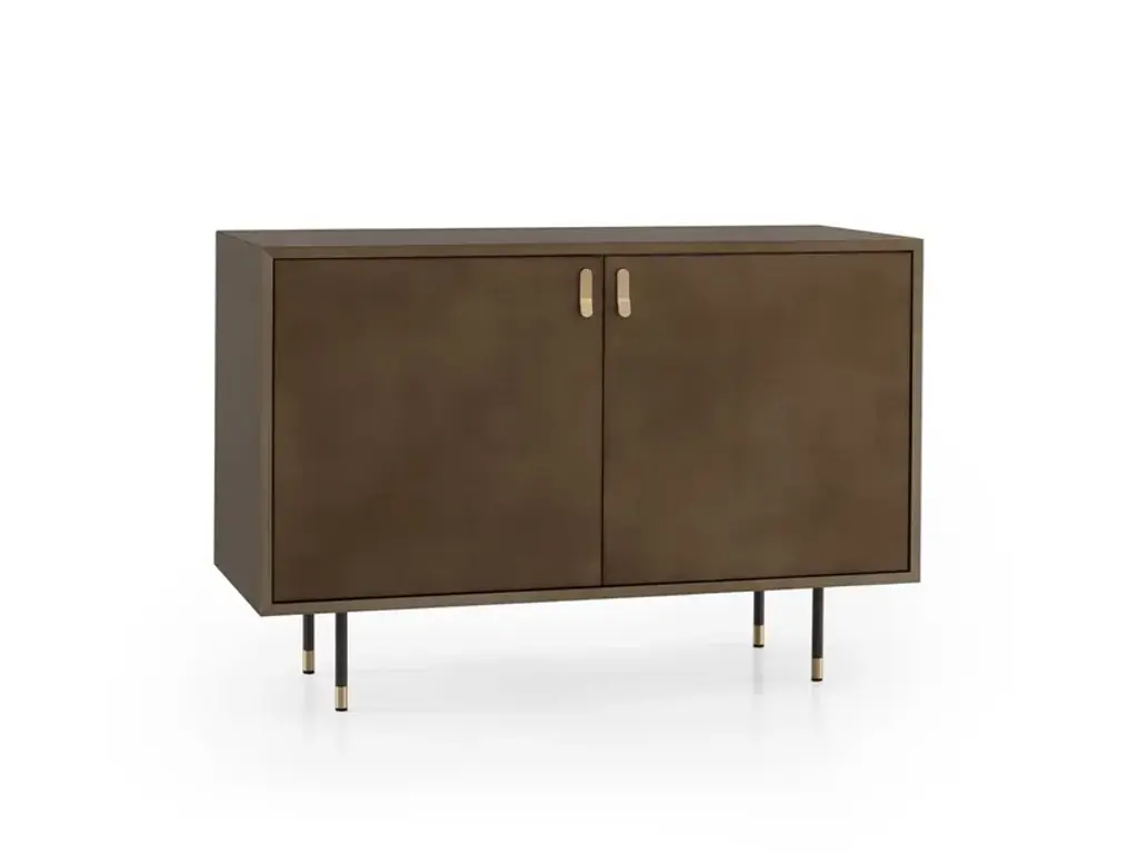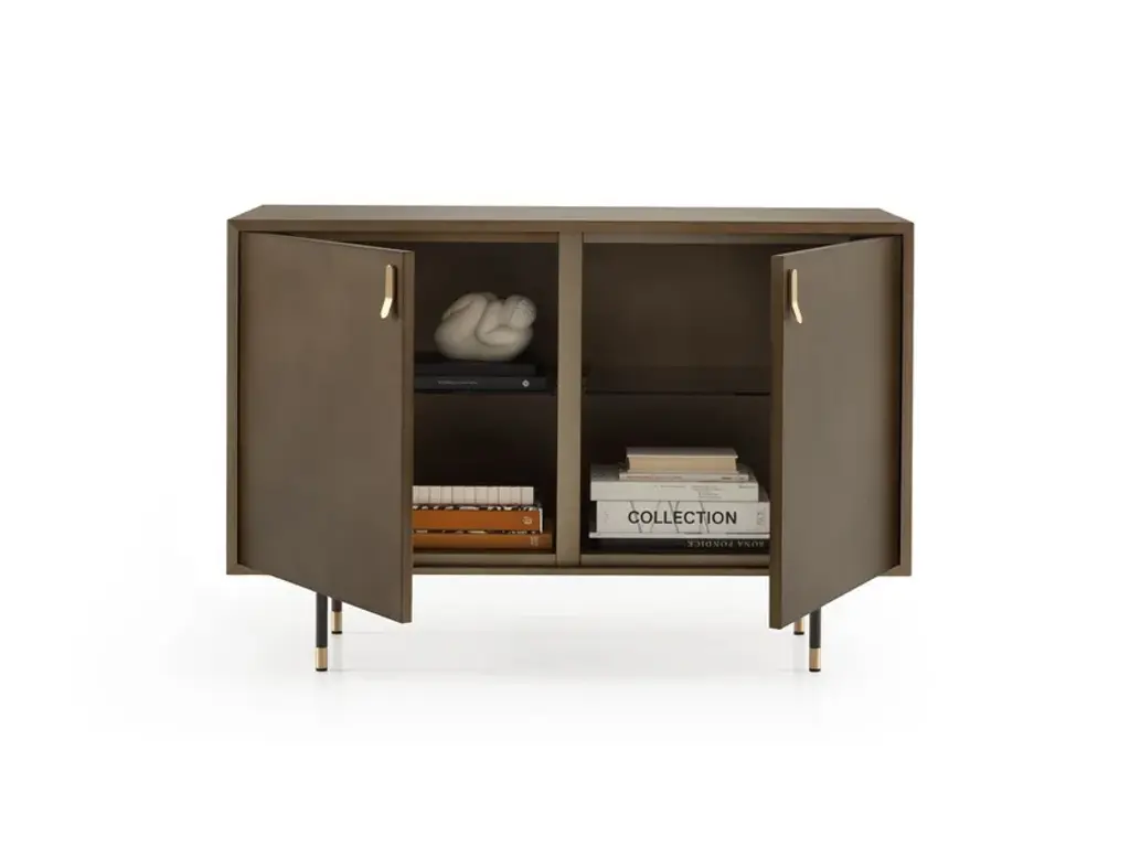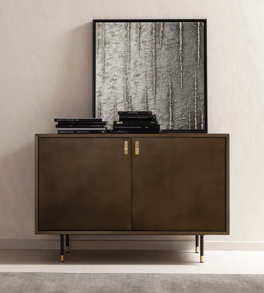 Universe 2 doors is a sideboard that captures attention with the shimmering depth of its finish. The oxidized bronze, with its cloud-like shades, evokes the elegance of metal surfaces shaped by the elements.Details2-door sideboard in MDF with a clouded metallic effect finish and brass handles. Two internal shelves in 6 mm transparent smoked glass with adjustable supports. Burnished metal frame with brass detail. Soft-close burnished hinges. Optional additional shelves available upon request.The Enjoy Collection is Morica Design’s most sparkling, dynamic collection. The items are lively, inspired by nature, and find their soul in the pastel shades that blend and play with the wood in an original, fresh manner. The distinctive feature of Enjoy Collection is the use of color, declined in functional furnishings and contemporary mood. Modern and refined products made with high quality materials and handcrafted in Italy.