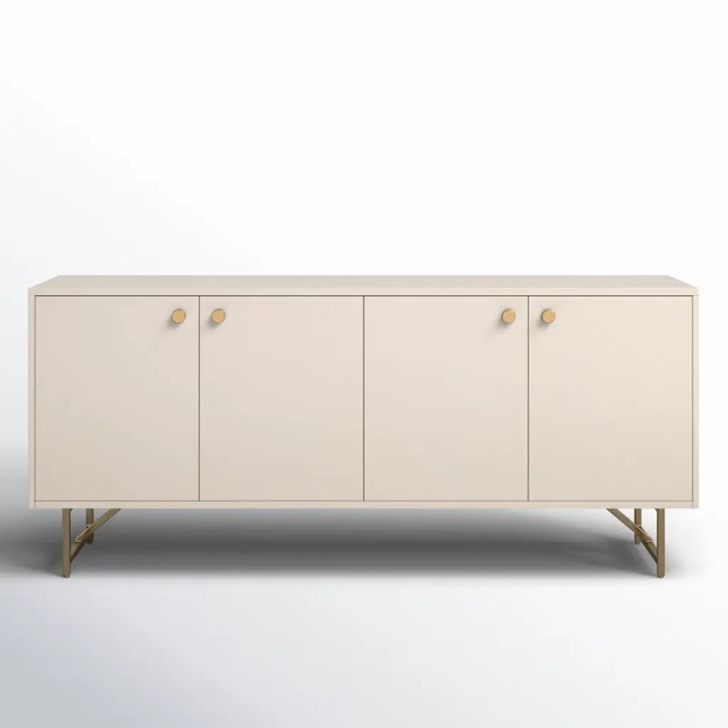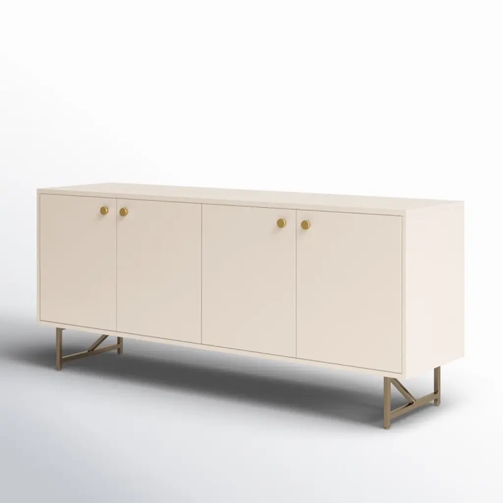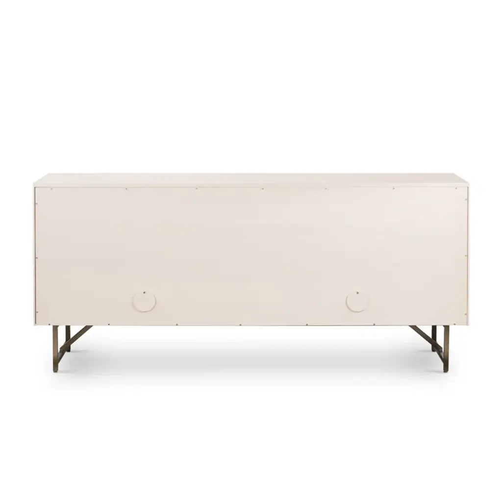 Finished in a versatile off-white, an engineered hardwood dresser offers ample storage for serving ware, table linens and more, with golden brass-finished iron hardware and a stainless steel base. Rear cutouts for cord management.