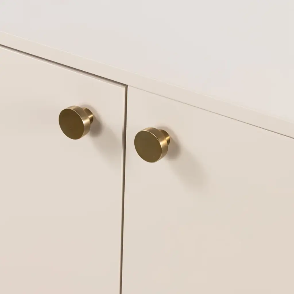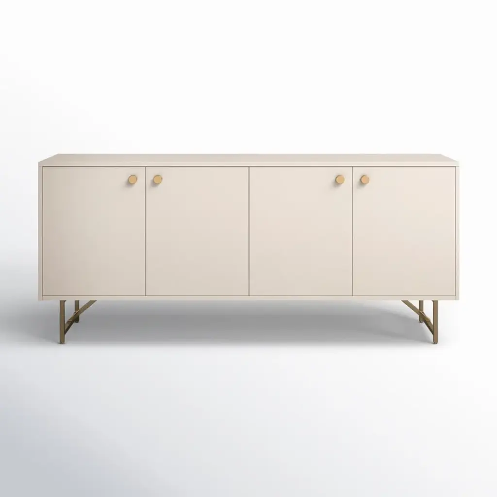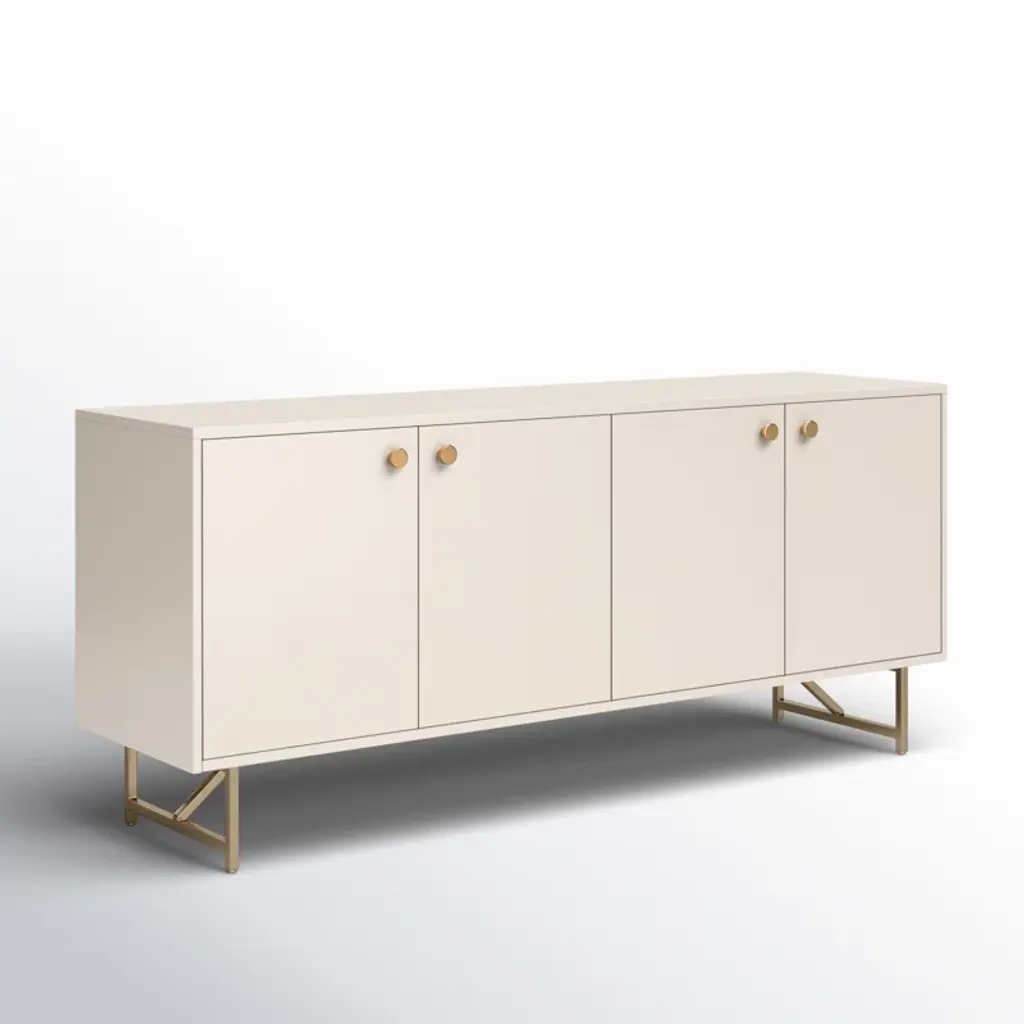 Finished in a versatile off-white, an engineered hardwood dresser offers ample storage for serving ware, table linens and more, with golden brass-finished iron hardware and a stainless steel base. Rear cutouts for cord management.