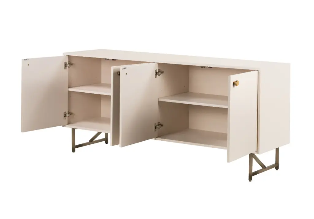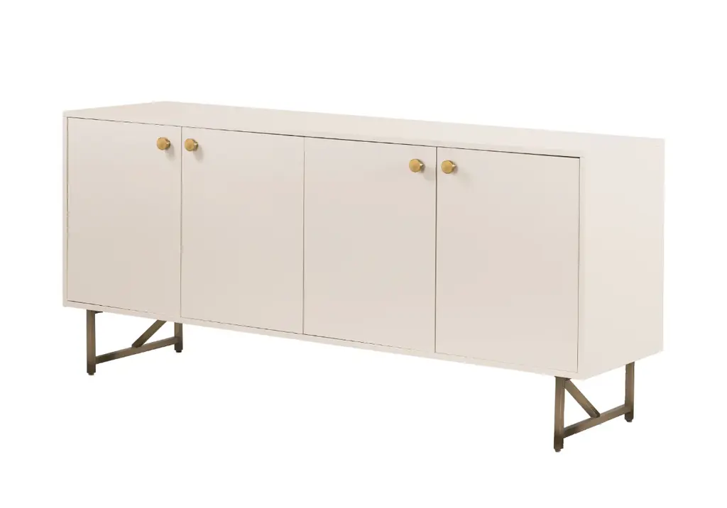 Versatile and classic, the Van Sideboard styles easily in dining or living rooms. Its elongated, clean-lined form is elevated by its off-white color and aged brass hardware for a light, airy look. Two shelves of hidden storage easily stow cords, electronics, dishes, or serving ware.