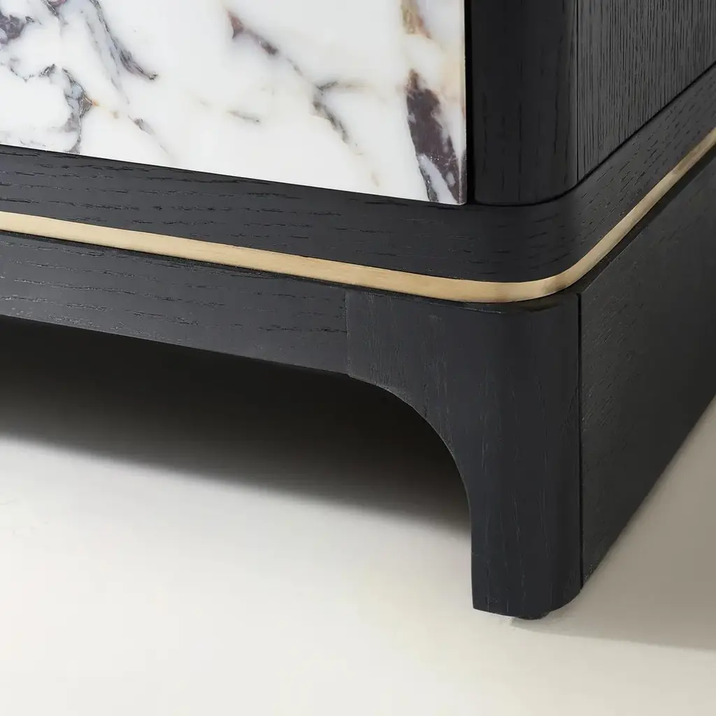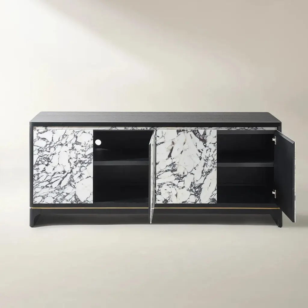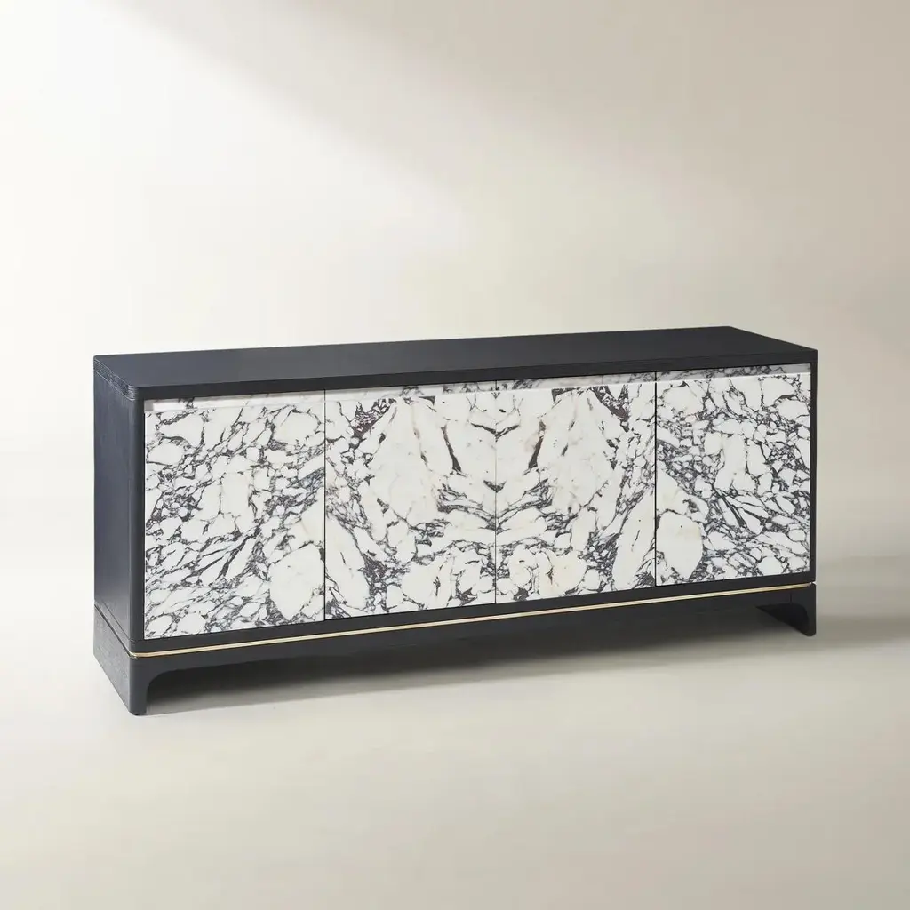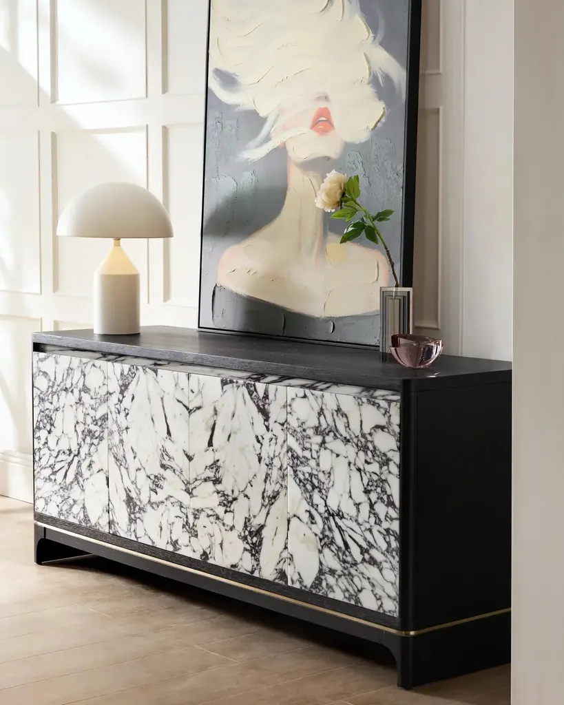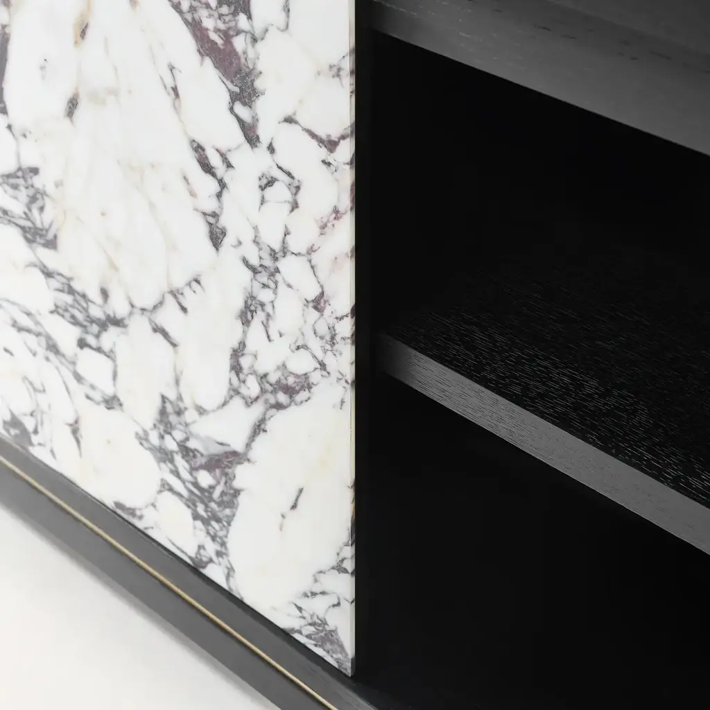 The Vanta Sideboard turns functionality into fine art. Framed in matte black oak veneer and fronted with genuine Calacatta Viola marble, this luxury marble buffet brings bold contrast to tailored interiors. Each marble panel is one of a kind, showcasing violet veining that ripples across a luminous white base—rarer and more expressive than classic Calacatta. Sleek sharknose finger pulls are carved directly into the stone, creating shadow-lined grooves that feel sculptural and intuitive. Concealed storage waits behind each door, opening with a whisper-soft touch.ZG Exclusive