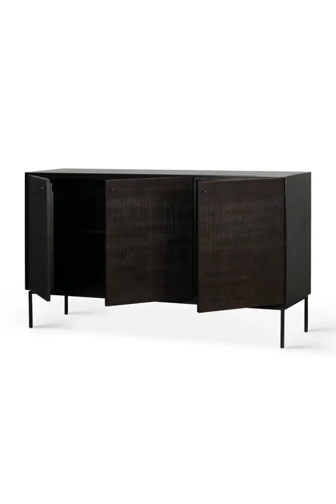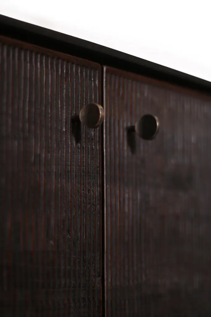 The Varnished Teak Black Sideboard is meticulously crafted with beautiful dark tinted teak and offers spacious shelves concealed behind wooden doors. Every single line you see is hand carved, making each piece truly unique. Small imperfections are part of the story, even more so: they enhance Ethnicraft Grooves' character. The result is a slightly different surface every time, each with its own rhythm and dynamics. Download Technical Line DrawingDownload Care Instructions