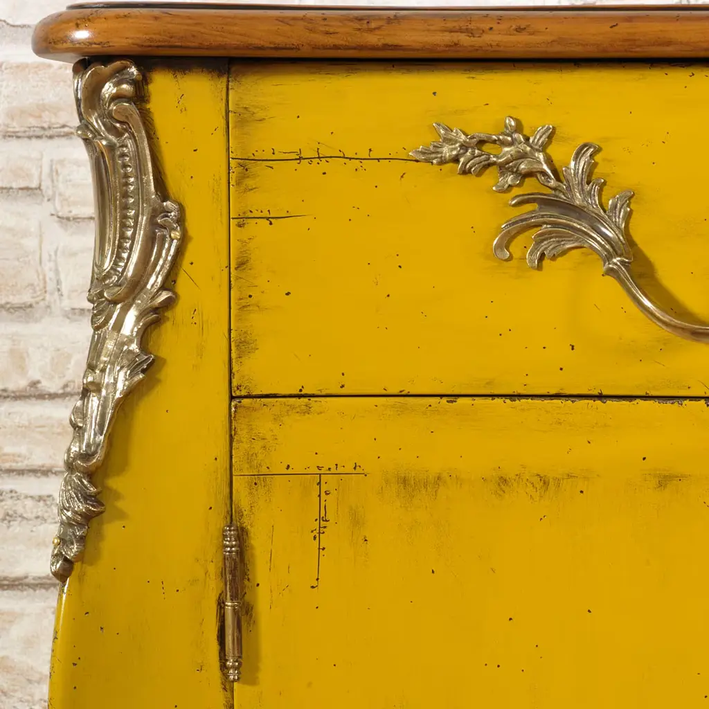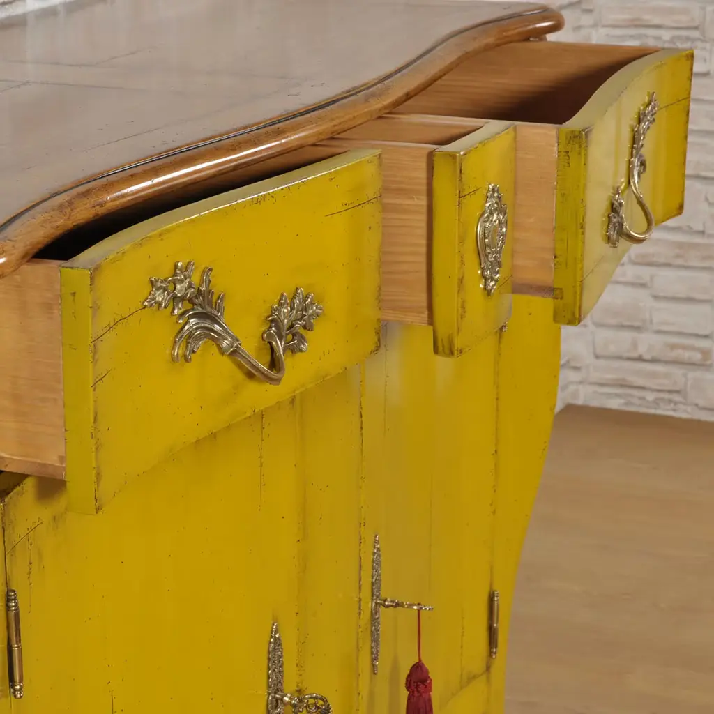 Exclusive brass details coupled with a sinuous structure lacquered in vibrant yellow characterize plush Venetian furniture from the 18th century that this Louis XV-style artisan sideboard celebrates. Equipped with a couple of doors and drawers that add to a secret one, it flaunts a superb antiqued finish patiently carried out by hand also using dust from brown soils. Contact the Concierge for customization options.
