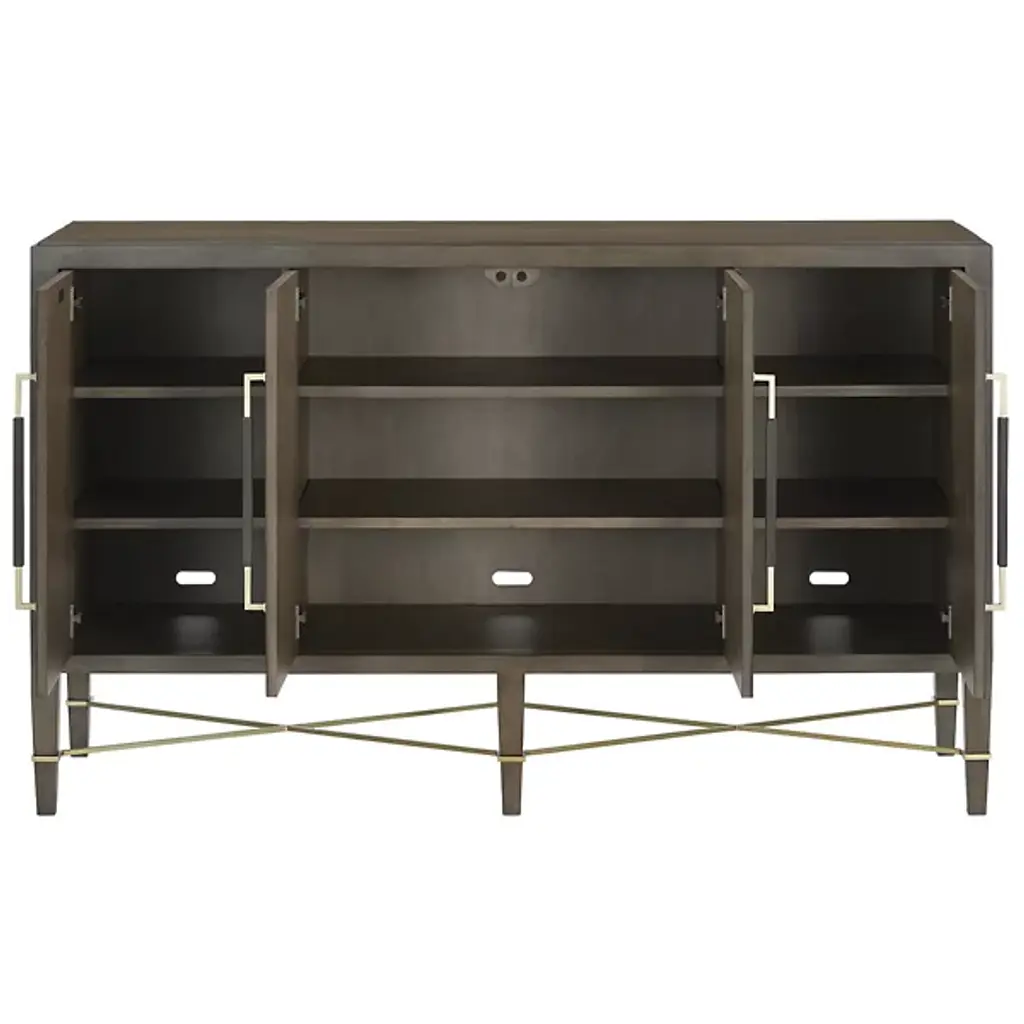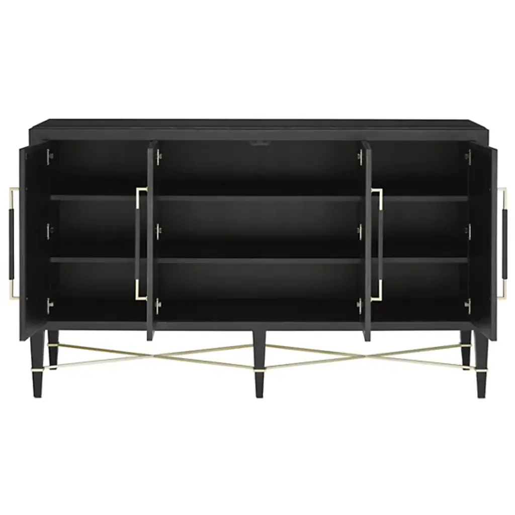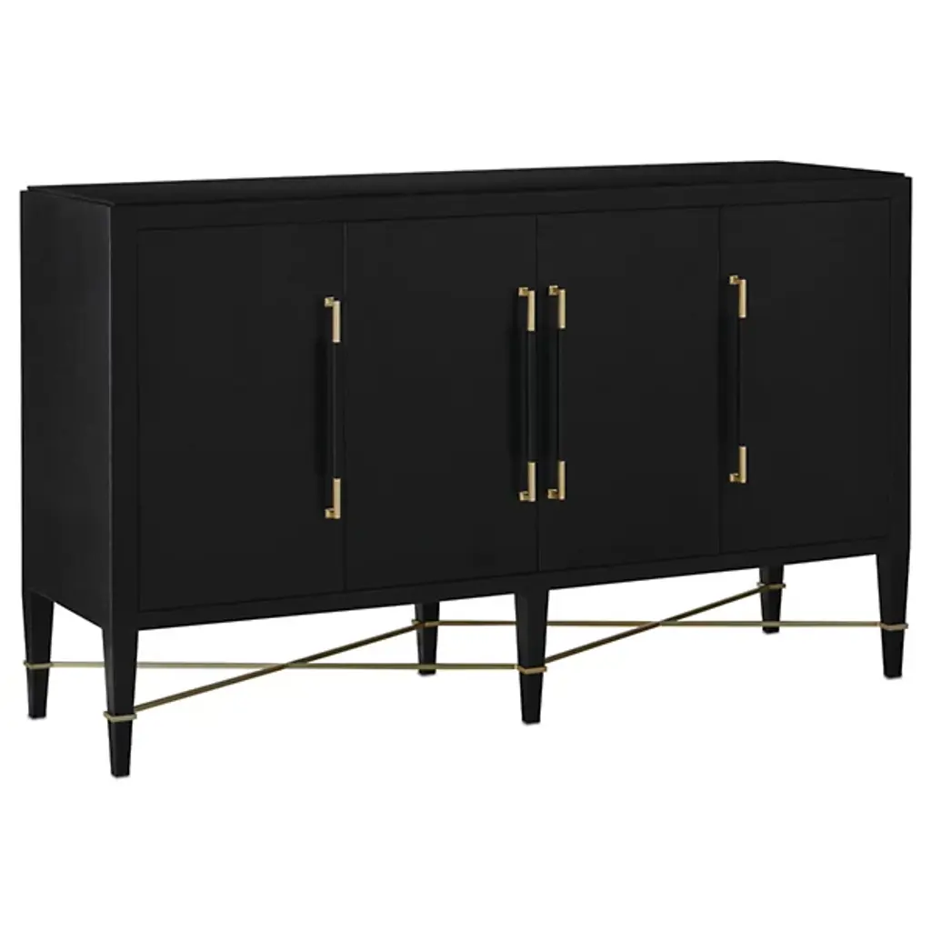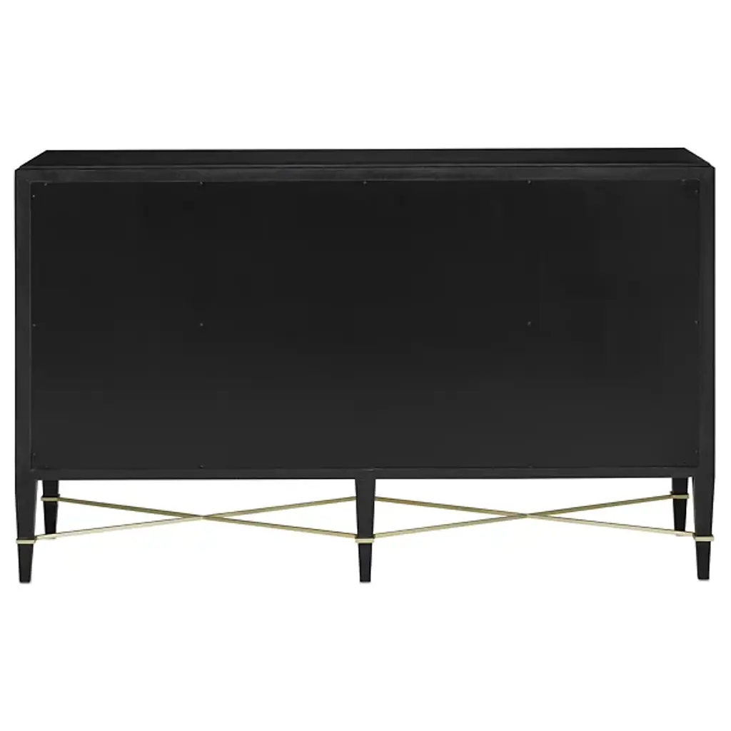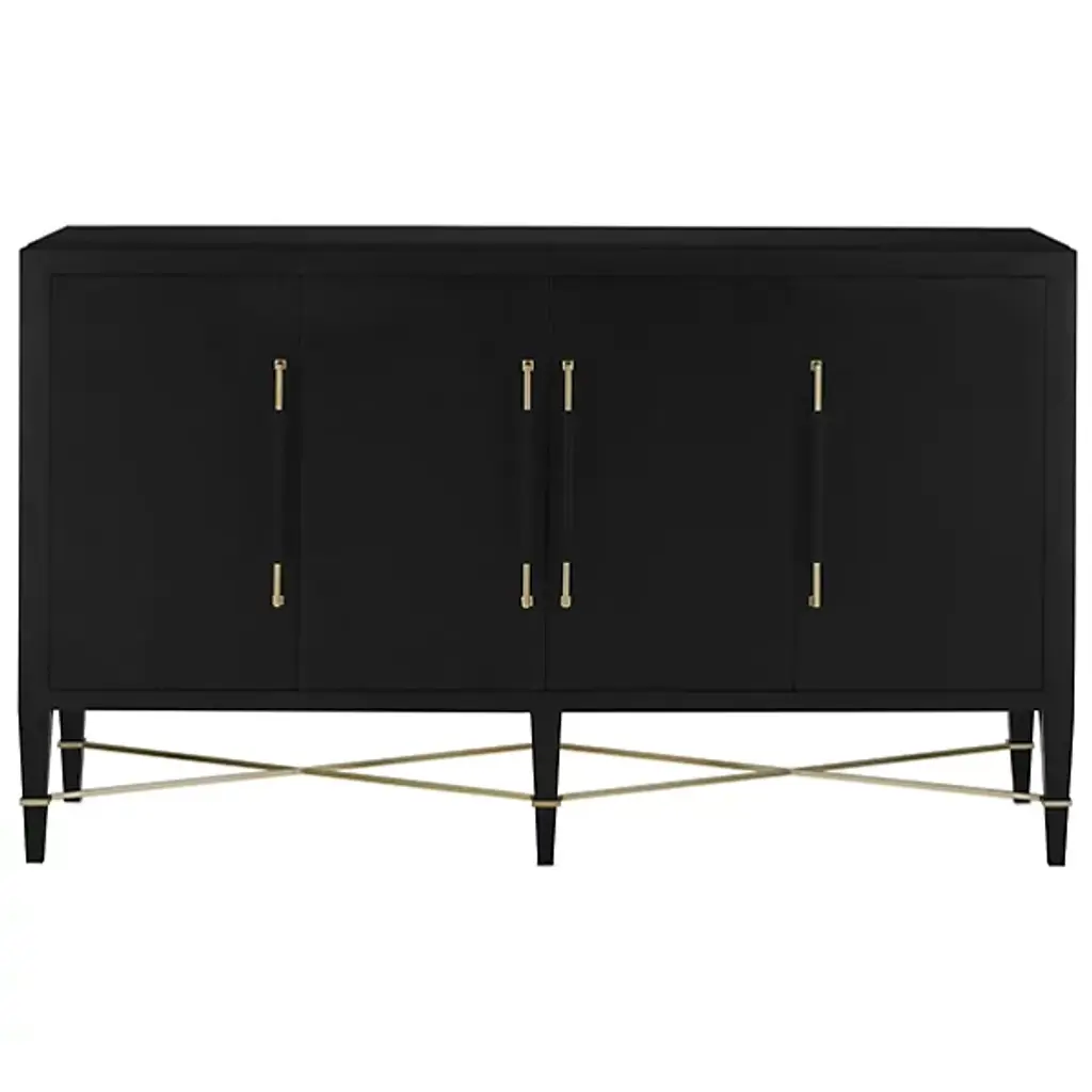 Exuding a captivating allure, the Verona Sideboard from Currey & Company boasts a sleek and darkly handsome appearance enveloped in a lustrous lacquer. The exquisite metal accents in a beautiful finish elevate the sideboard's elegance, adding a touch of refinement. The minimalist design is further adorned with stylish stretchers that infuse a distinct flair, making this piece a statement of both sophistication and contemporary aesthetics.