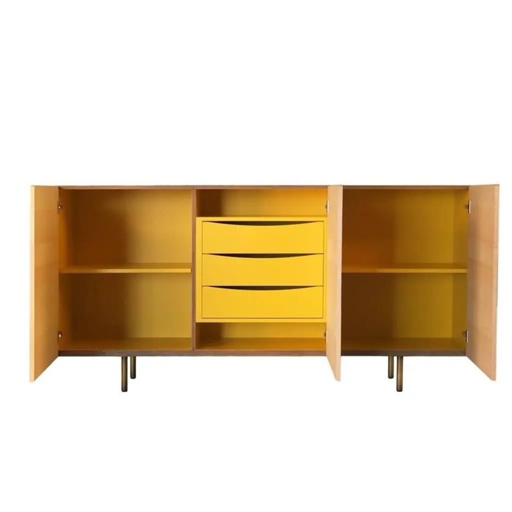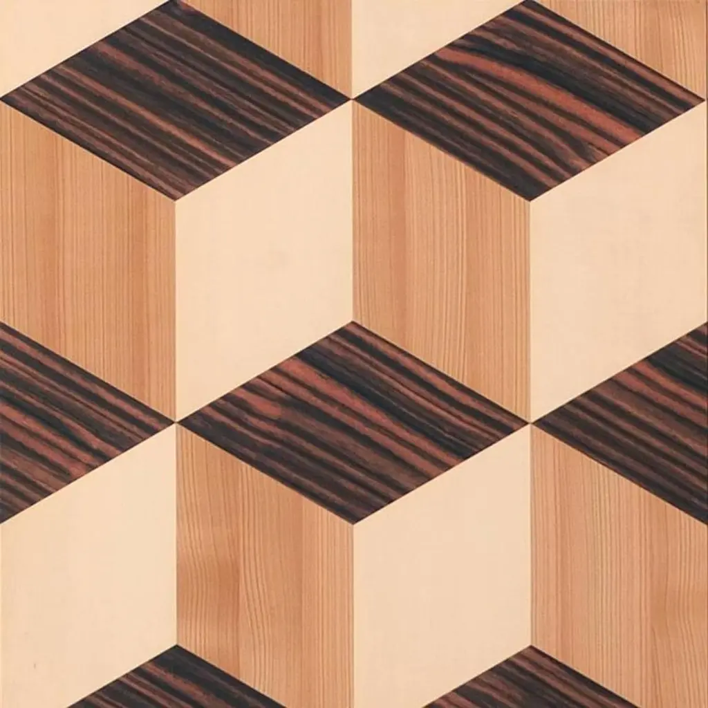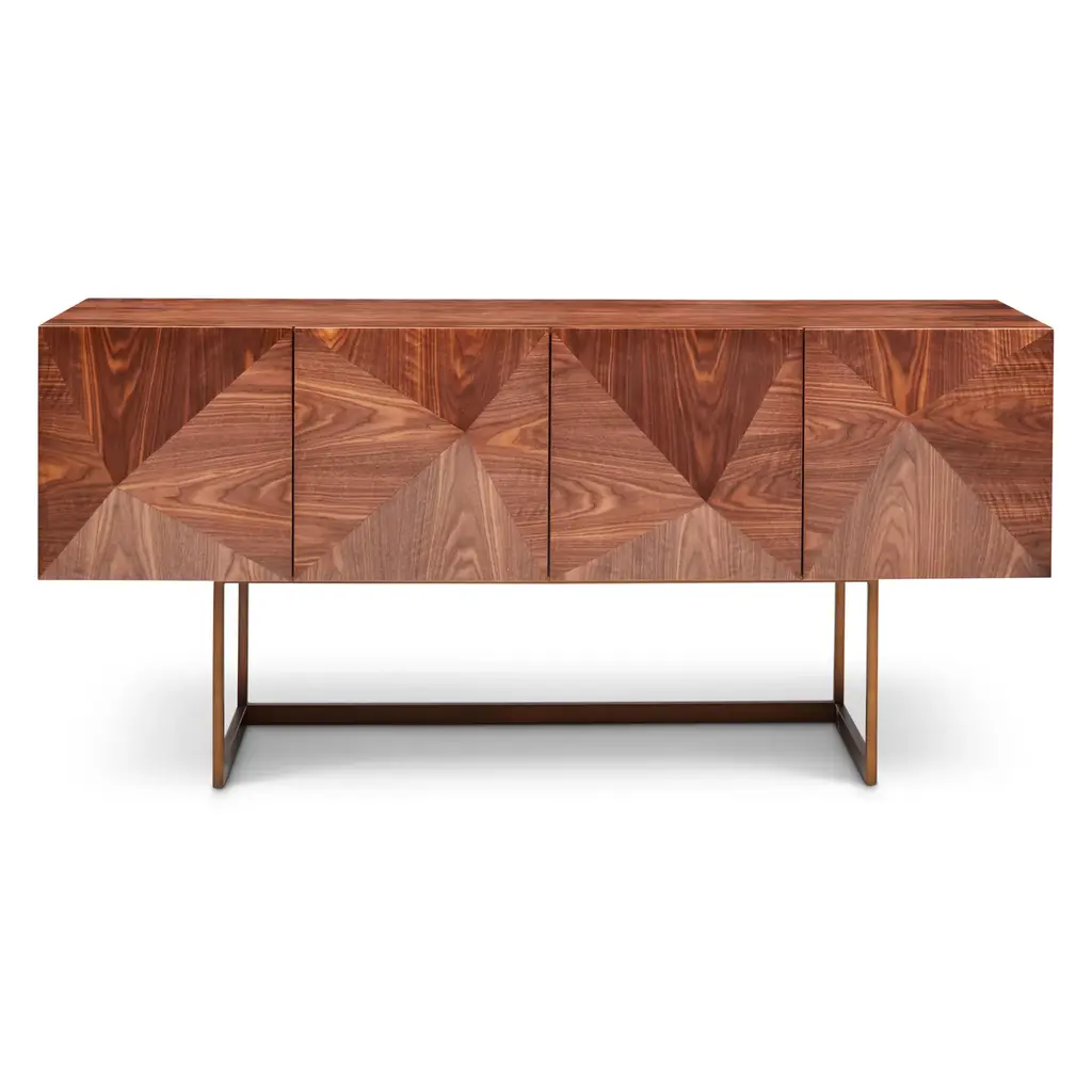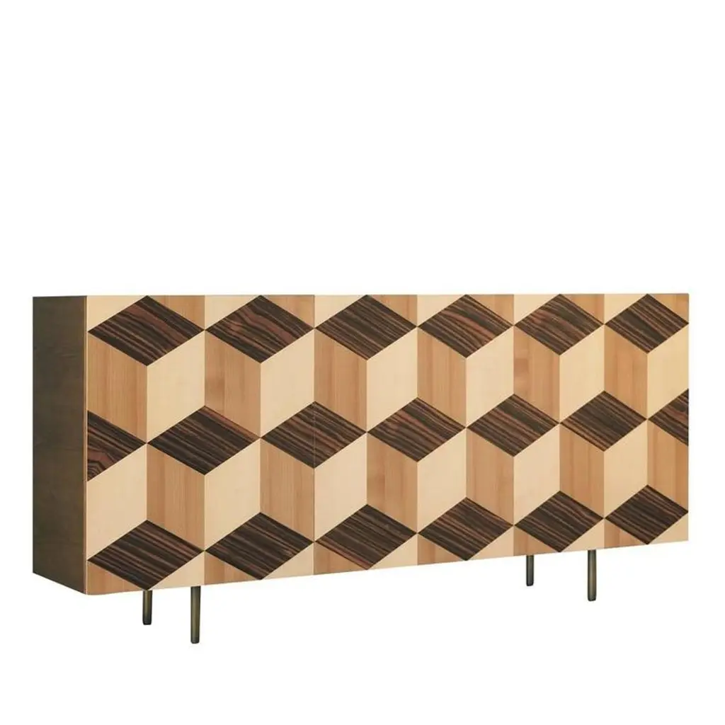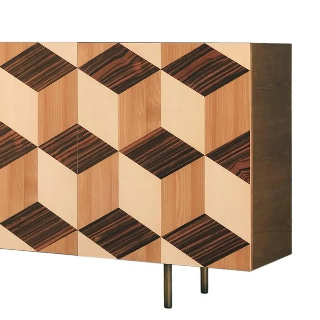 Designed by the MAAM, (the museum of art and furnishing with which Morelato collaborates, promoting an international competition for young designers and each year developing prototypes of great interest), this sideboard is made of different wood types to create the visually striking cubic perspective of the front panels, reminiscent of the Renaissance art. Inside, the central space is equipped with three drawers, while outside the brass feet add sophistication and a modern touch.