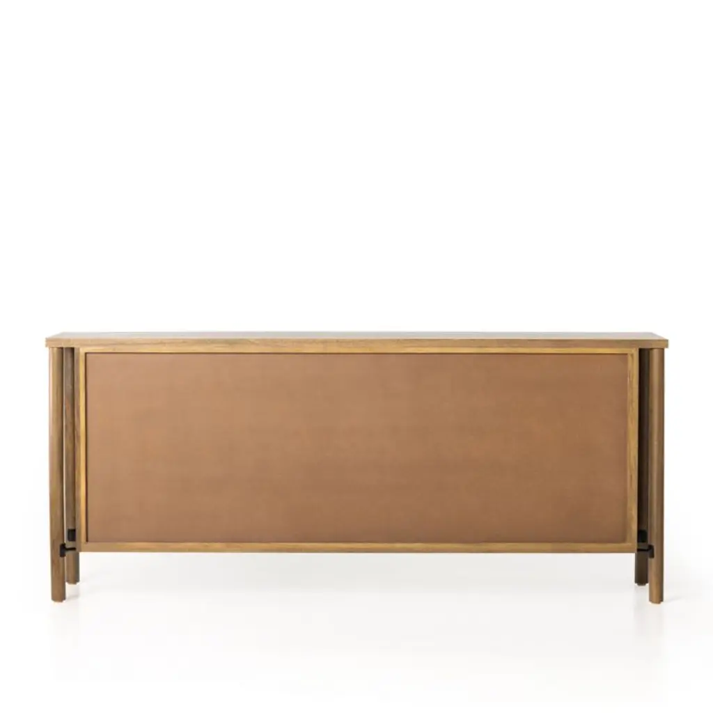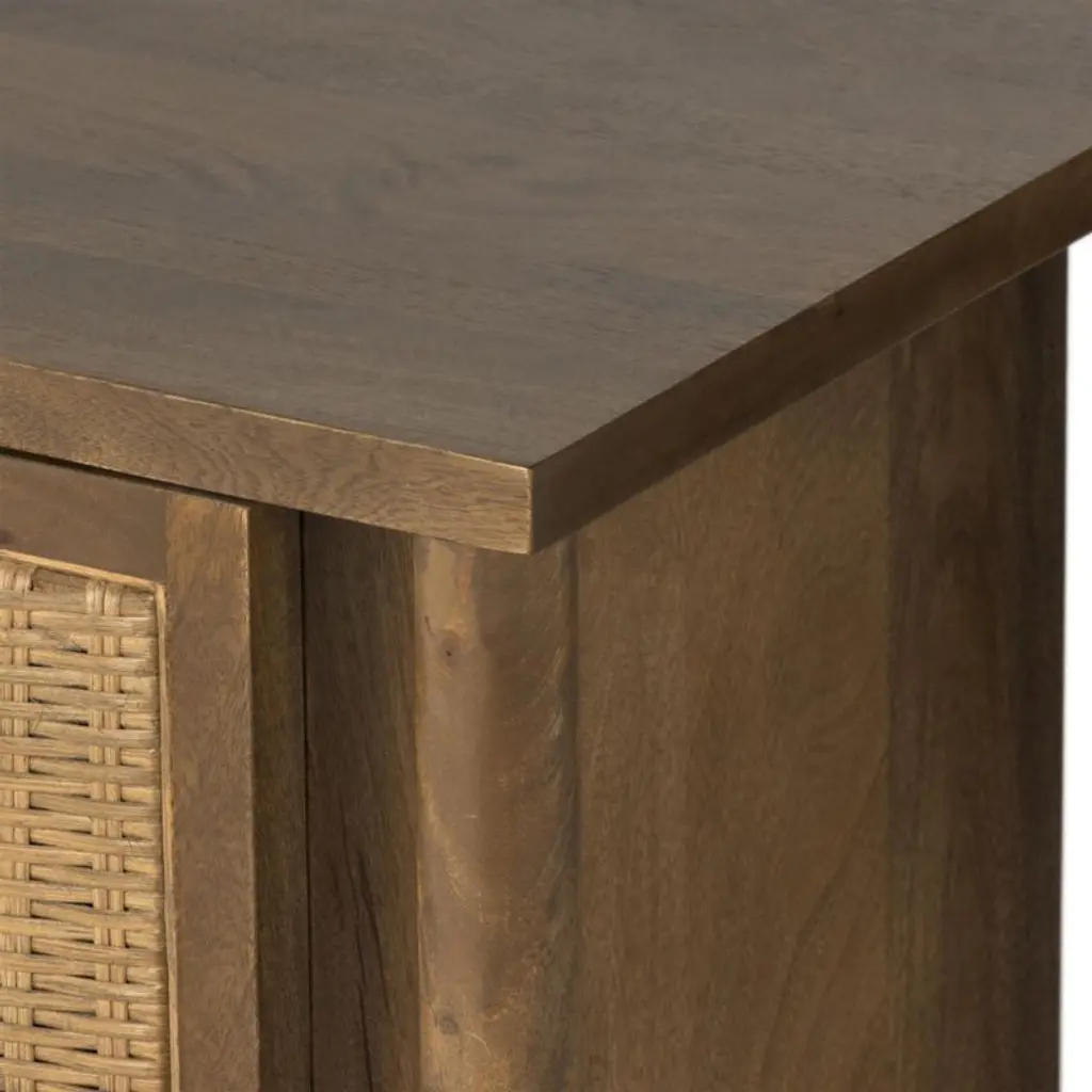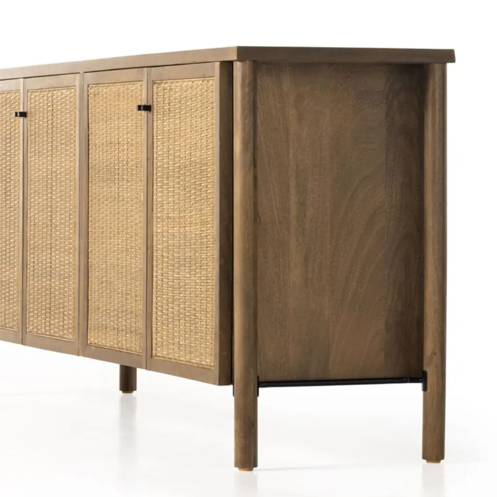 Veta satisfies our love of cane and wood with clean lines and lots of storage. Crafted of solid mango wood from trees no longer producing fruit, the credenza features a suite of cabinet doors inset with panels of basket-woven cane. Dowel legs set off from the casing give the sideboard a floating appearance while highlighting the wood grain on solid side panels. Inside, two adjustable shelves provide plenty of space for storing dining or living room essentials.